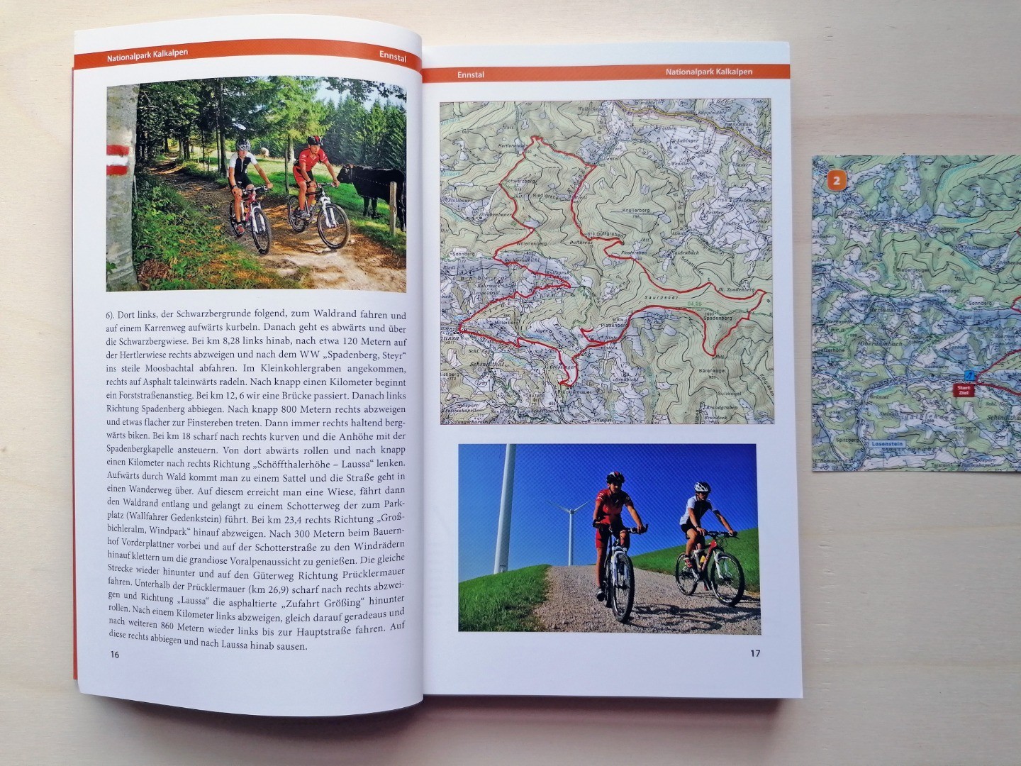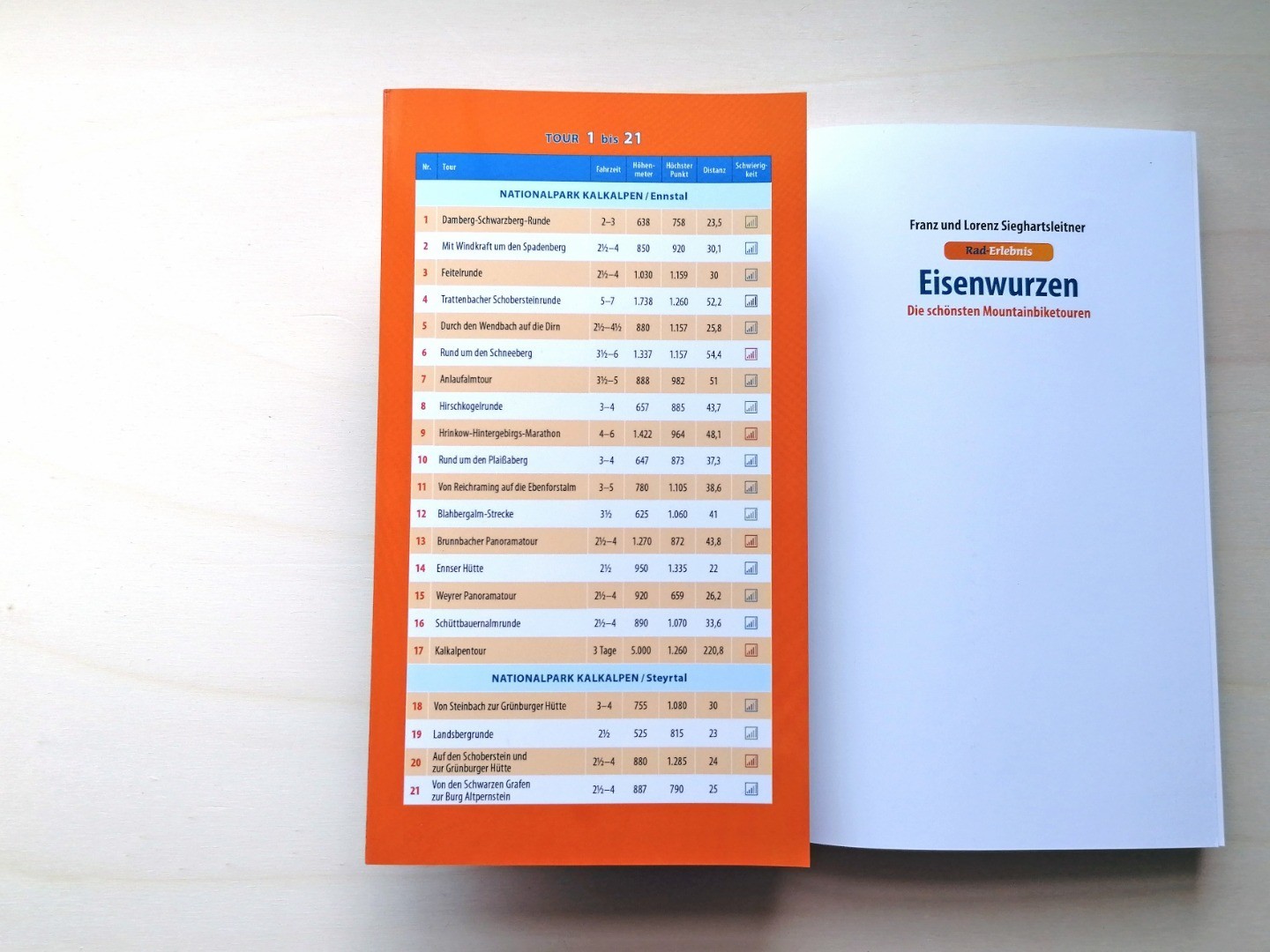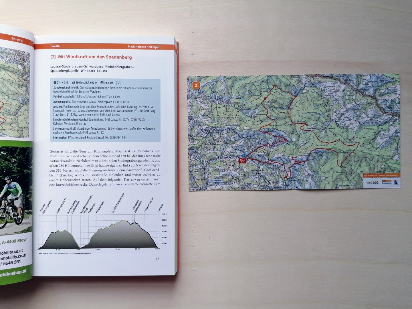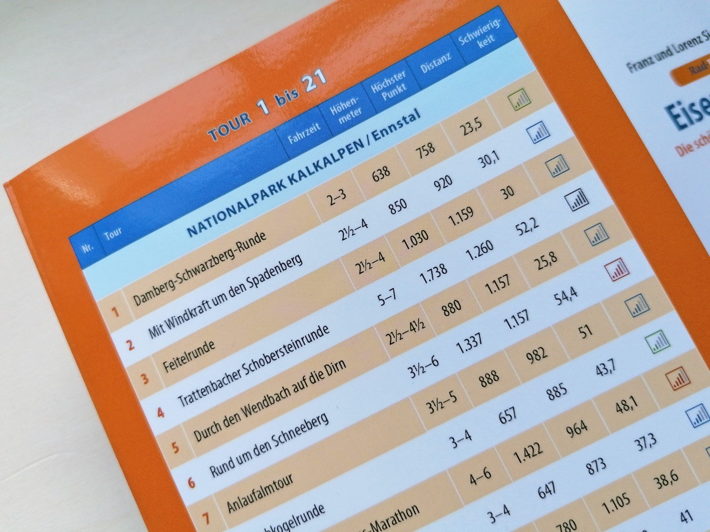 Besonders praxistauglich finde ich den Umschlag samt Flappe: Hier findet der motivierte Biker auf einen Blick alle Touren samt Angabe der Fahrzeit, Höhenmeter, Höhenlage, Kilometer und Schwierigkeitsgrad, gegliedert nach Ennstal, Steyrtal und Mostviertel. Diese Darstellung erlaubt mir eine rasche Einschätzung der Route. So kann ich auch spontan eine neue Strecke nach Lust, Laune und Kondition herausfiltern.