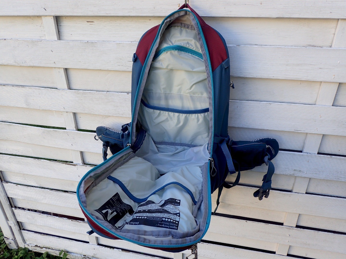- 1 Bodenfach, das mittels Innenboden zum Hauptfach hin geöffnet werden kann: Hier finden Hüttenschuhe und Regenbekleidung Platz. (So muss ich, wenn es bereits regnet, nicht das sauber sortierte Hauptfach mit der anderen Bekleidung öffnen)