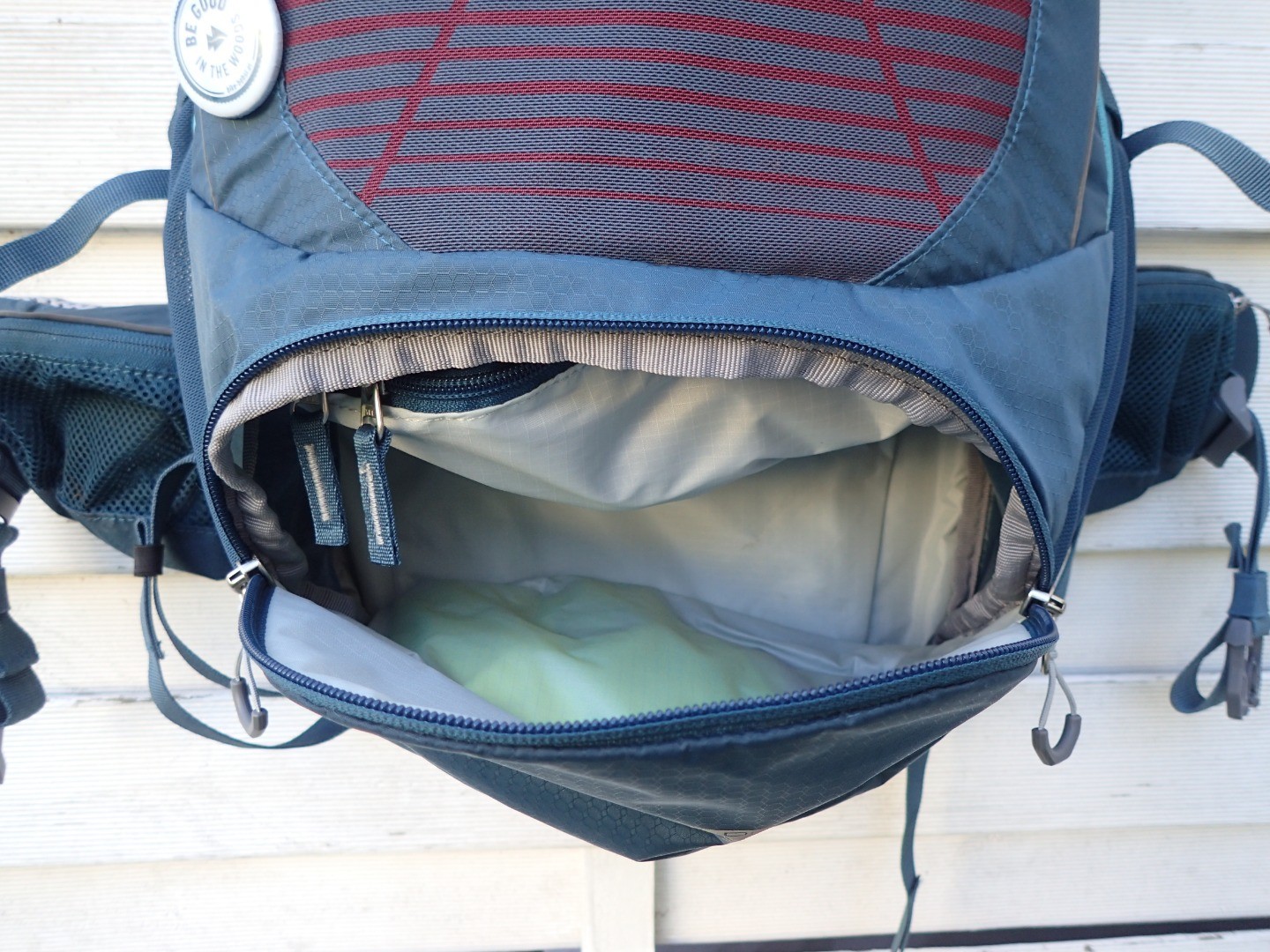 - 1 Trinkblasenfach, das auch anderweitig genutzt werden kann inkl. einem kleinen Reißverschlussfach: Beinlinge, Armlinge und Ersatzspeichen, weil im steifen Rückenfach Speichen am wenigsten verbogen werden