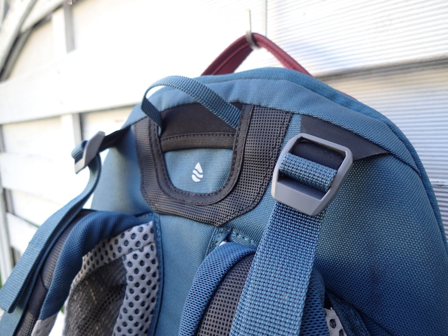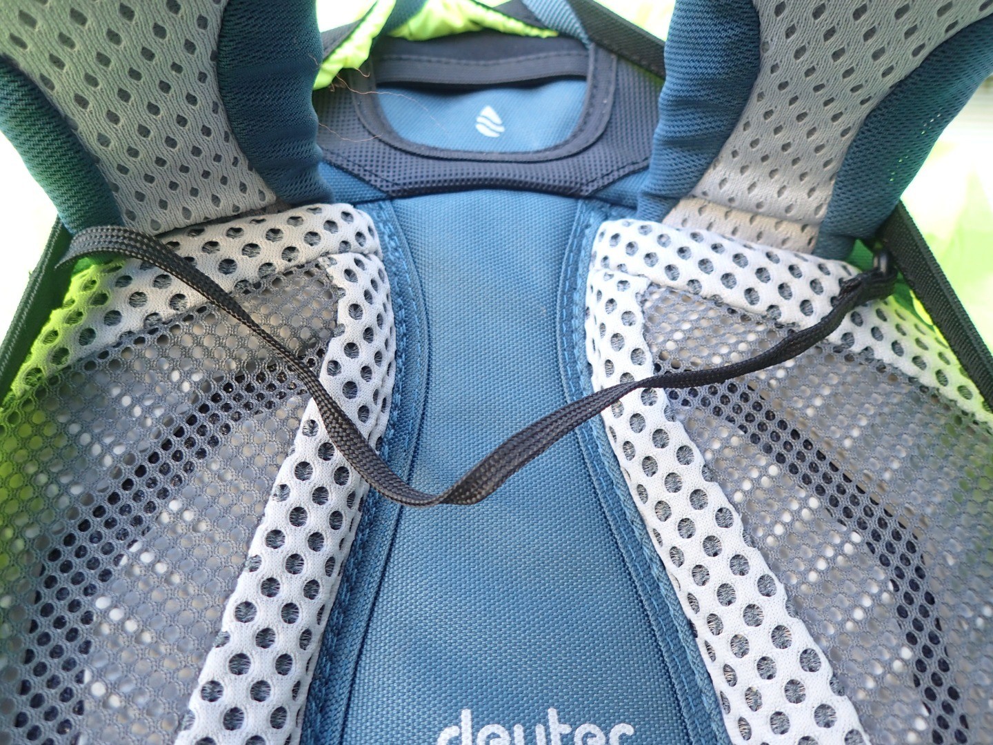 Damit die Regenhülle nicht unabsichtlich abgestreift werden kann, nutzt Deuter hier eine kleine Schnur zum Einhaken, die einfach am Rückenteil quer rüber gespannt wird.