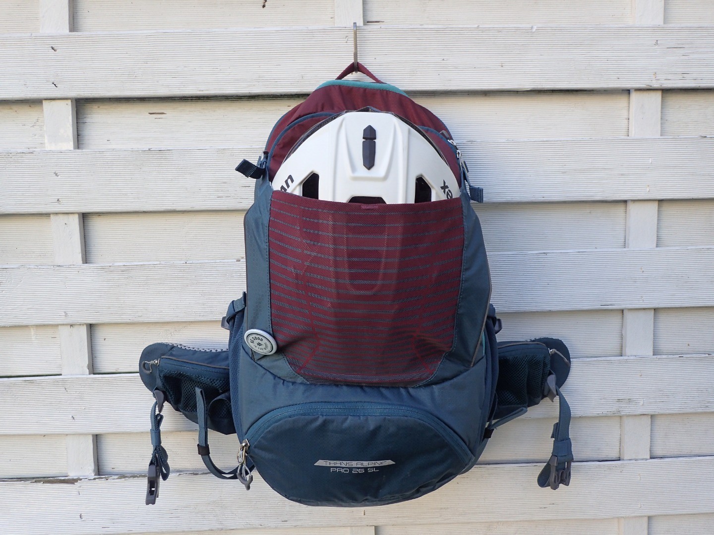 - Die Helmhalterung außen am Rucksack ist sehr dezent und kann als eine Art „offenes Trockenfach“ genutzt werden.