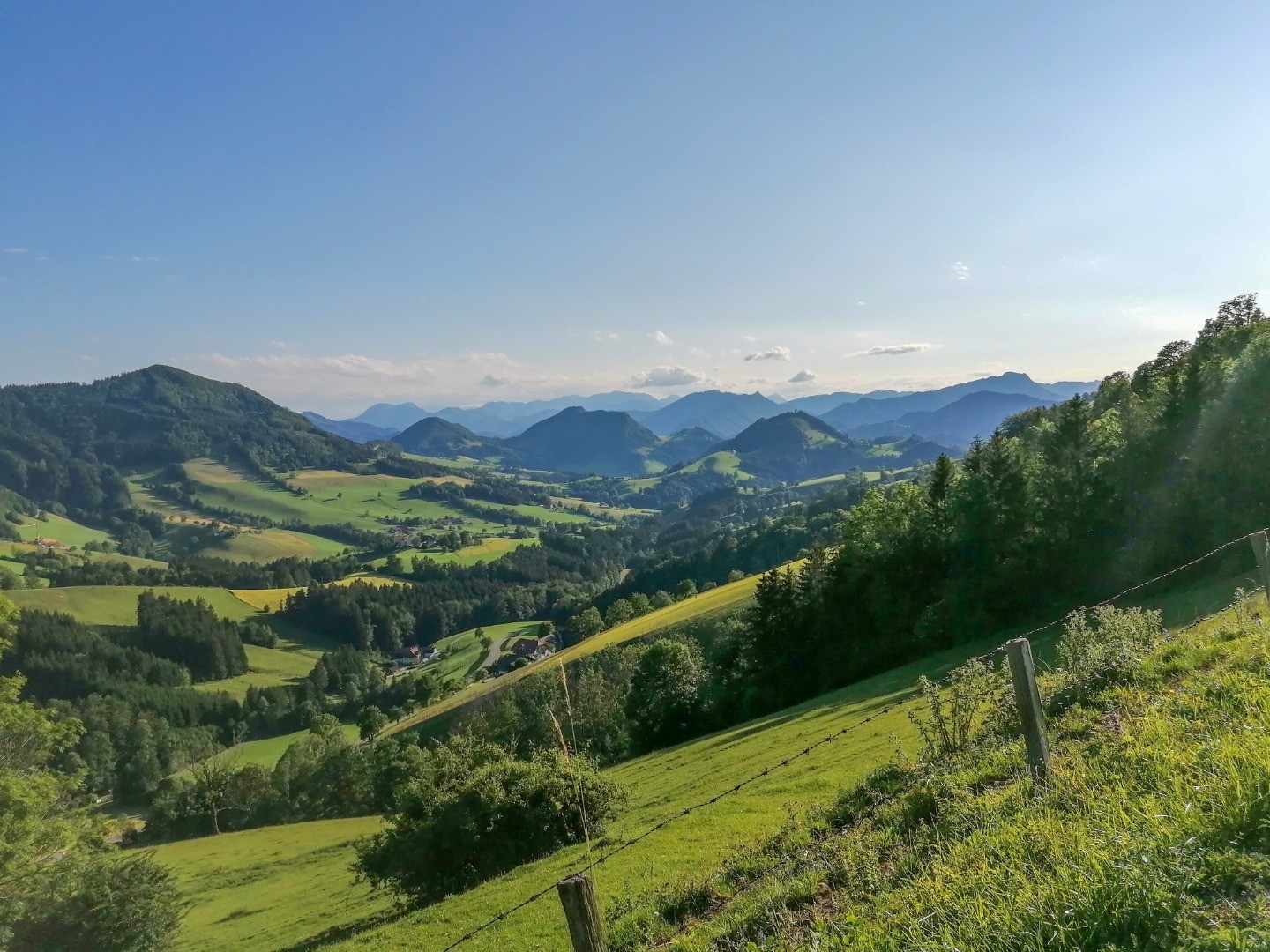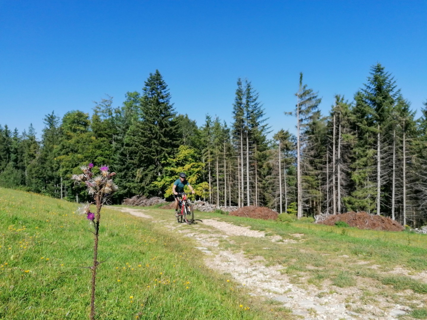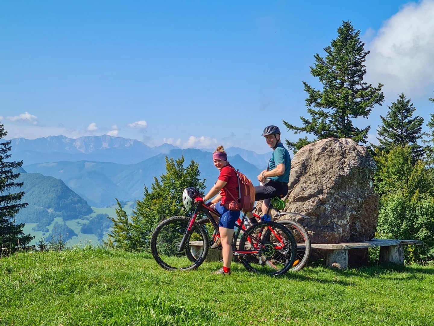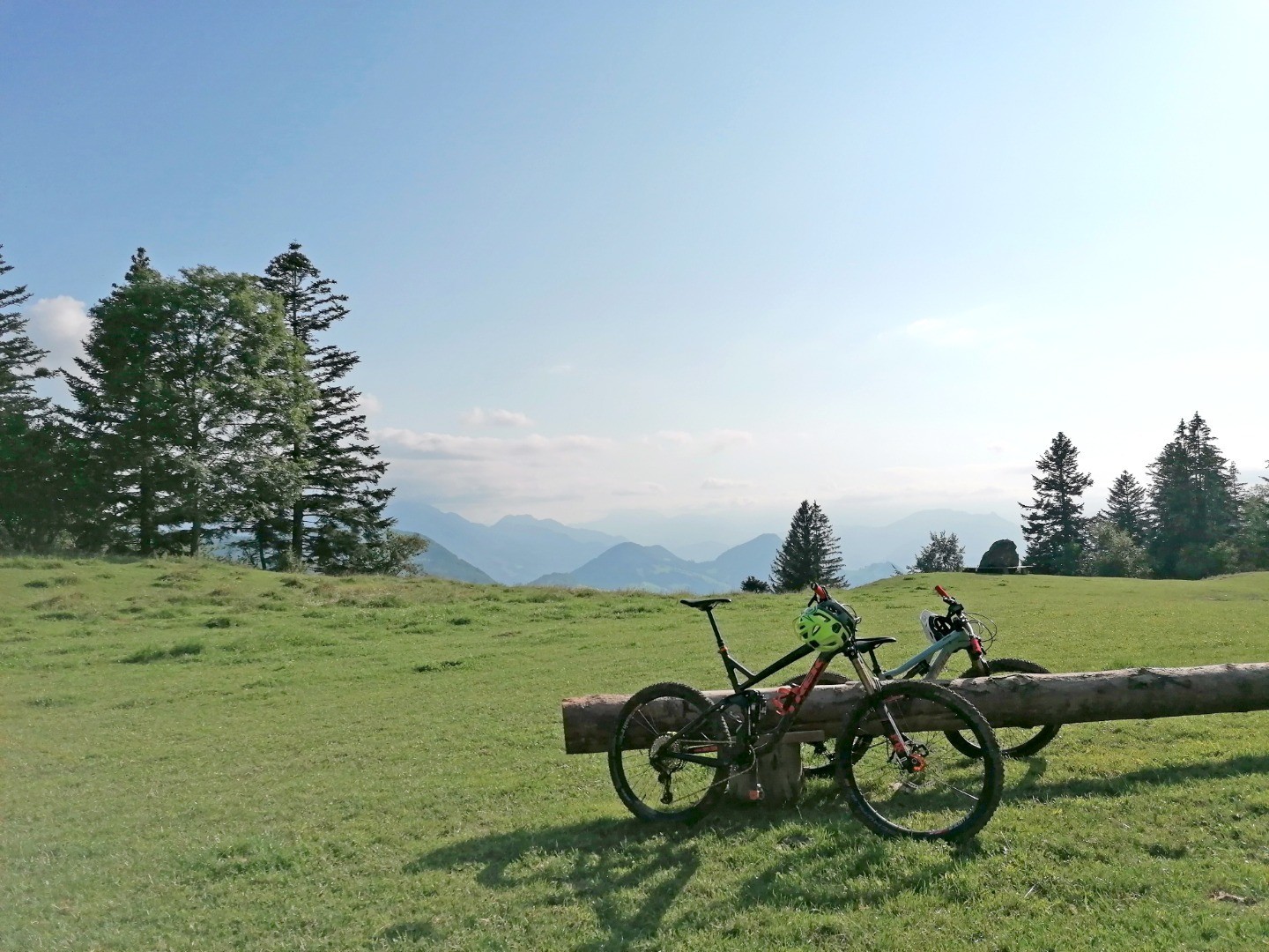 Die Bikes lehnen entspannt am Holzpfahl, während wir zu Fuß die letzten Meter zum Gipfelkreuz in Angriff nehmen (striktes Fahrverbot!). Während wir davor ins Ennstal schweifen konnte, lichtet sich hier an klaren Tagen der Blick übers Mostviertel bis hin zum Donauraum.