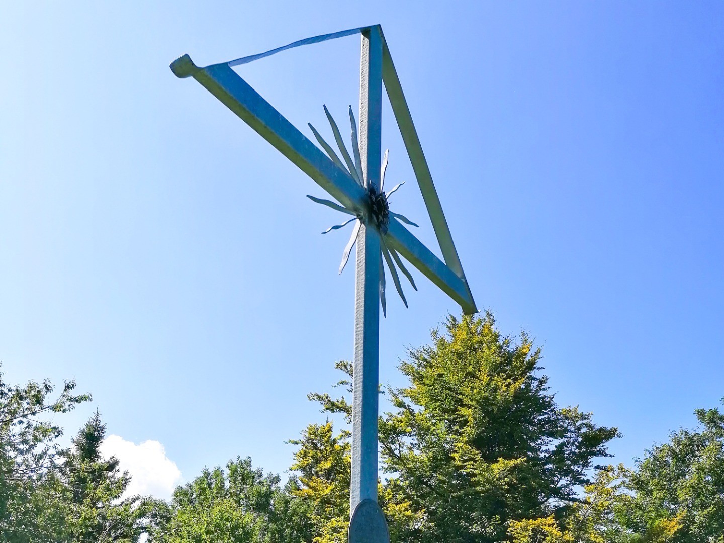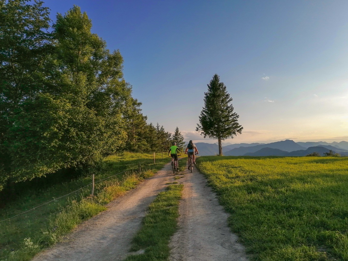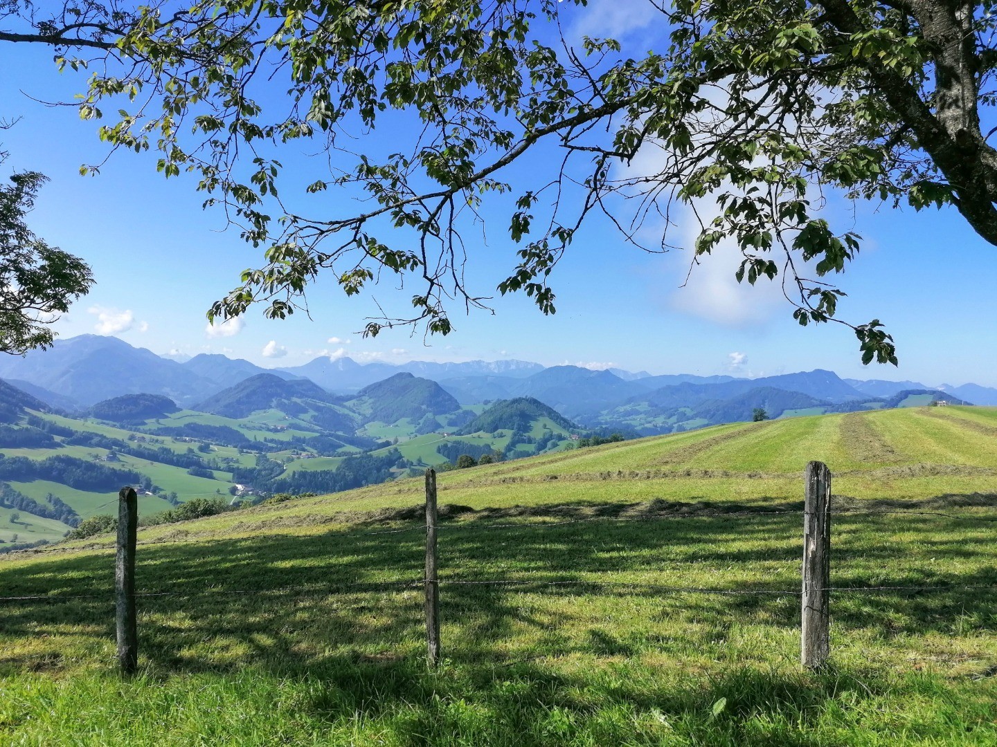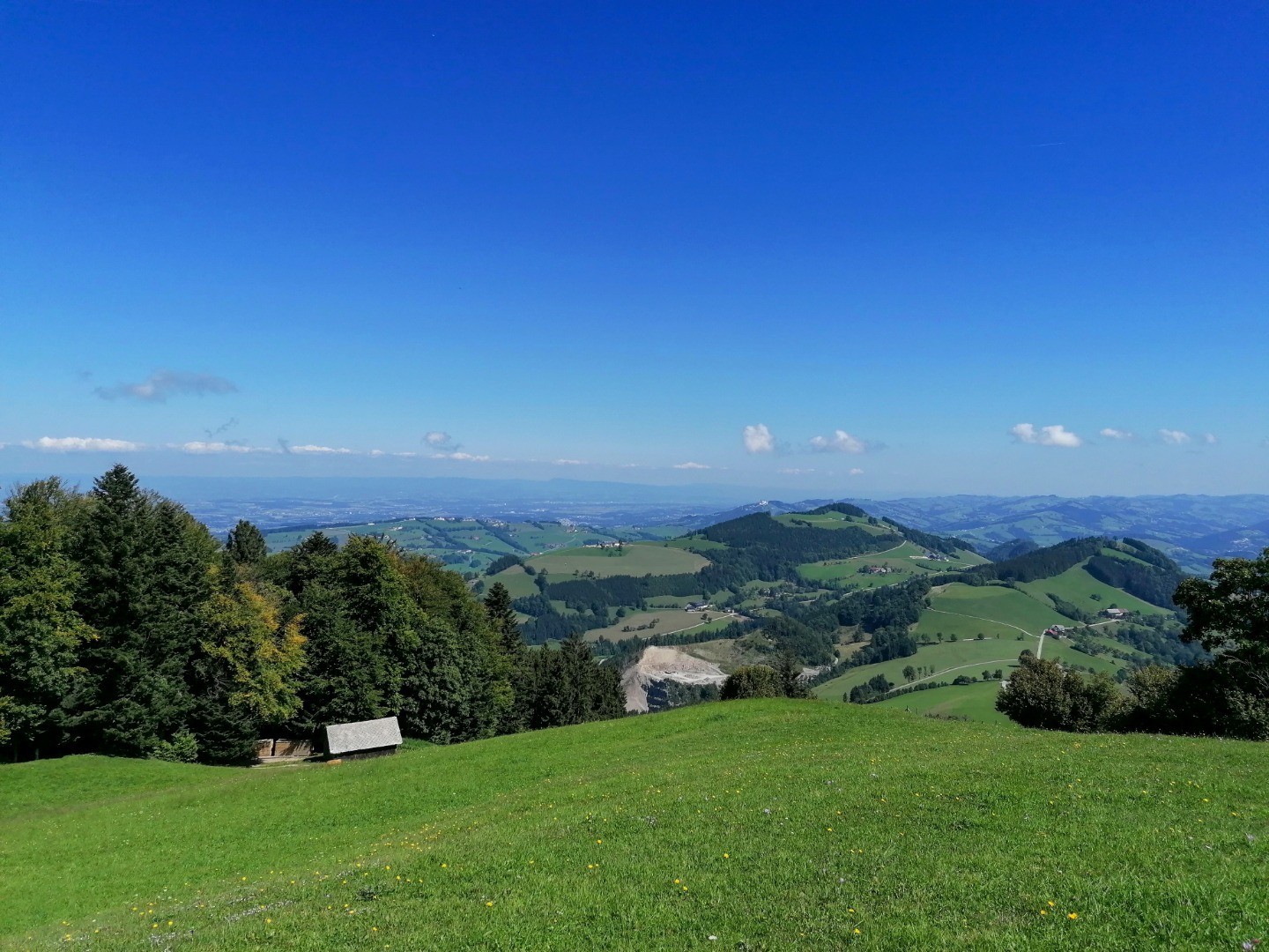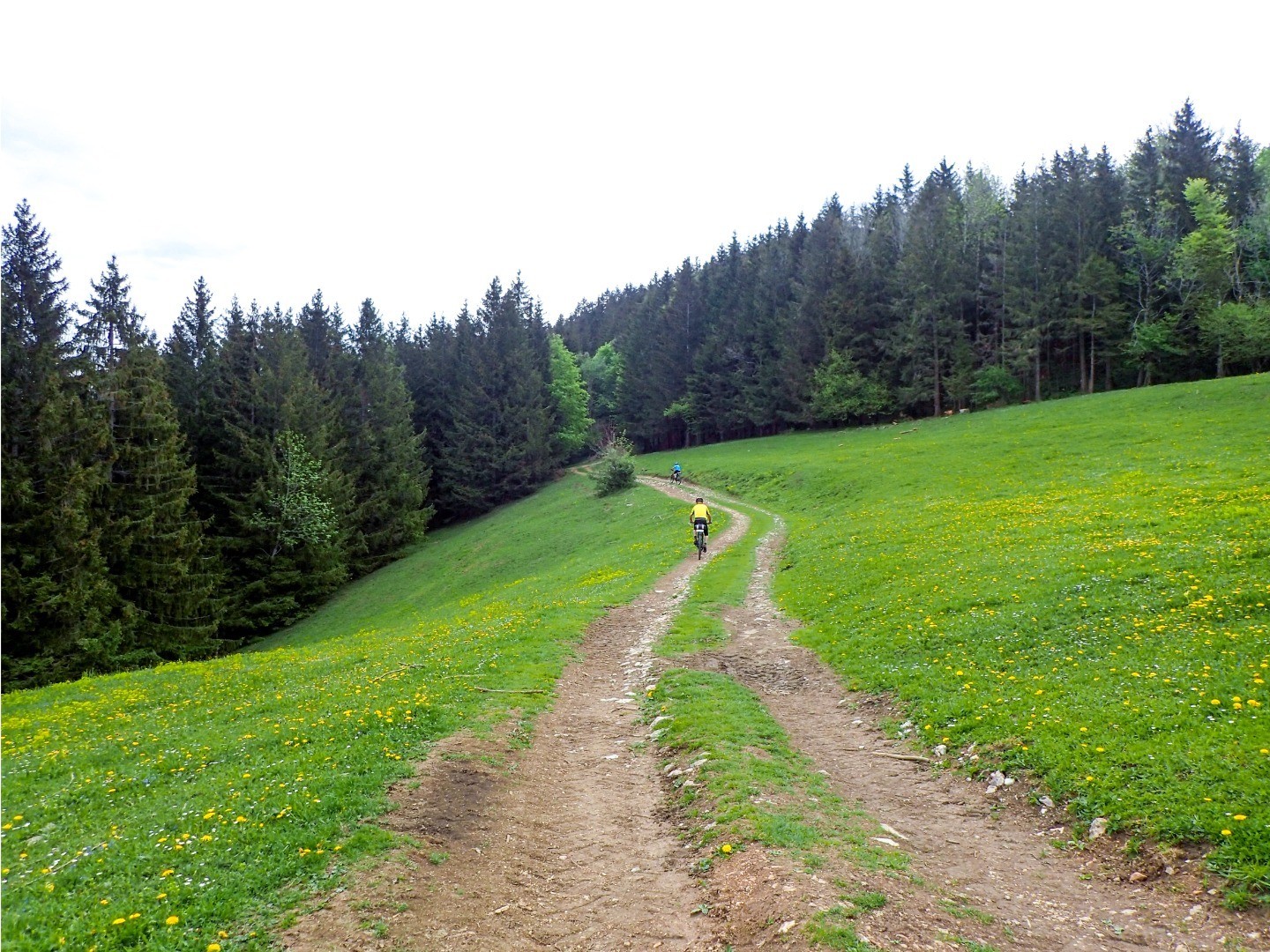Die Bikes lehnen entspannt am Holzpfahl, während wir zu Fuß die letzten Meter zum Gipfelkreuz in Angriff nehmen (striktes Fahrverbot!). Während wir davor ins Ennstal schweifen konnte, lichtet sich hier an klaren Tagen der Blick übers Mostviertel bis hin zum Donauraum.
