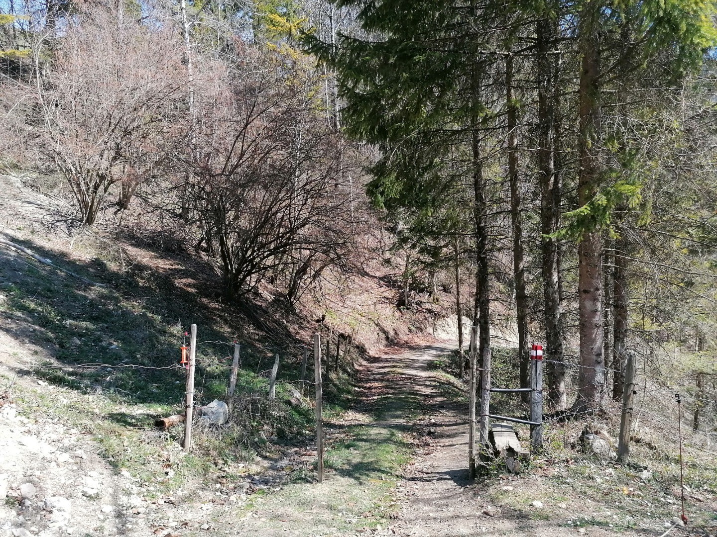 Wir folgen der Asphaltstraße stets geradeaus, bis wir am Ende der asphaltierten Straße über eine Weide Kurs auf ein kleinen Waldstück nehmen – Weidezäune, Kühe und alles was dazugehört inklusive!