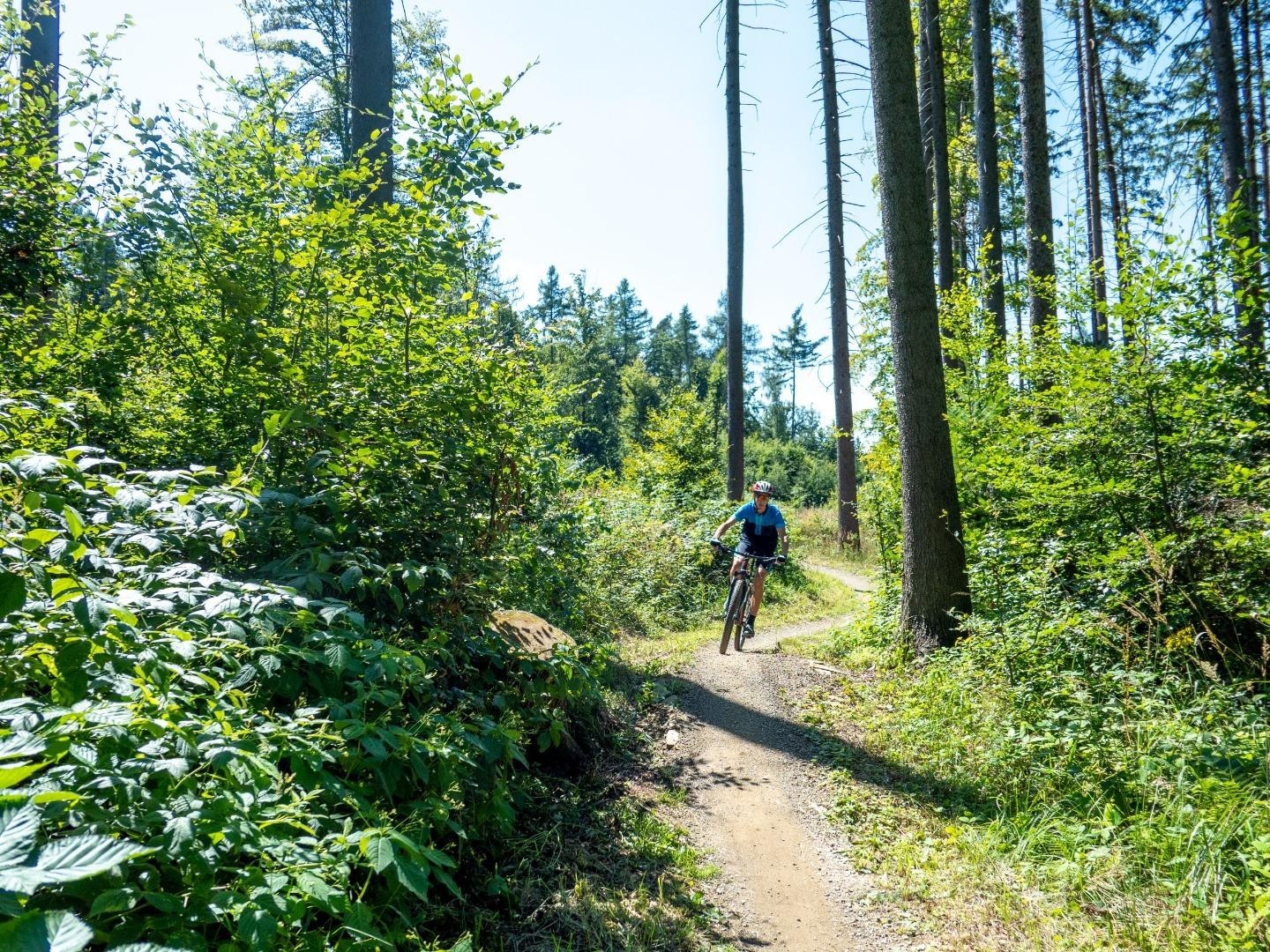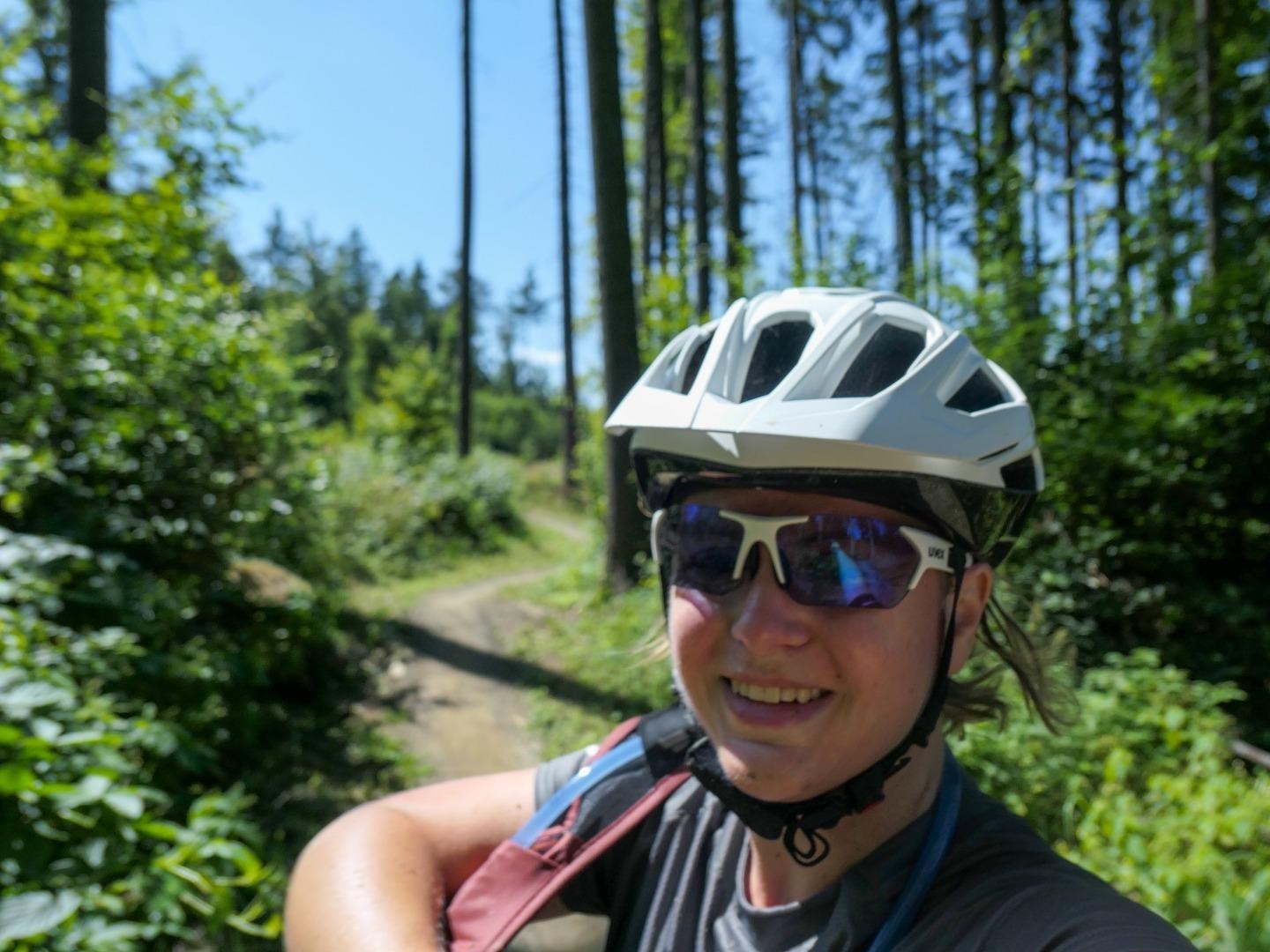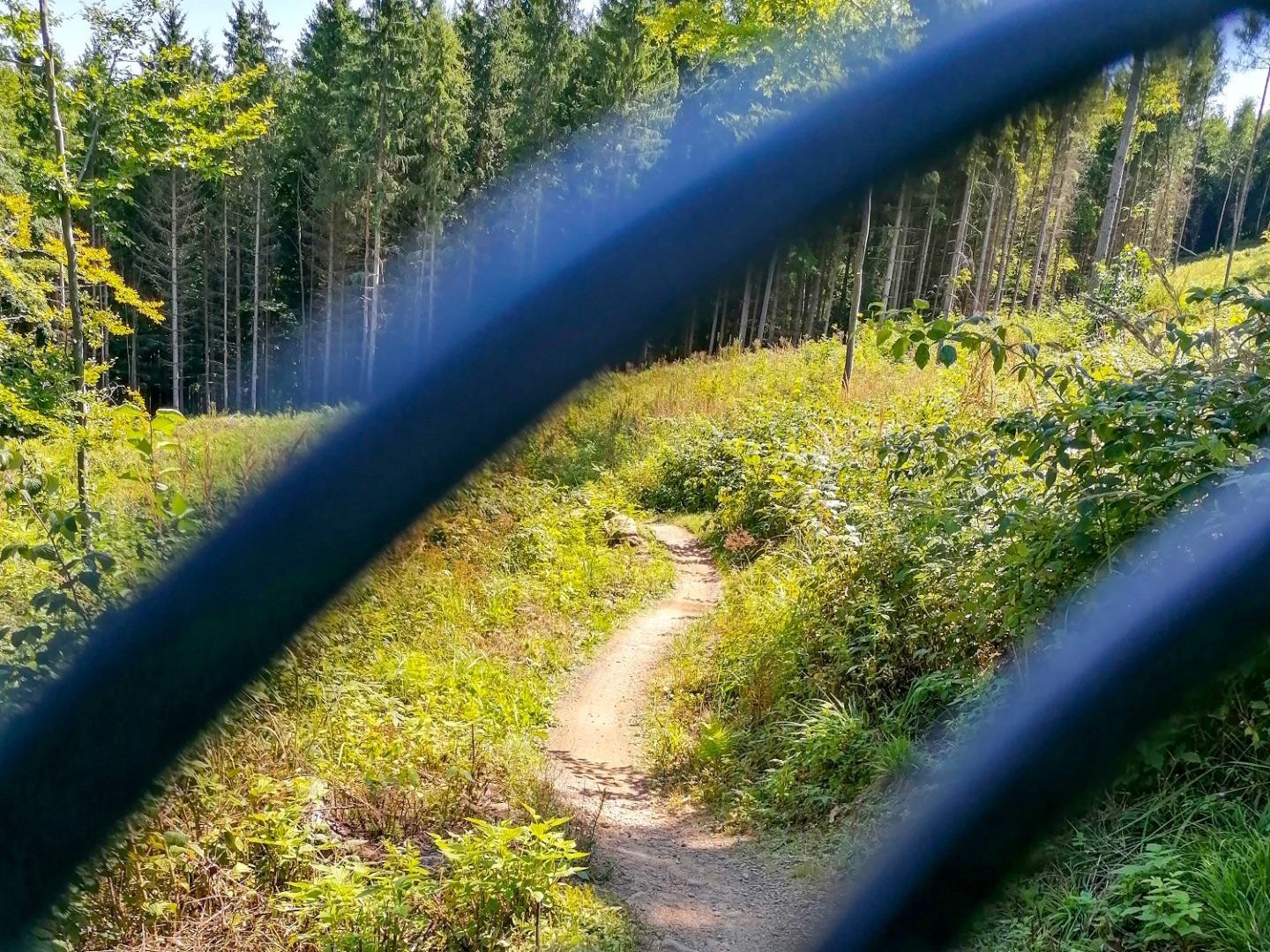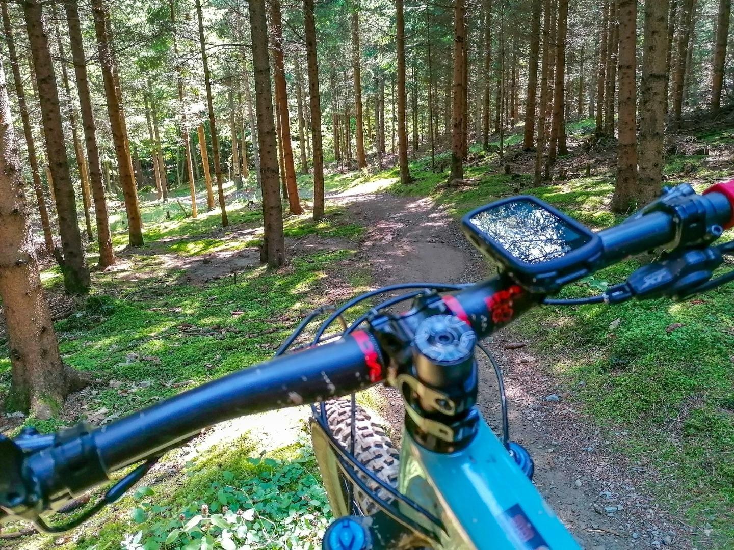 Ich starte also am Morgen mit Trail Nummer 1, dessen minimalistische Beschreibung auf flowige Passagen und fidele Hupferl hoffen lässt. Drei "Berge" werden in der digitalen Kurzbeschreibung angekündigt, die ich – abgesehen vom gemeinsamen Uphill zum Traileinstieg, im Auf und Ab des Waldes nicht mal bemerke.