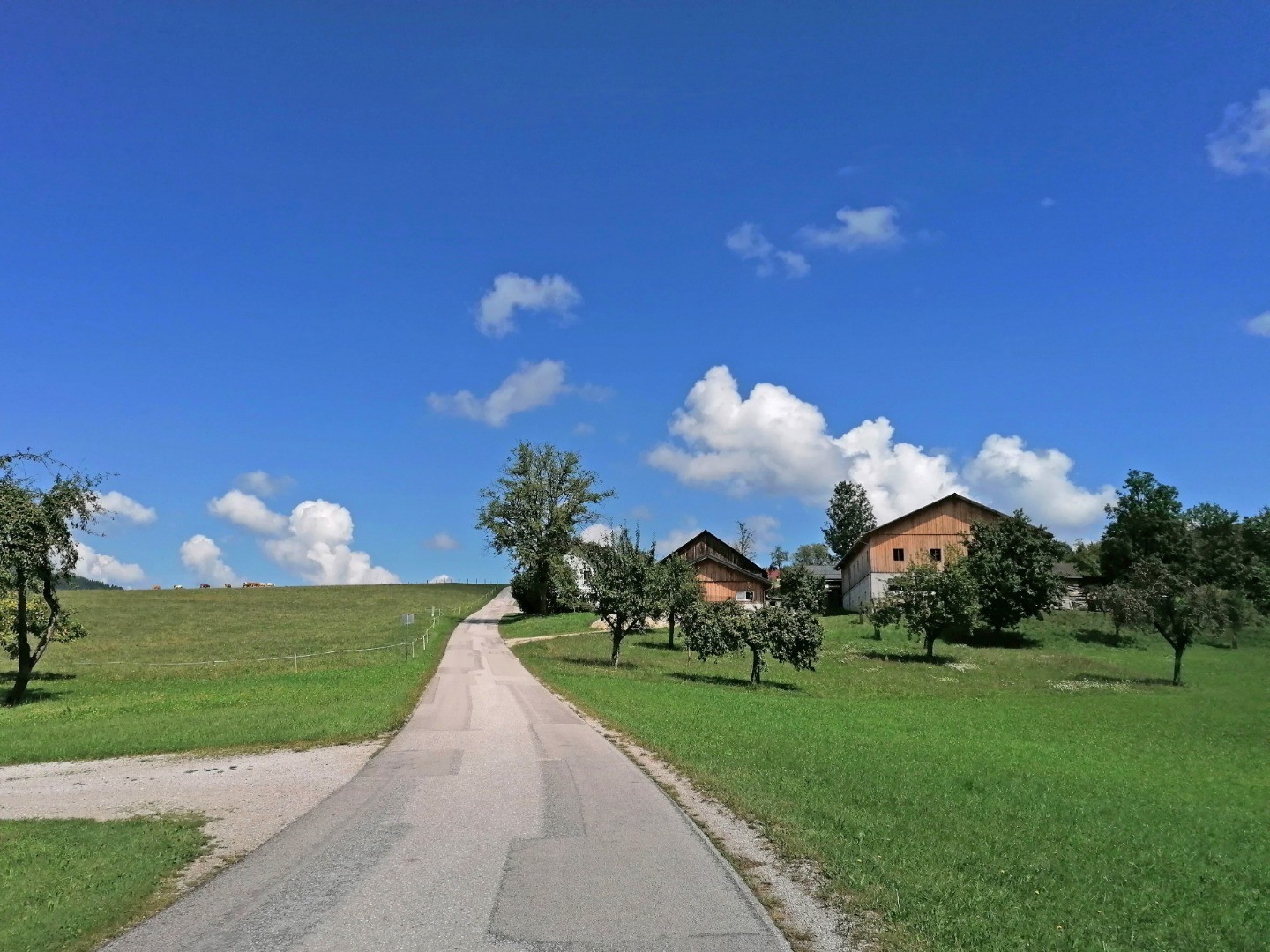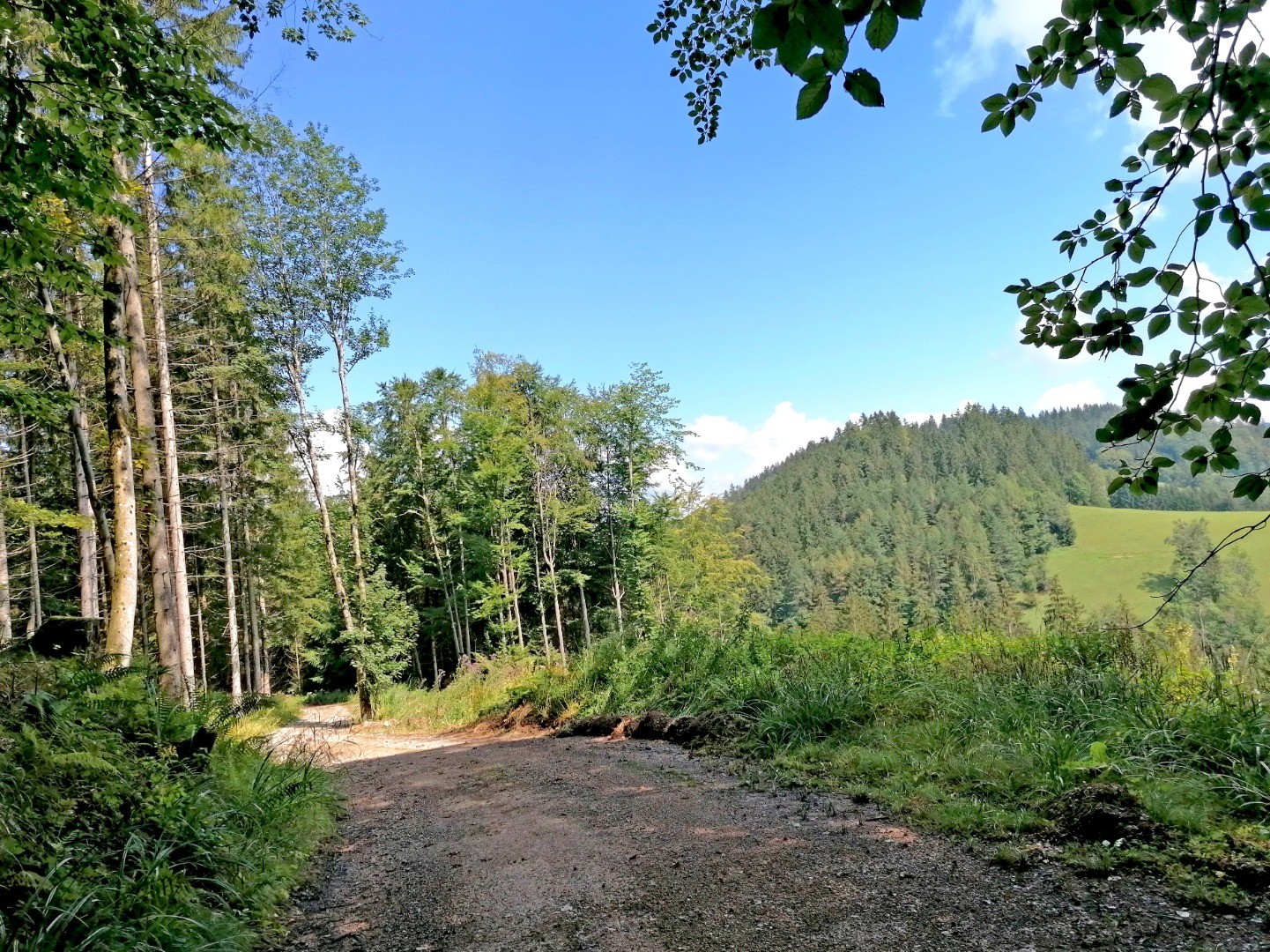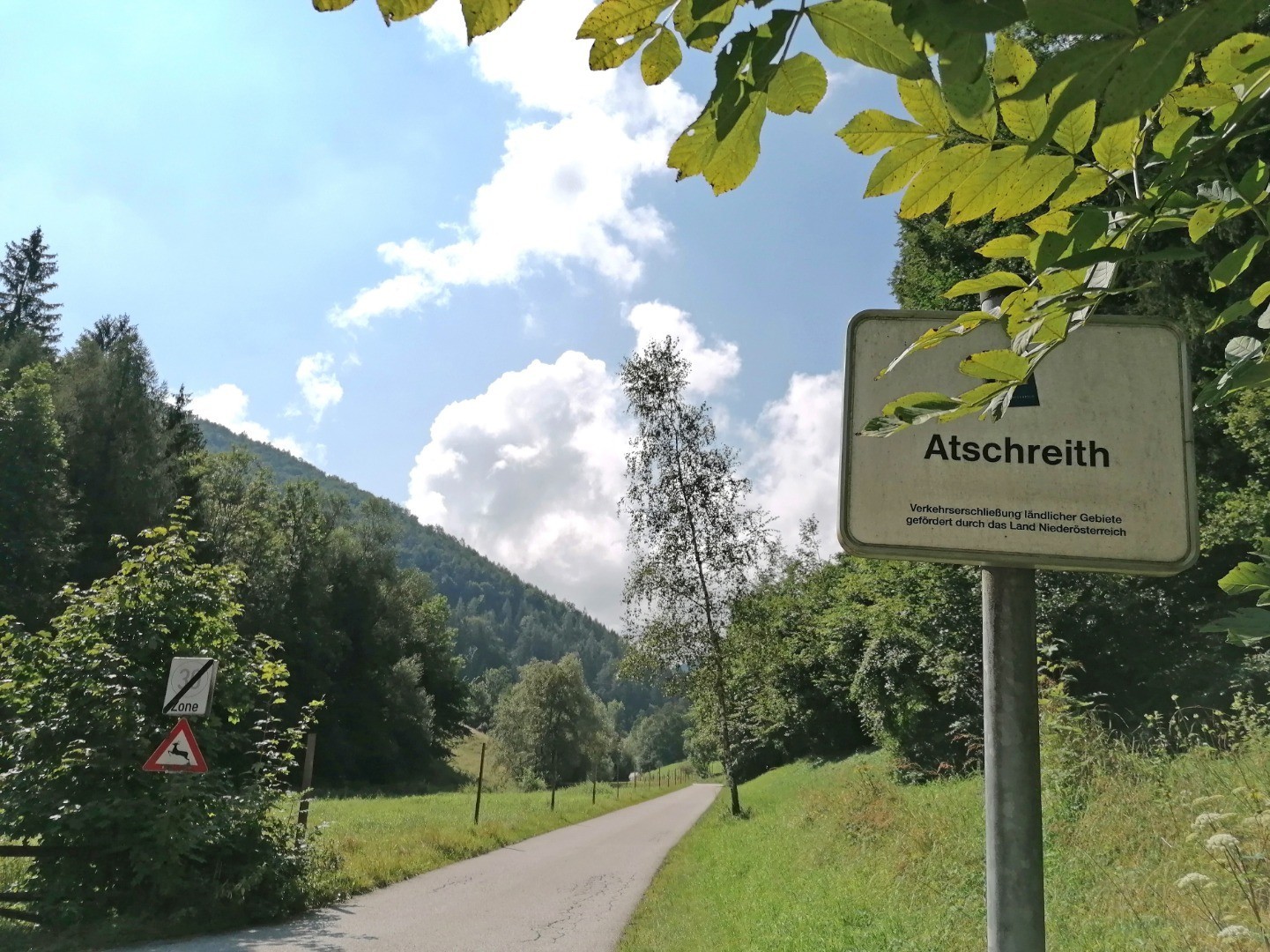 Bei der Pferdekoppel biegen wir links ein und folgen nun der Asphaltstraße bergauf. Die letzte S-Kurve kürzen wir ab und biegen gleich nach der Häusergruppe auf der rechten Straßenseite halbrechts in einen Schotterweg ein. Dieser führt uns steil und recht direkt zu den letzten Häusern auf der Atschreith.