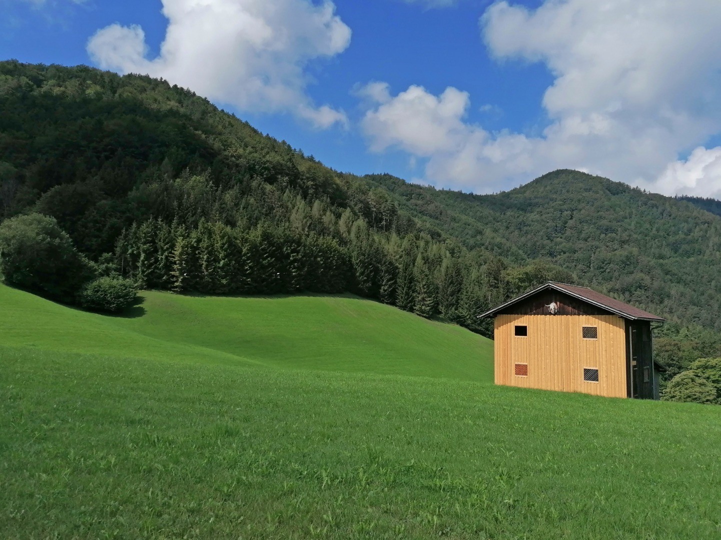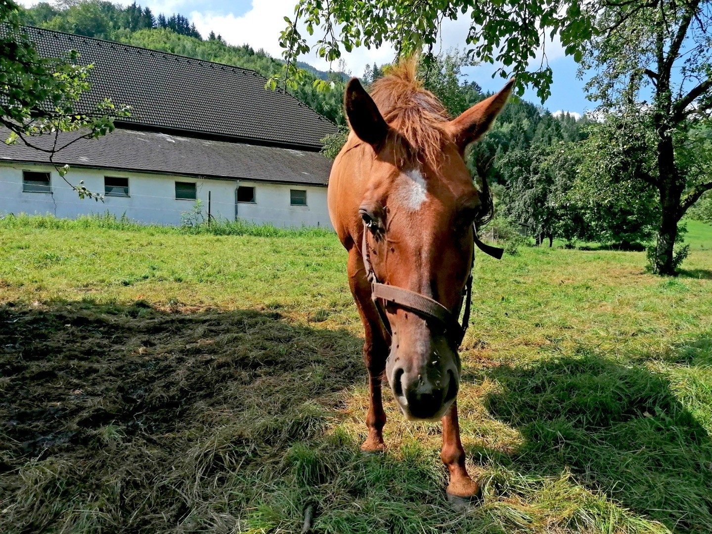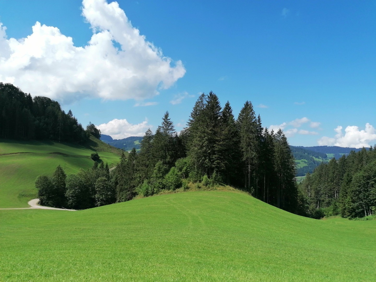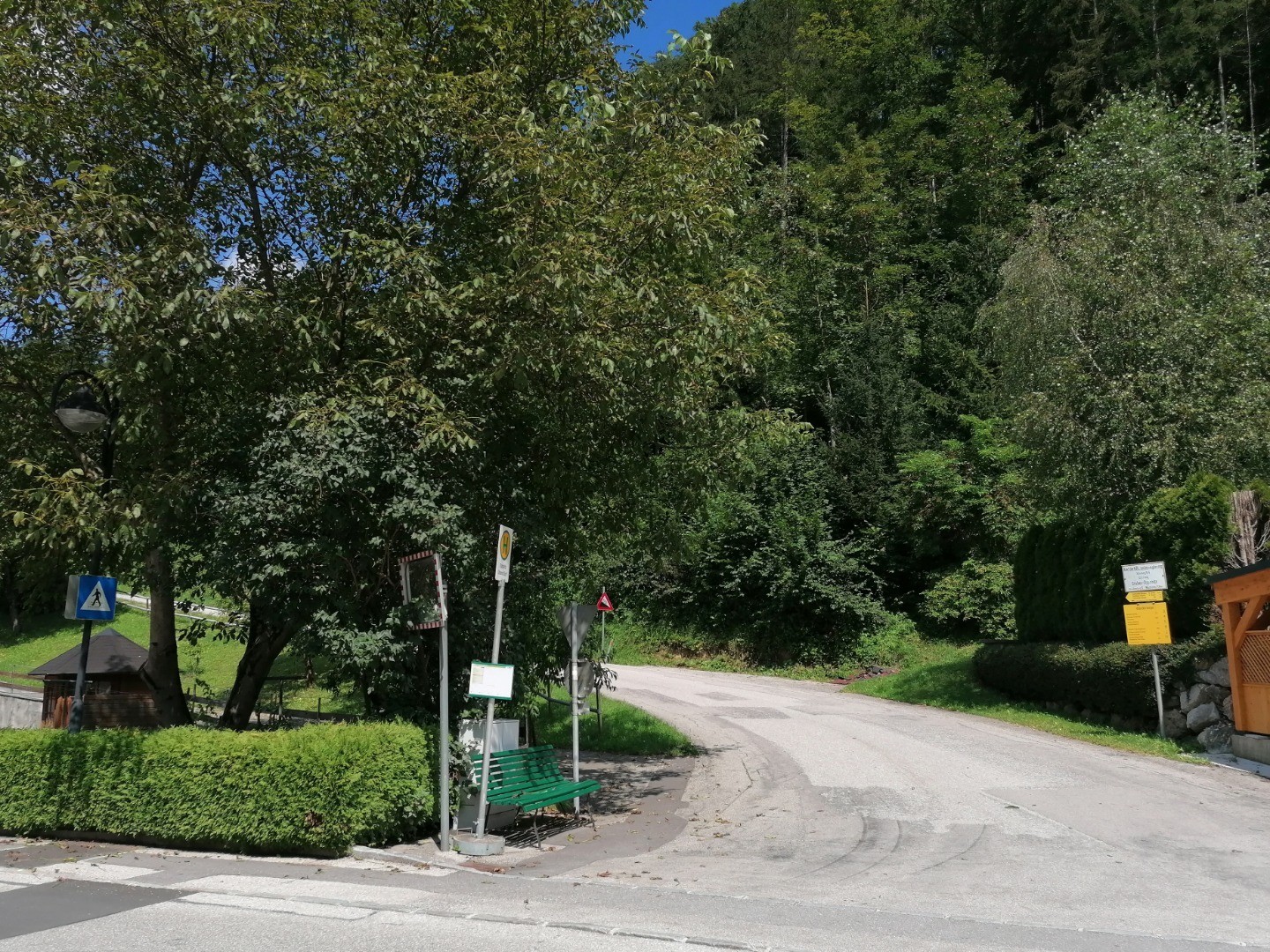Bei der Pferdekoppel biegen wir links ein und folgen nun der Asphaltstraße bergauf. Die letzte S-Kurve kürzen wir ab und biegen gleich nach der Häusergruppe auf der rechten Straßenseite halbrechts in einen Schotterweg ein. Dieser führt uns steil und recht direkt zu den letzten Häusern auf der Atschreith.