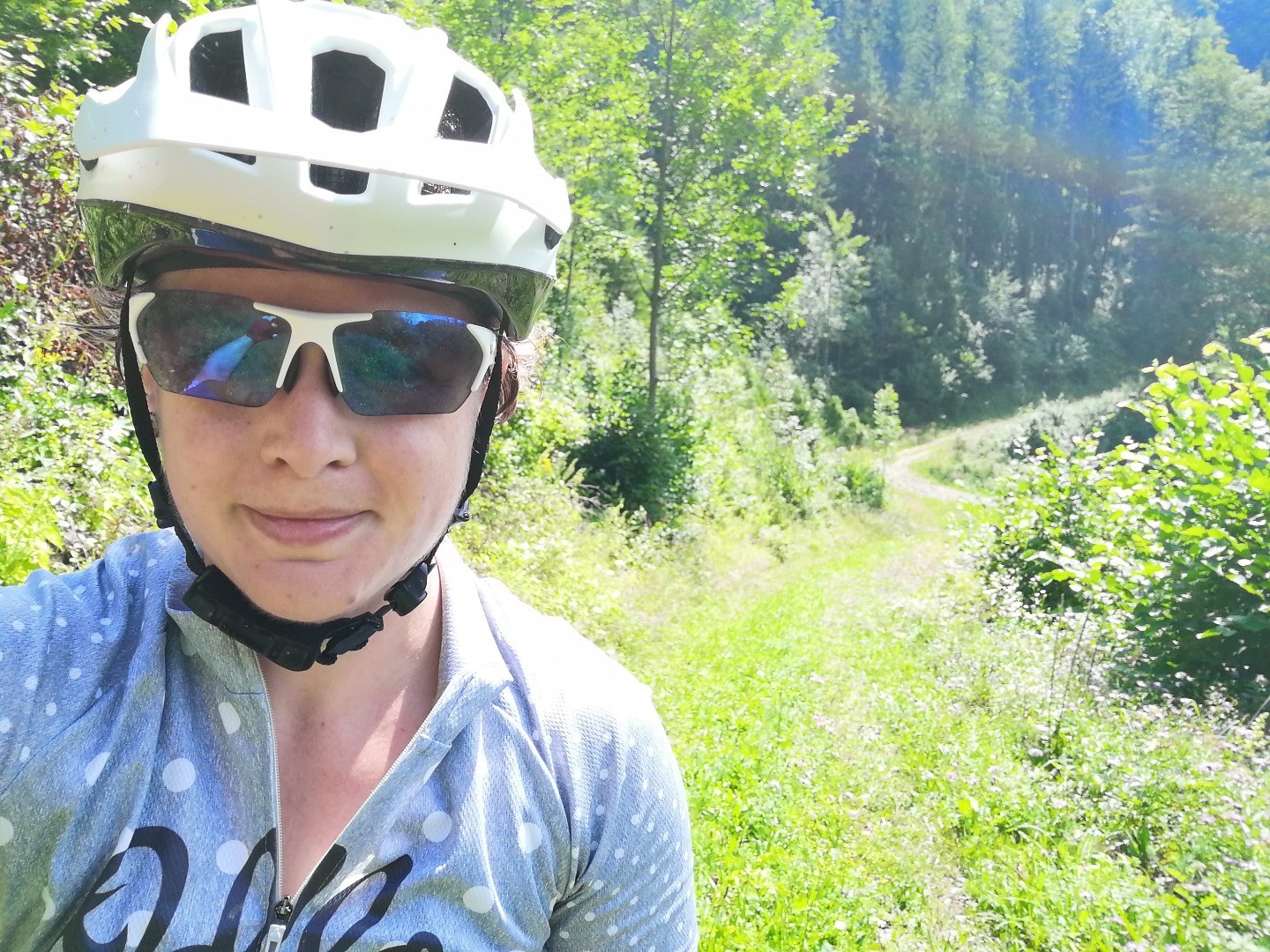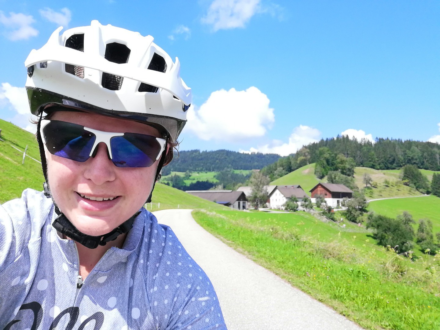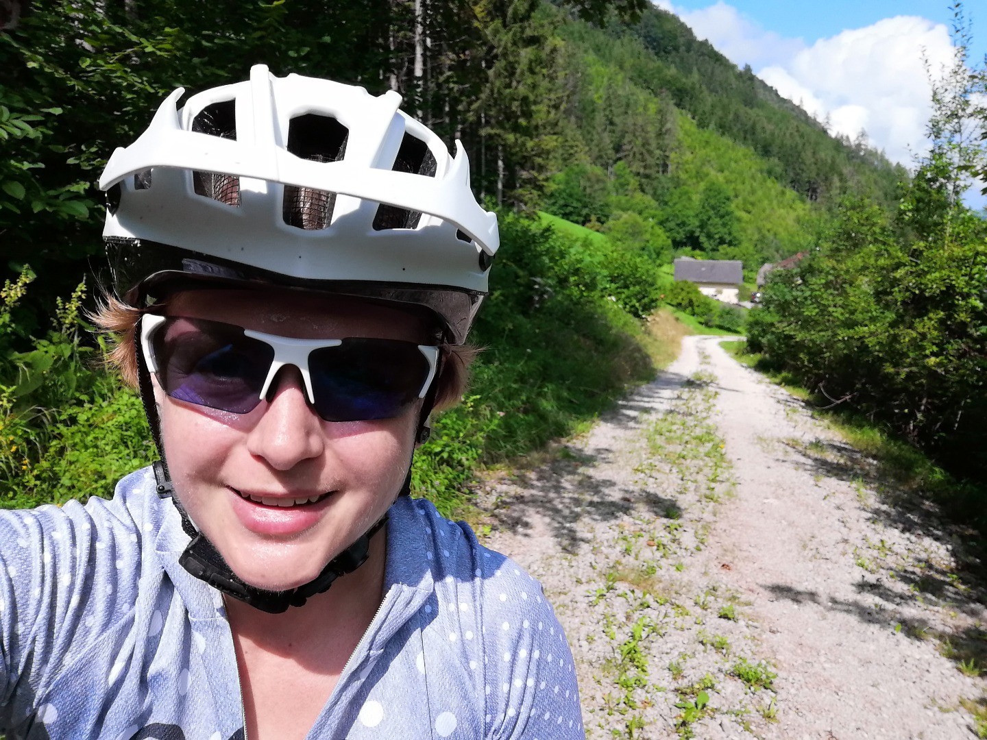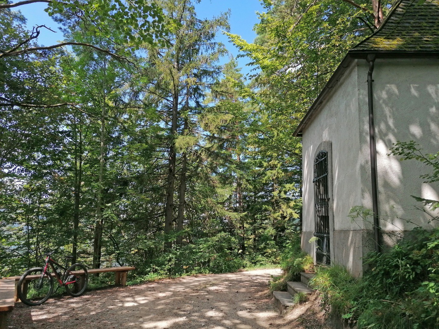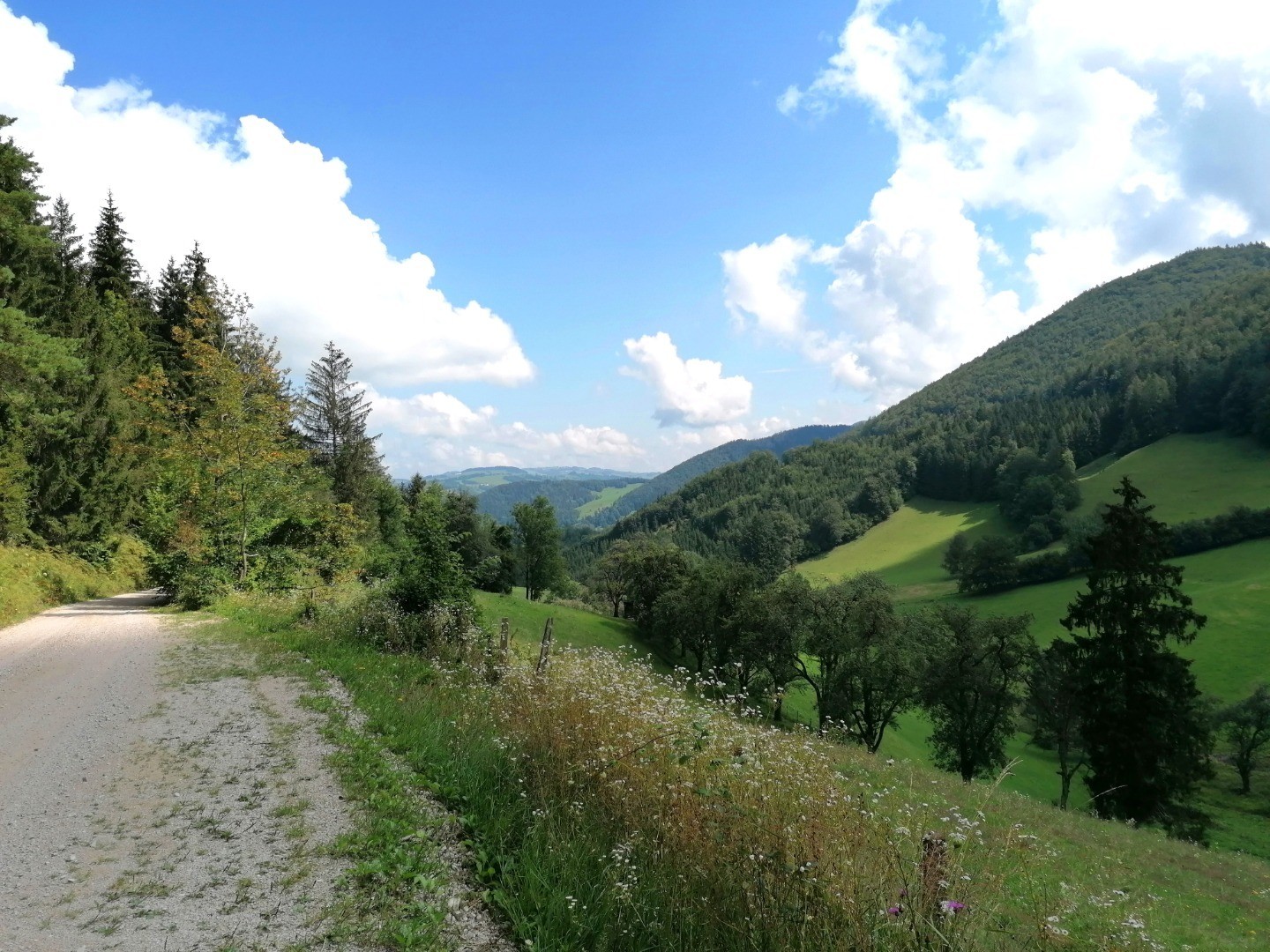 Nach etwa einem Kilometer dürfen wir wieder aufsteigen und in die Pedale treten. Rein in den Forstweg und mal bergab, mal bergauf rollen wir auf die Pechholzkapelle zu. Der Forstweg führt uns bald hinaus auf einen asphaltierten Güterweg, der uns mit Blick auf Windhag und den Sonntagberg zurück bis ins Tal in die Mündung zum Ybbstalradweg führt.