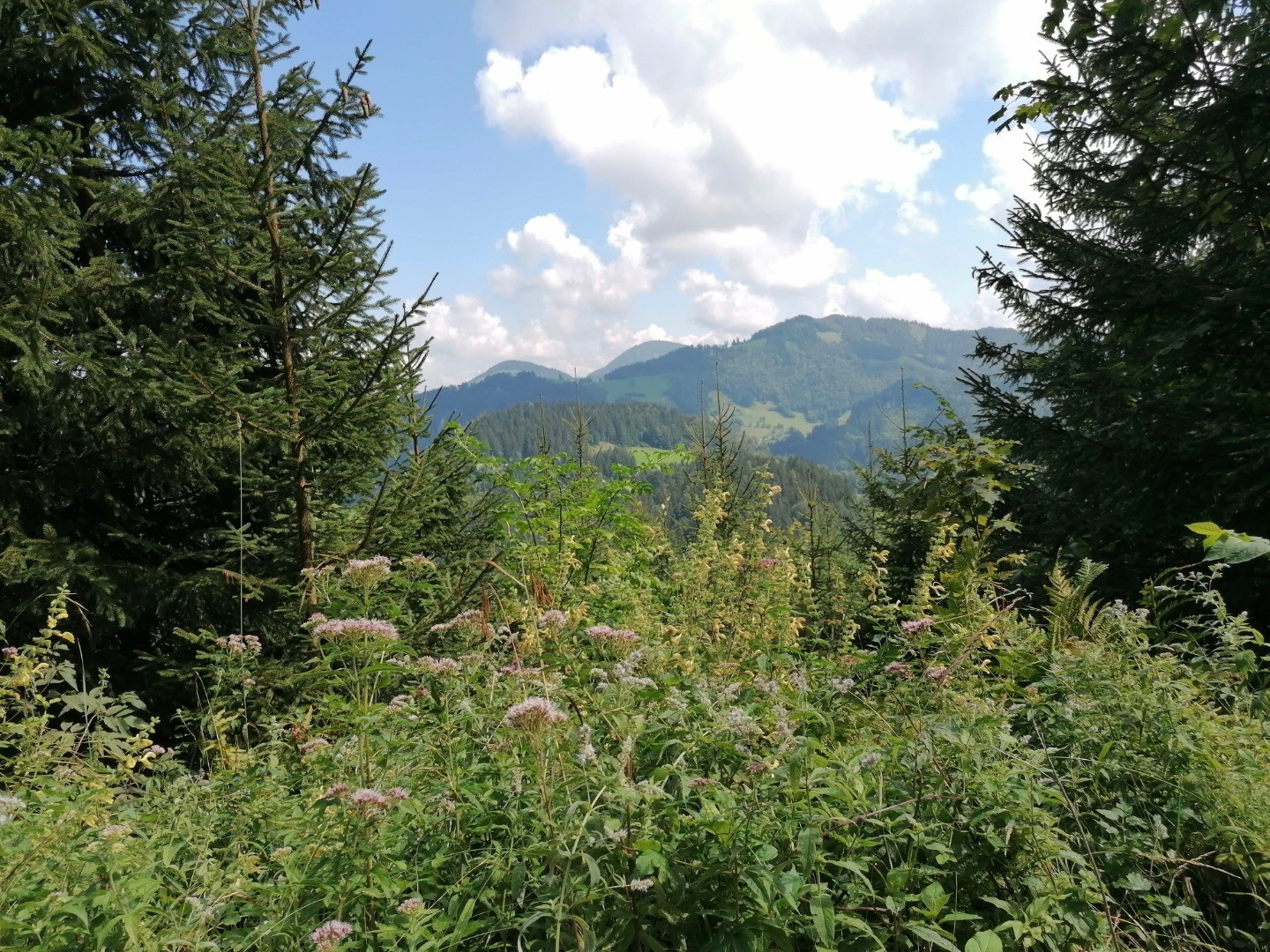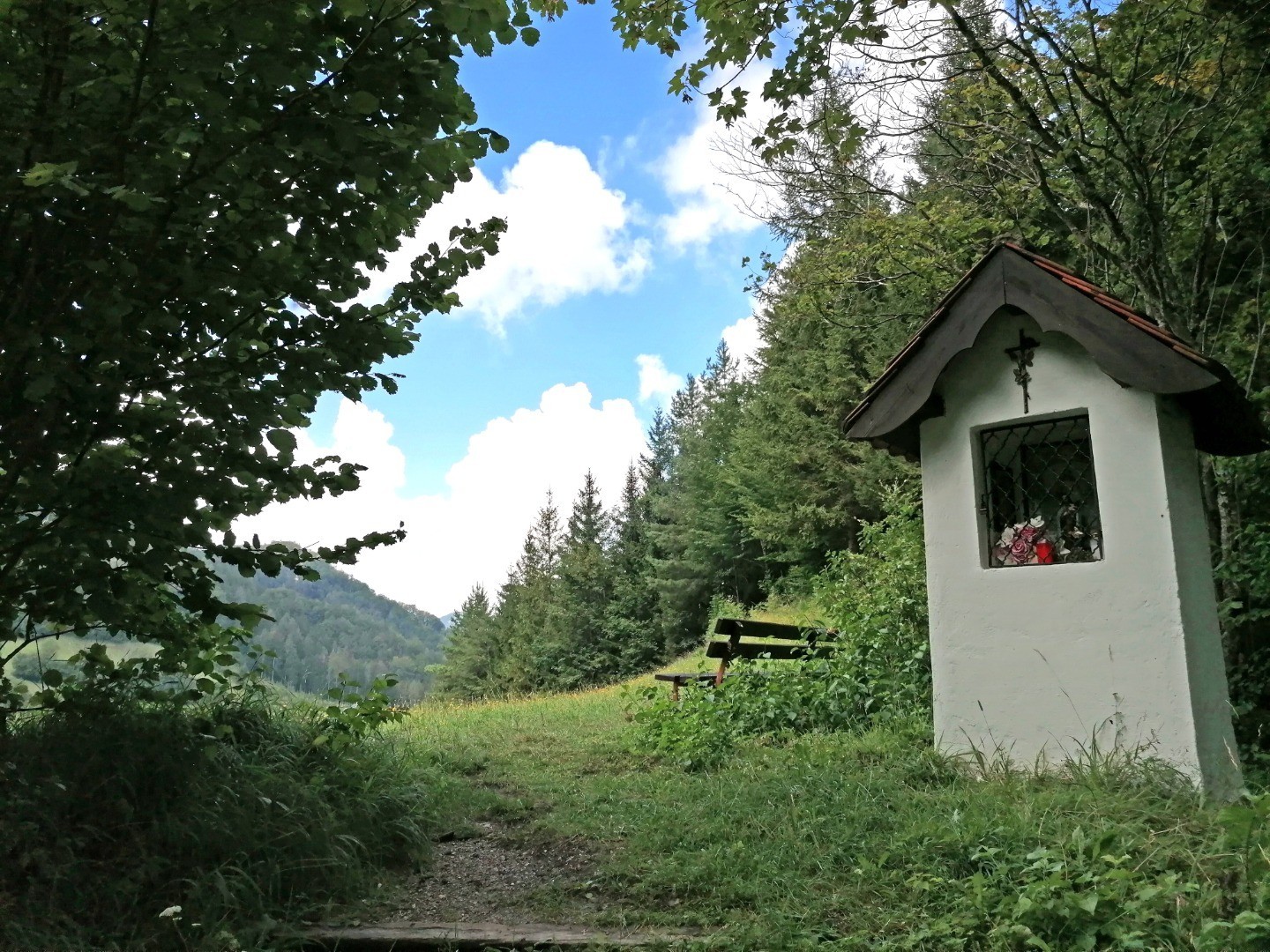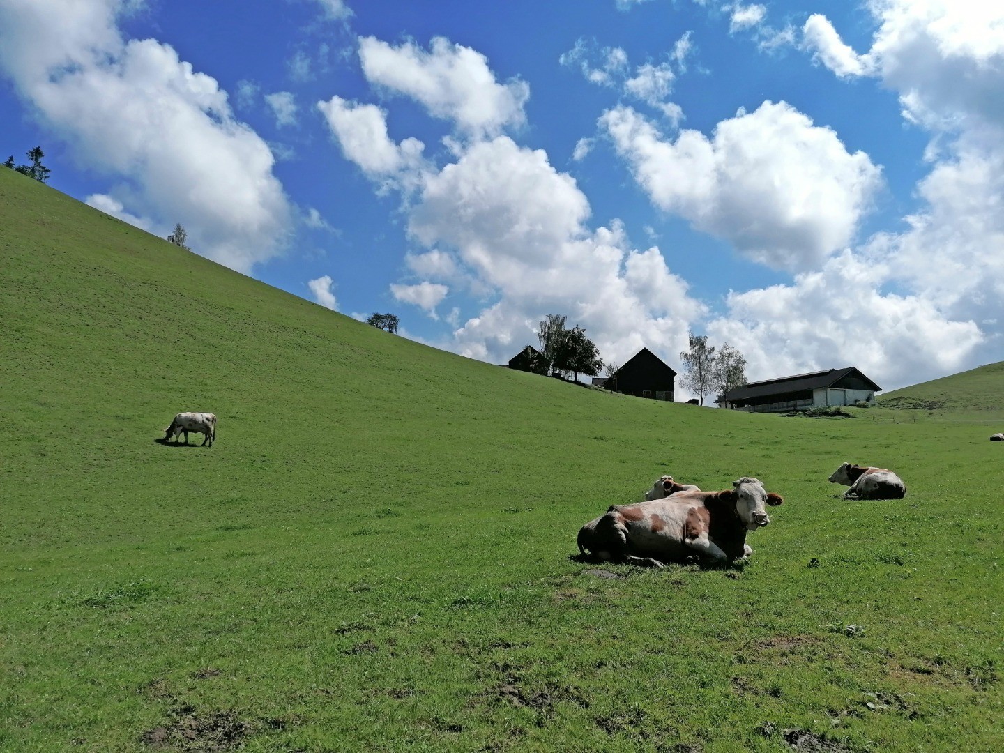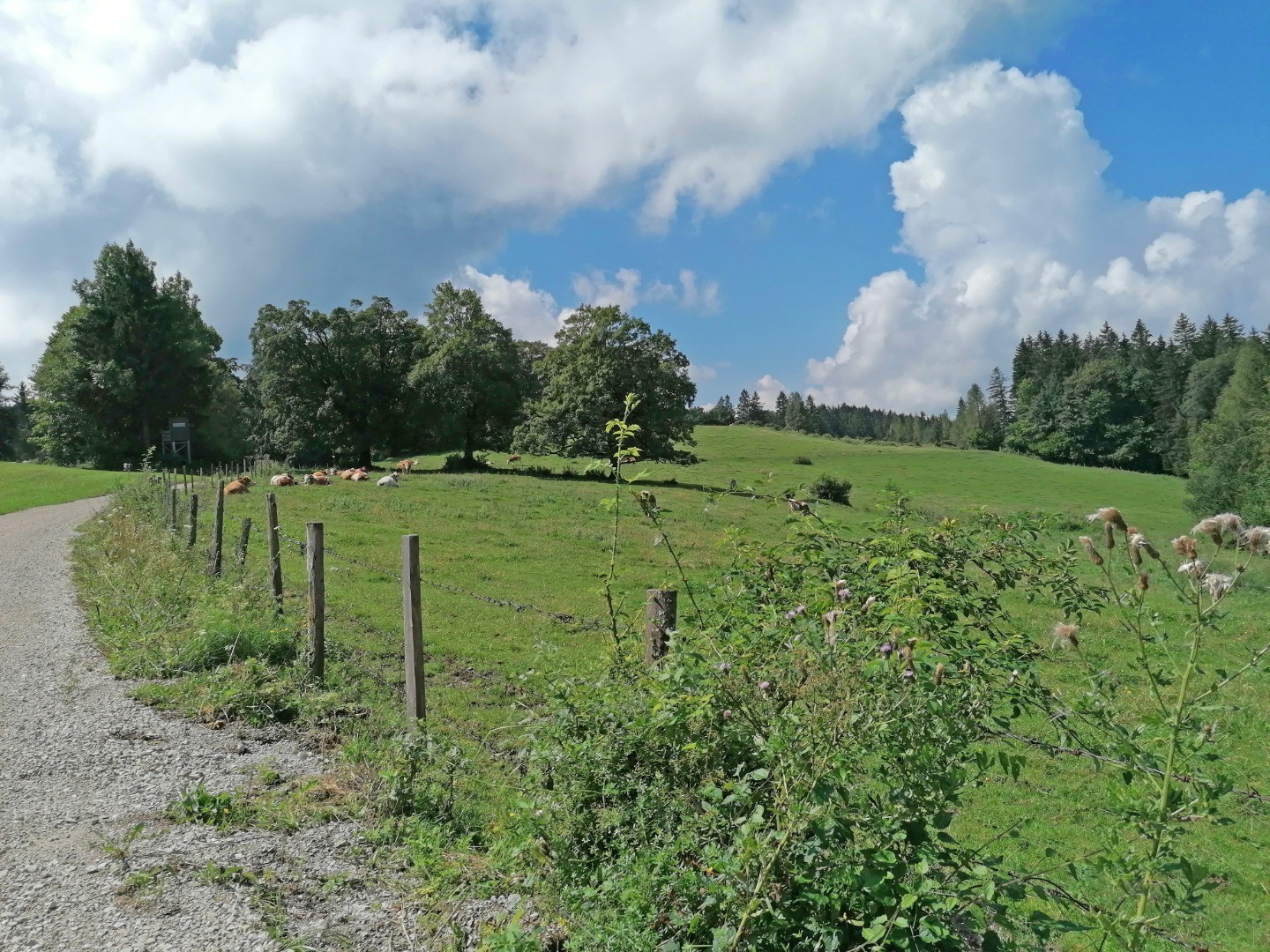 Dort angekommen folgen wir der "Mountainbike-Strecke" bzw. "Atschreith-Tour", die uns auf der breiten Forststraße zur Hanlreith-Wies führt. Eine kurze Pause beim kleinen Kapellchen und schon geht's linkerhand weiter. Es geht nun steiler bergauf als bisher, ist aber dafür selbst im Hochsommer relativ kühl. Oben angekommen lässt das gemeine Fleckvieh Alm-Feeling aufkommen.