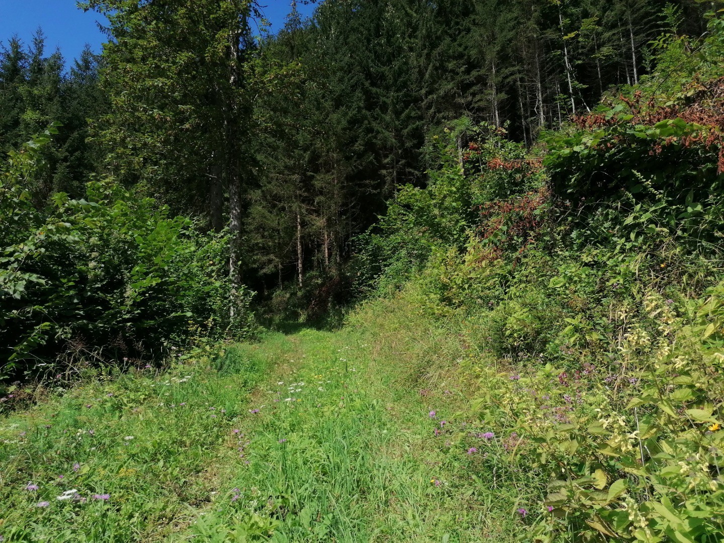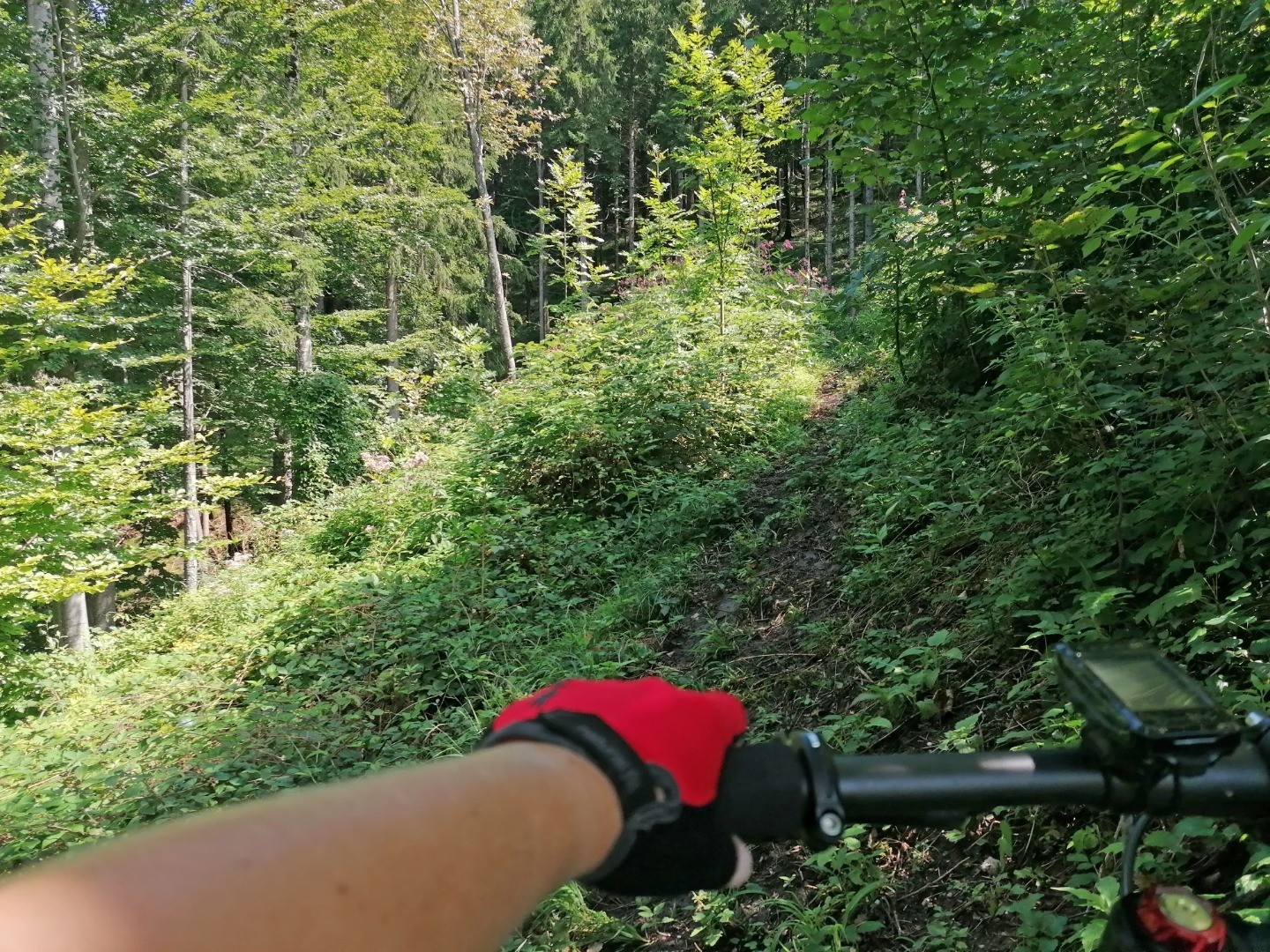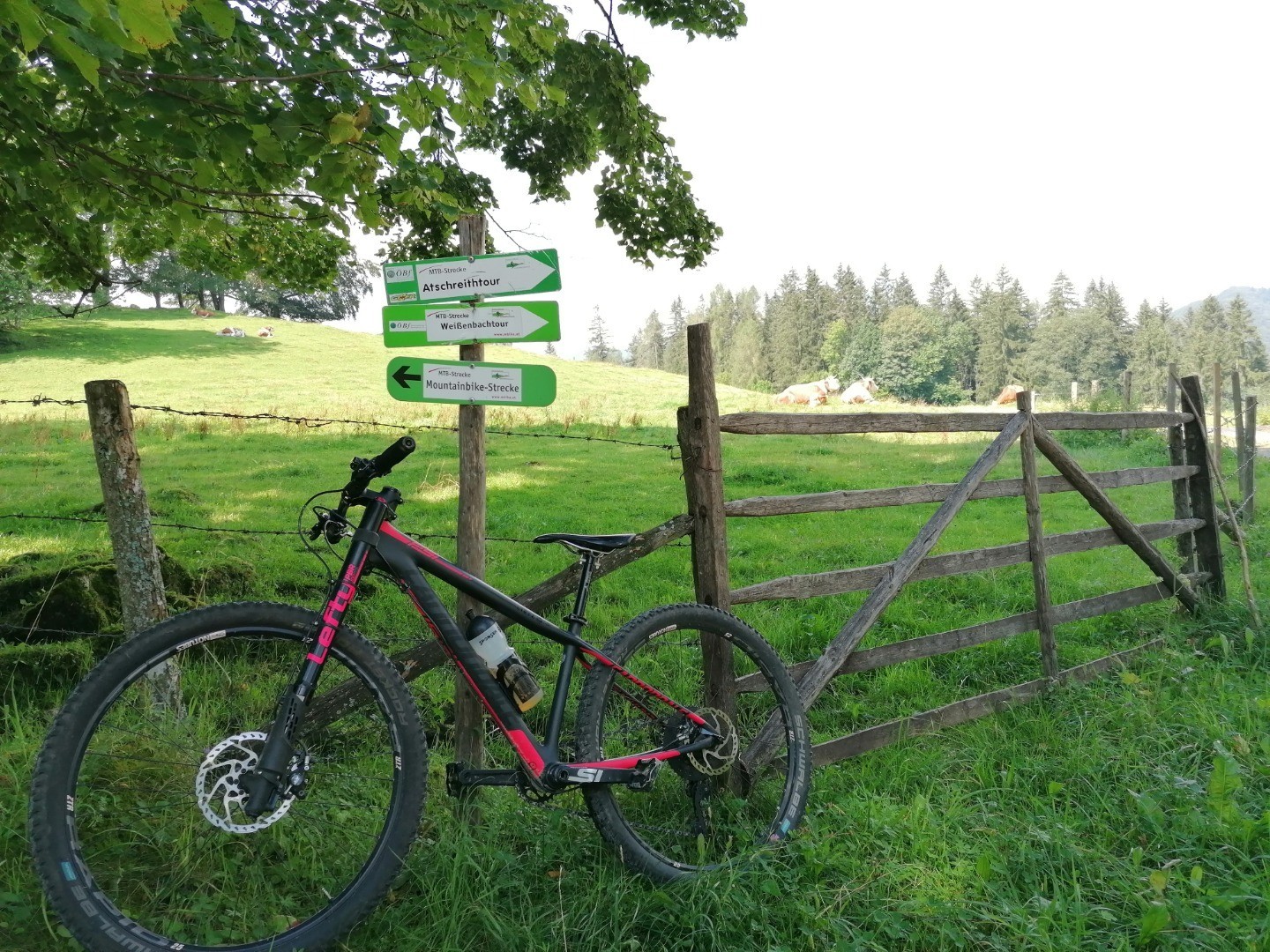 Wir ignorieren die Schilder "Atschreith-Tour" und "Weißenbach-Tour" und folgen dem alles erklärenden Schild "Mountainbike-Strecke". Diese führt uns nun bergab und hangparallel 200 Höhenmeter bergab.