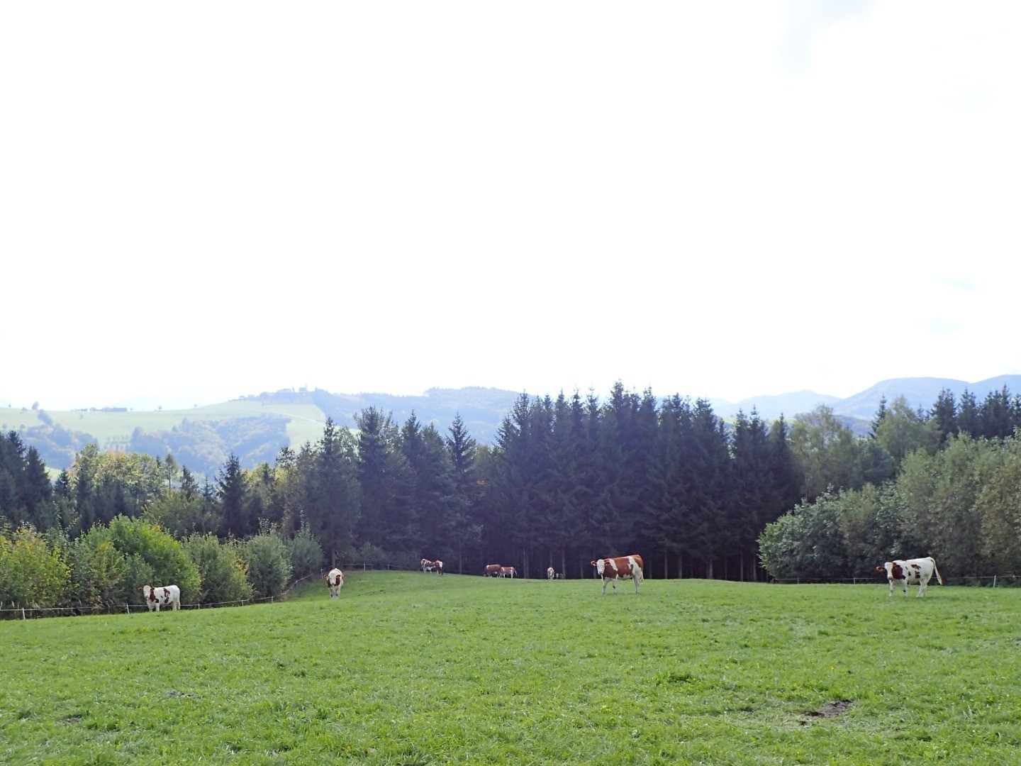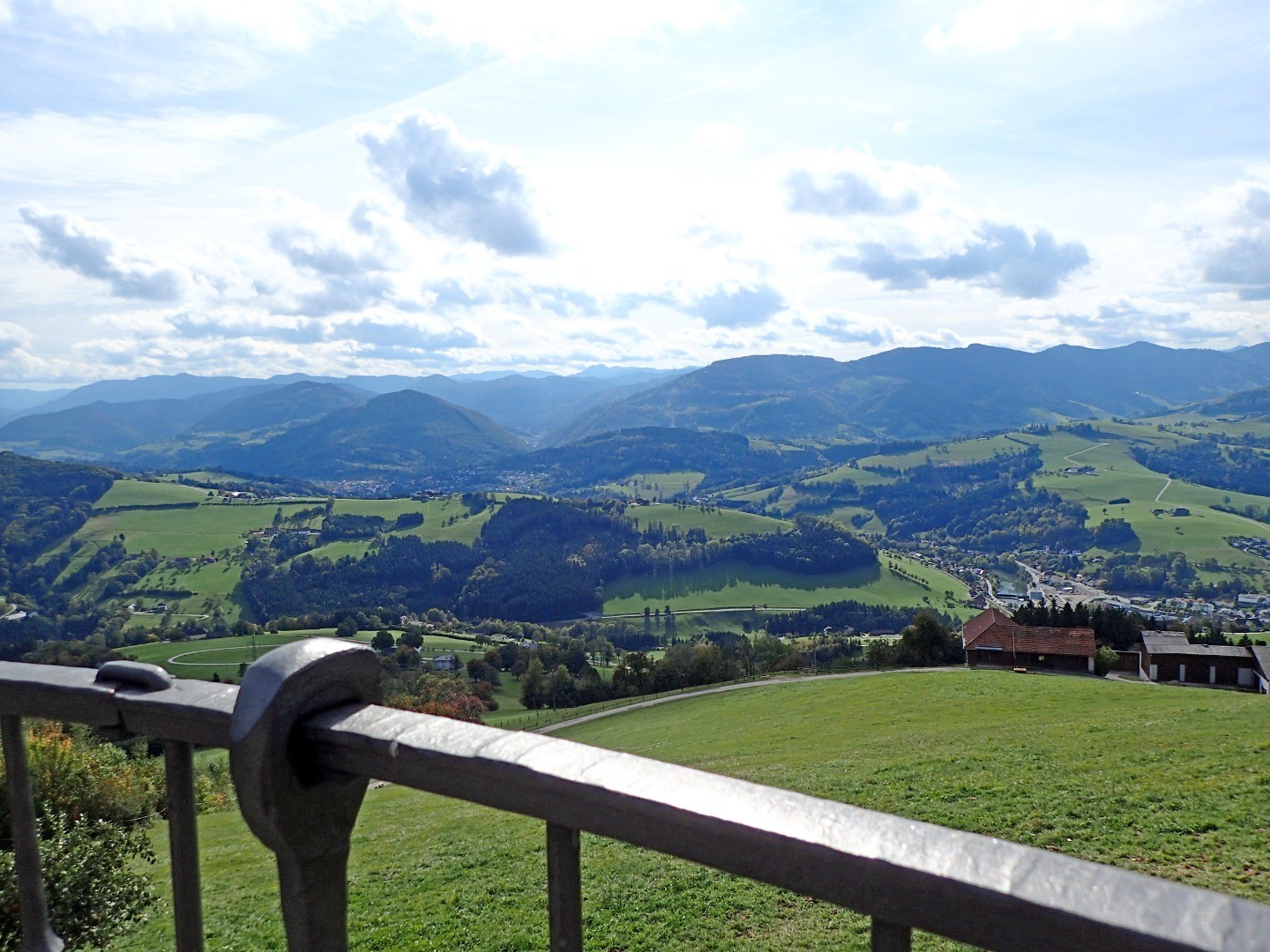 Nun gehts weiter stets bergauf dem Wegweiser “Sonntagberg” folgend. Am Parallelhang stellt sich uns das Dörfchen Windhag vor und noch weiter Richtung Süden blickend erwarten uns die ersten Gipfel der Kalkalpen. Nach einer kurzen Entspannungspause steigt die Route noch einmal mit 10% an und wir erreichen bei der Tischlerei Tatzreiter die Höhenstraße.