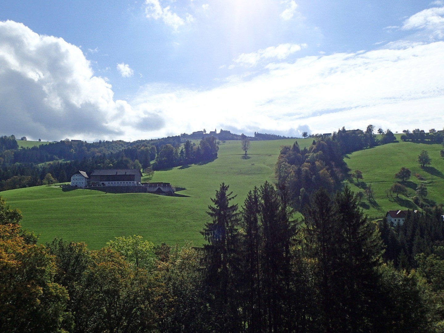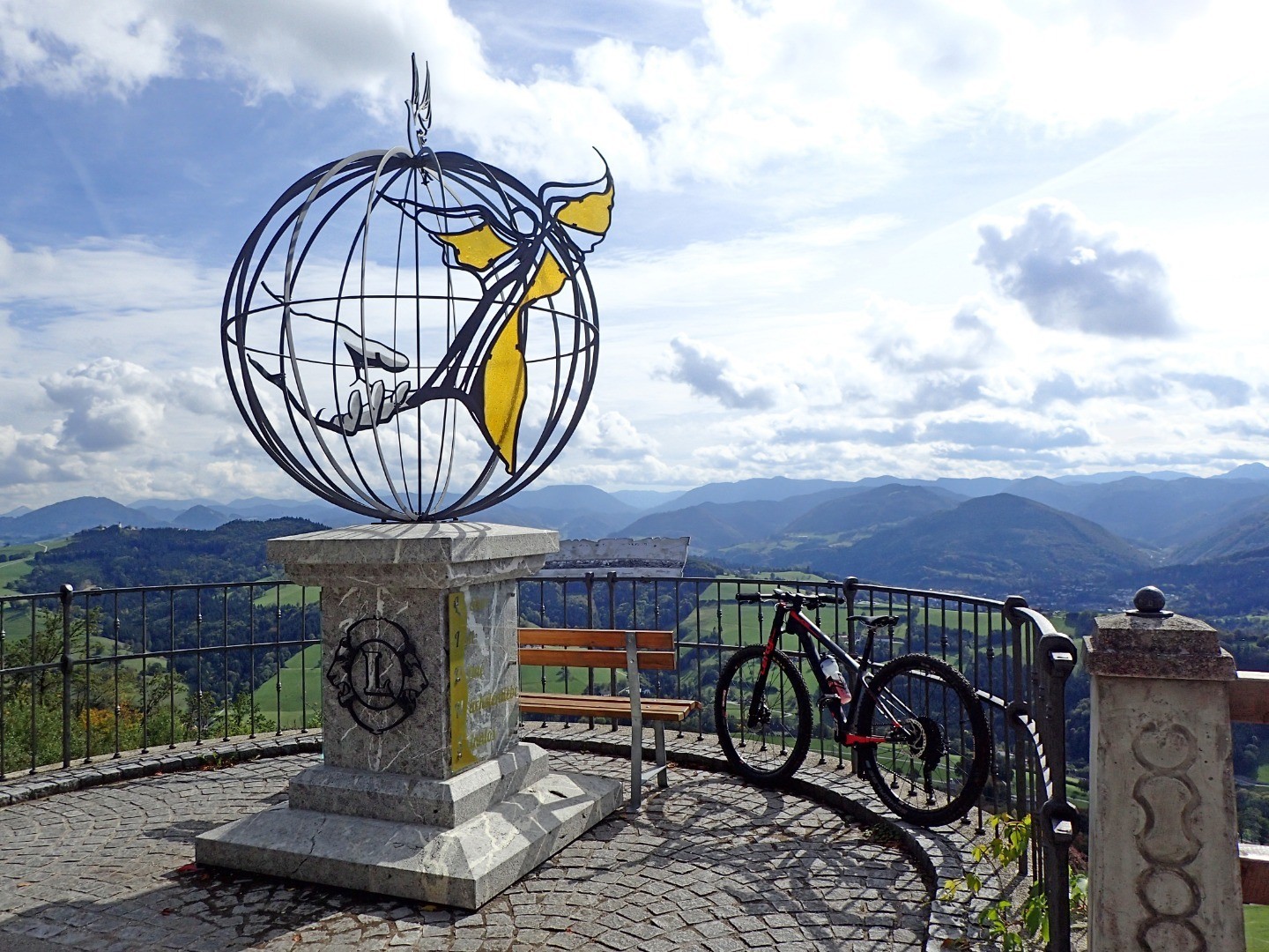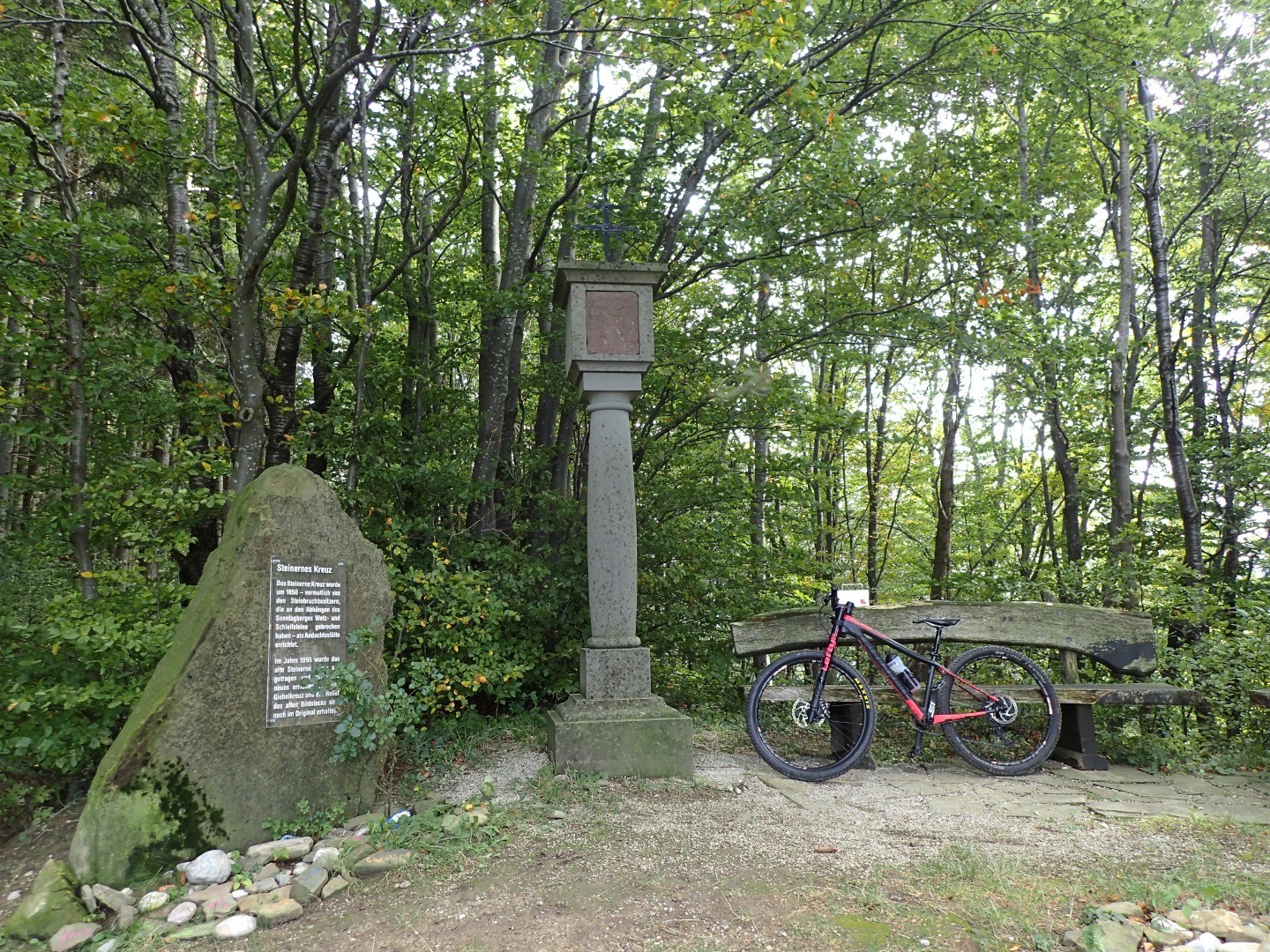 Wir halten uns am gepflasterten Straßenabschnitt links, biegen auf eine Schottereinfahrt und gleich danach auf einen kleinen Wiesentrail ab. Dieser bringt uns zur Abfahrt Richtung Sonntagberg. Einem steilen Forstweg folgend bremsen wir uns beim Steinernen Kreuz ein, wo wir links aus dem Wald raus auf einen Güterweg rollen. Hier eröffnen sich uns schöne Blicke auf Böhlerwerk und seine hügeligen Nachbarn. Noch einmal bietet sich die Gelegenheit, beim Gasthof Kerschbaumer einzukehren oder aber wir treten den Rückweg auf dem uns schon bekannten Weg nach Waidhofen an.
