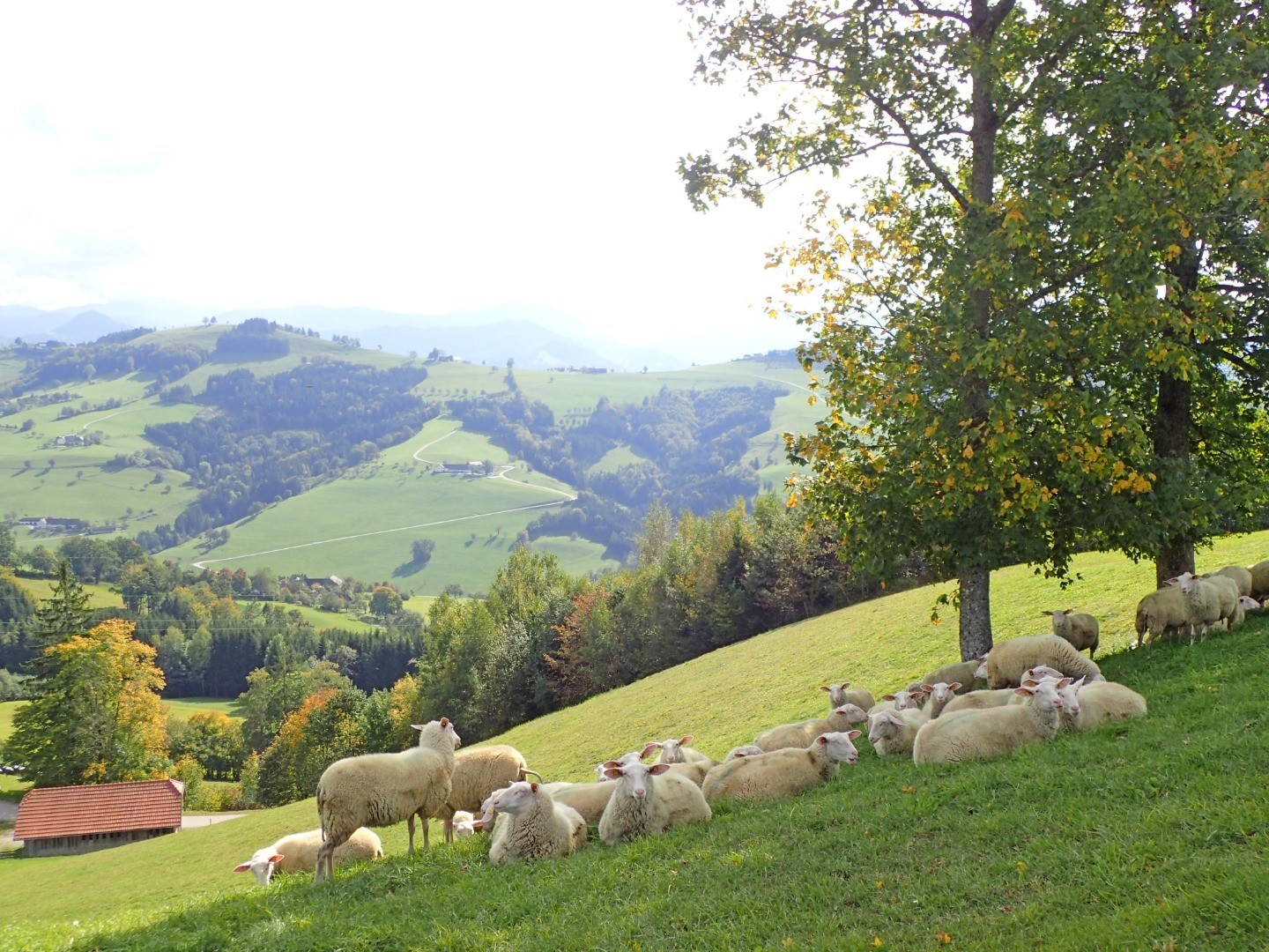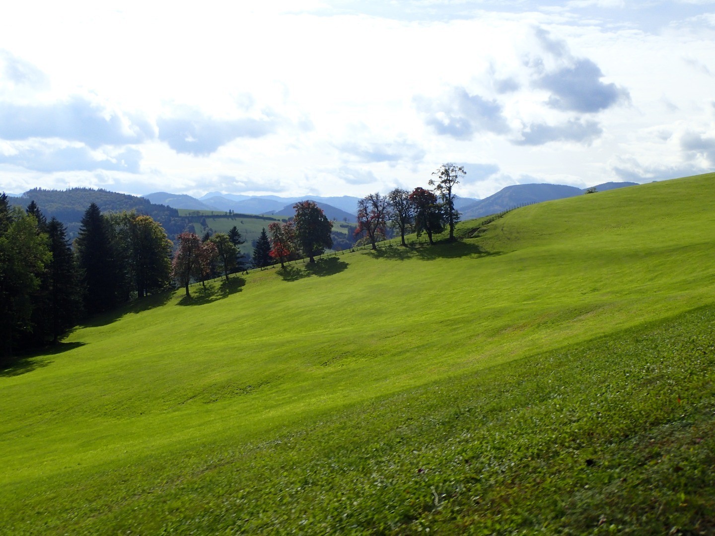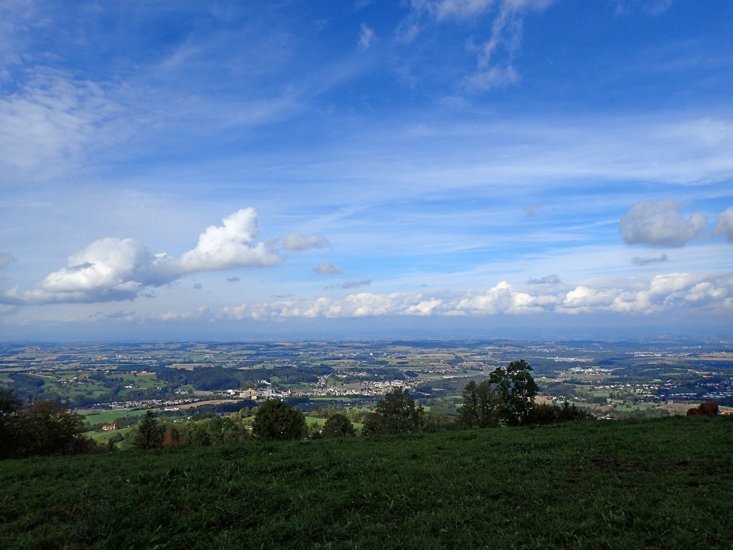 Wir halten uns am gepflasterten Straßenabschnitt links, biegen auf eine Schottereinfahrt und gleich danach auf einen kleinen Wiesentrail ab. Dieser bringt uns zur Abfahrt Richtung Sonntagberg. Einem steilen Forstweg folgend bremsen wir uns beim Steinernen Kreuz ein, wo wir links aus dem Wald raus auf einen Güterweg rollen. Hier eröffnen sich uns schöne Blicke auf Böhlerwerk und seine hügeligen Nachbarn. Noch einmal bietet sich die Gelegenheit, beim Gasthof Kerschbaumer einzukehren oder aber wir treten den Rückweg auf dem uns schon bekannten Weg nach Waidhofen an.