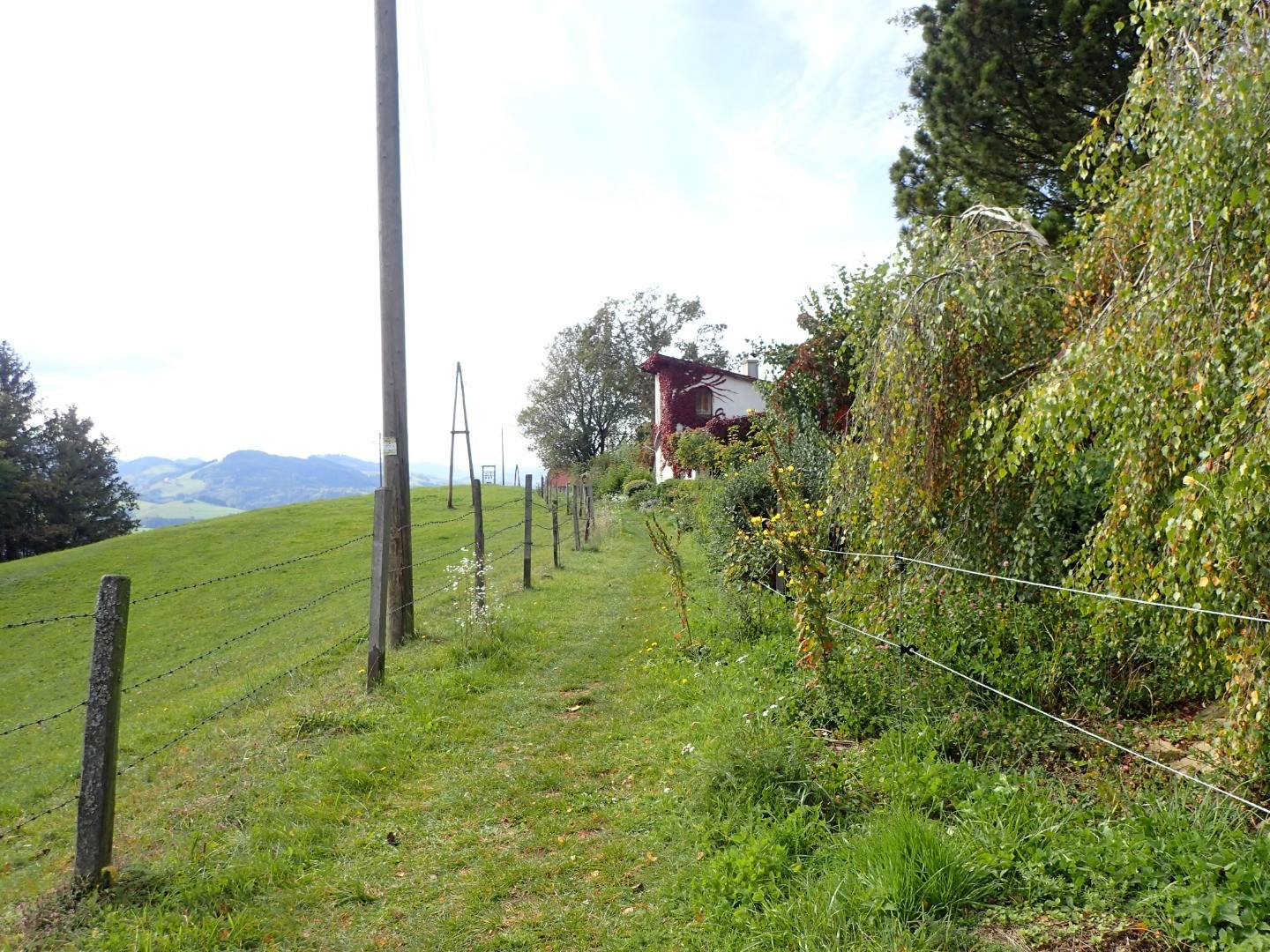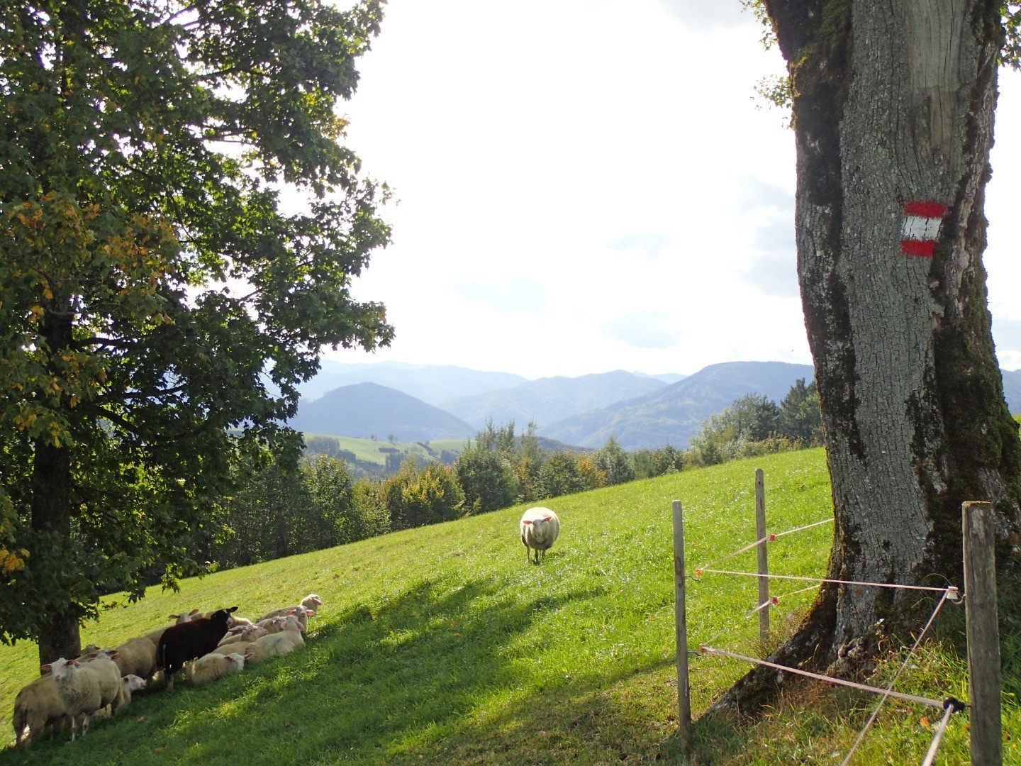 Nach insgesamt etwa 7,7 Kilometer führt unsere Tour nun endlich bergauf. Beim Schild “Mostviertler Höhenrundweg” biegen wir scharf links über ein Brückchen und schon stellt sich der Hang vor uns auf. Möglicherweise empfängt uns schon nach wenigen Metern lautes Hundegebell, das vom über uns gelegenen Bauernhof herrührt. Dominantes und wirklich lautes Anreden des borstigen Rabauken hilft, dass er den Rückzug antritt, selbst wenn er das nur mürrisch und mit eingezogener Rute macht (ist eh ein ganz Lieber, der will sicher nur spielen).