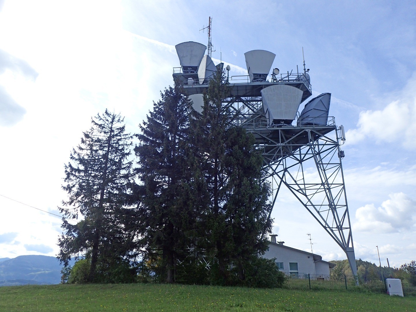 Dieser folgen wir nun in eine Senke und bieten schon nach wenigen Metern bergauf links ein in einen Trail. Dieser führt uns zur Sonntagberger Sendestation – einem nicht gerade hübschen, aber weithin sichtbaren Kennzeichen der Region.