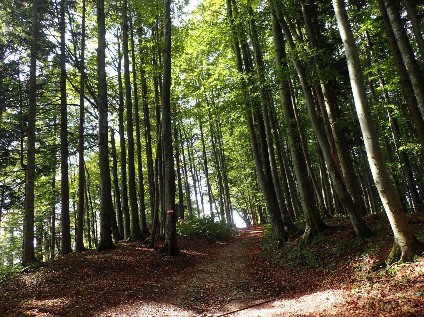 Wir könnten nun (vor allem im Winter) gleich links abfallend in Richtung Basilika Sonntagberg radeln, entscheiden uns aber für eine lohnende Schleife nach rechts. Nach einem sanften, kurzen Anstieg biegen wir links ein und folgen genau am Bergrücken entlang der Beschilderung “Mountainbikestrecke”. Der Weg durch die Allee bietet weite 360°-Blicke und führt uns letztlich vorbei an einem Forsthaus zurück auf die Höhenstraße.