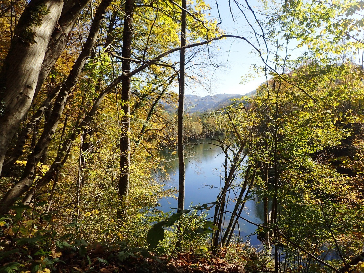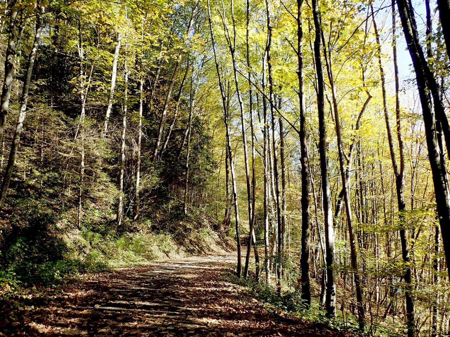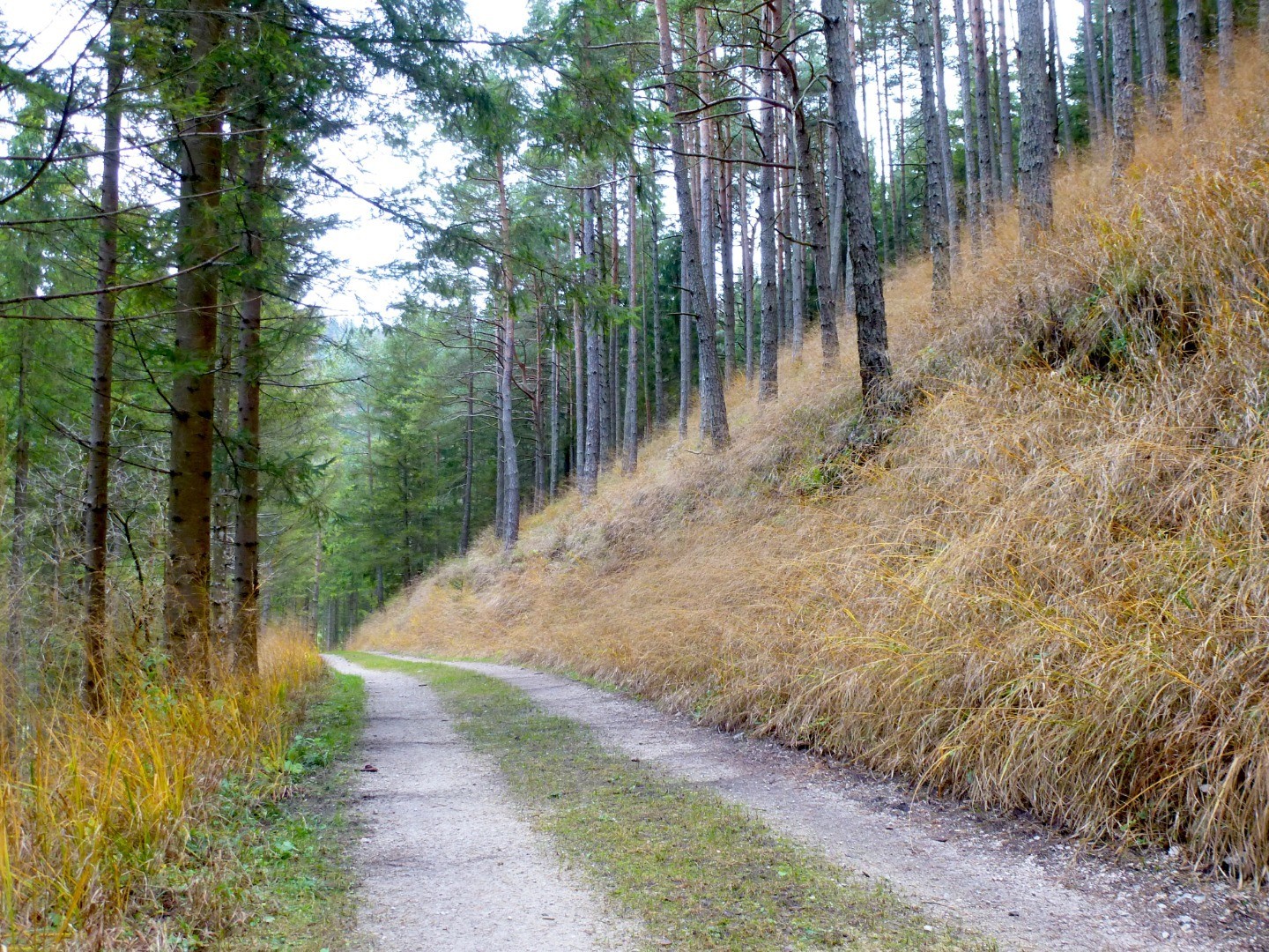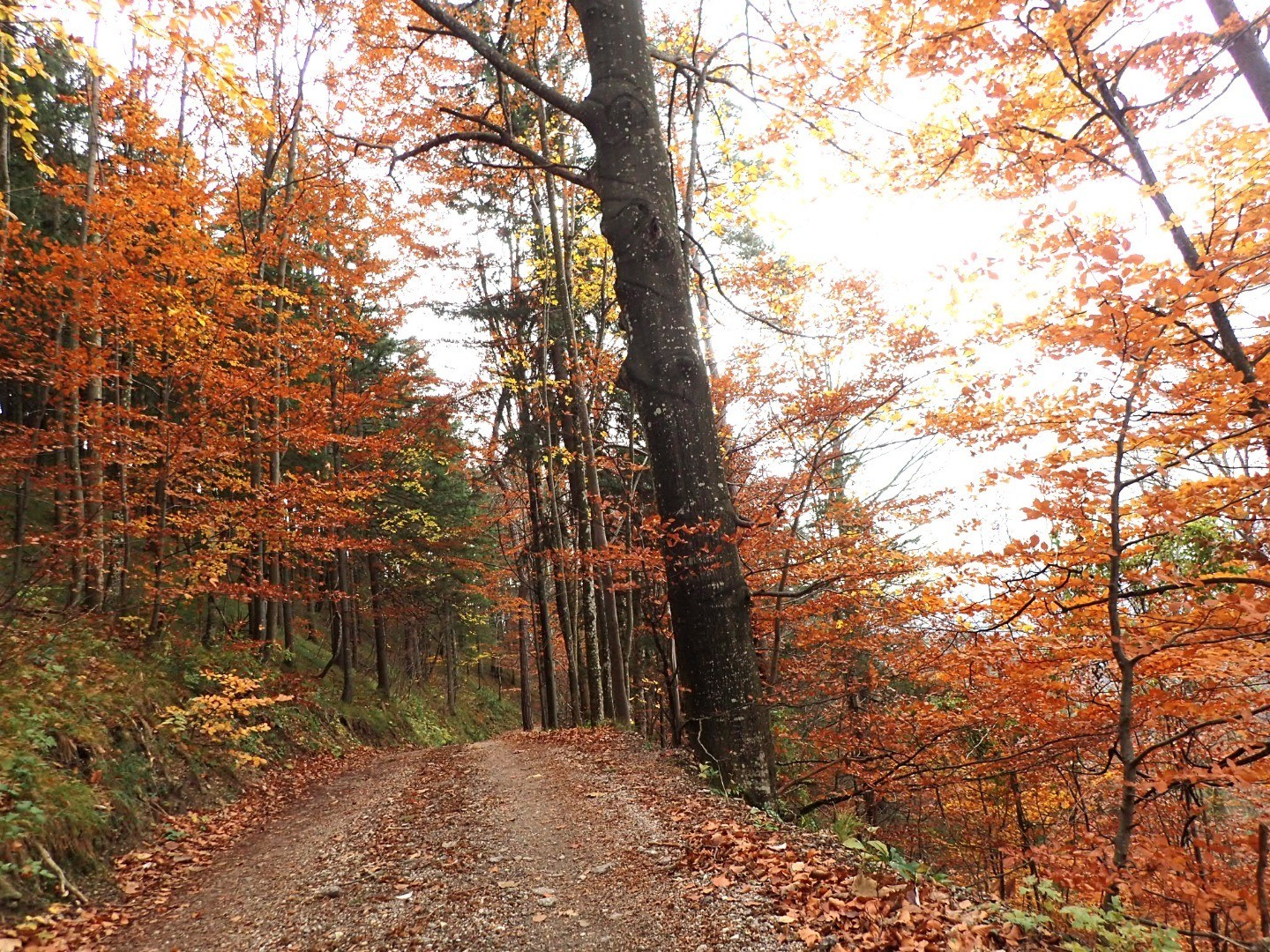 Bei Kilometer 9 genießen wir endlich ein paar entspannende Meter bergab, bevor es noch einmal spürbar ansteigt. Vorbei an zwei weiteren Bauerhäusern (und einem Hund!) erreichen wir den bunt gefärbten Mischwald. Endlich auf der Forststraße angelangt saugen wir den Geruch und die Farben des Waldes ein und machen bei der Pechholzkapelle eine kleine Rast. Wer will, trägt sich in eine Art Gipfelbuch ein, das hinterm Kapellentor auf Gäste wartet.
