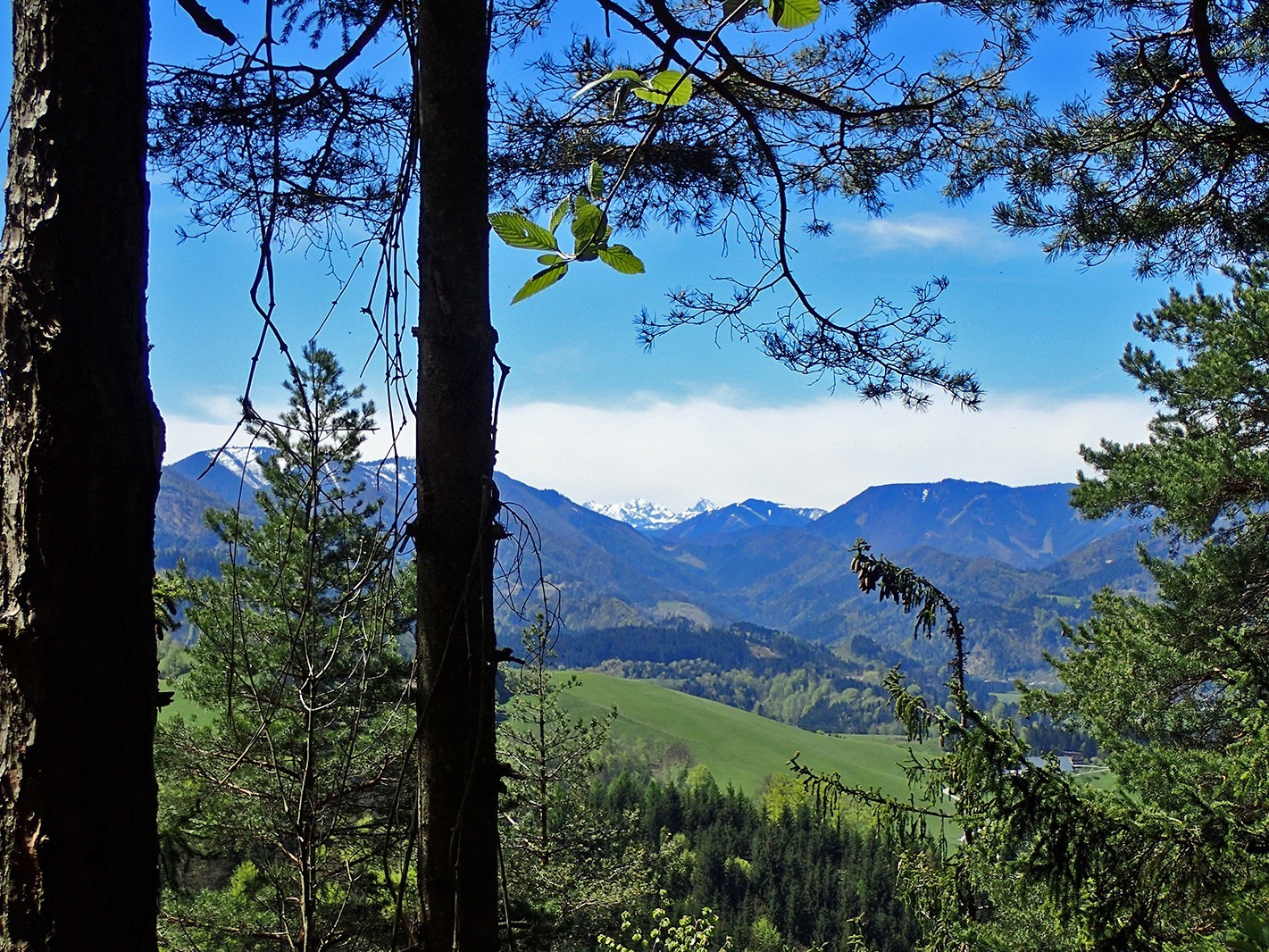 Am Gut Theuretzbach halten wir uns rechts und folgen den Wegweisern der “Ida Pfeiffer-Strecke”, sofern welche zu sehen sind. Vorbei an den edlen Geschöpfen in den Koppeln folgen wir dem schmalen Forstweg eben dahin, bis er sich plötzlich kurz und steil nach links auf den Hang hinauf aufbäumt. Das war auch schon das steilste Stück. Die nächsten Meter verlaufen im Wald, wo wir uns Meter um Meter über die Koppeln hinweg schrauben.