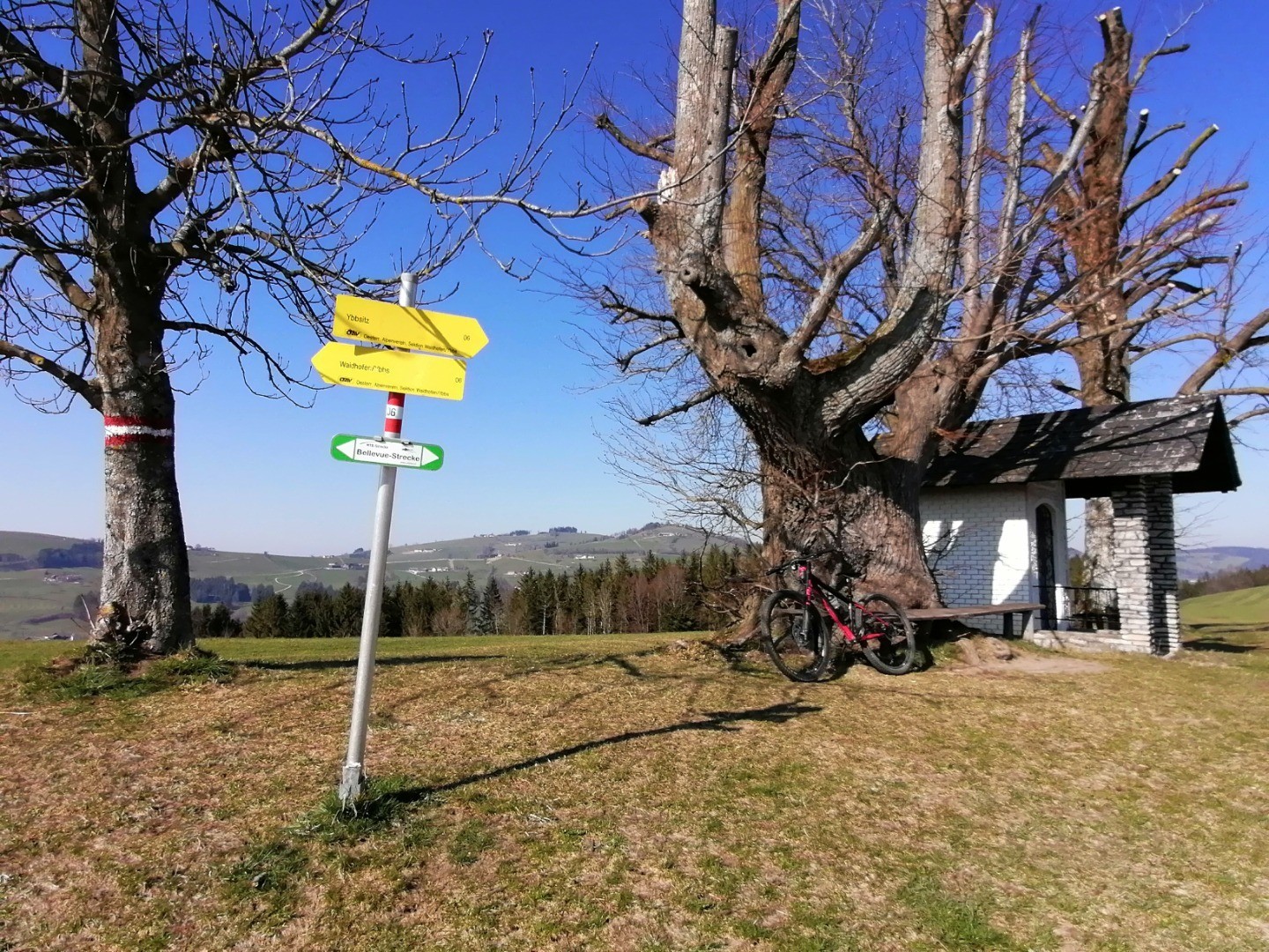 Noch vorm Hof biegen wir scharf links ab und folgen der Beschilderung "Mountainbike-Strecke". Diese führt uns direkt auf den Wald zu, wo der weitere Streckenverlauf unverfehlbar stetig bergauf führt.