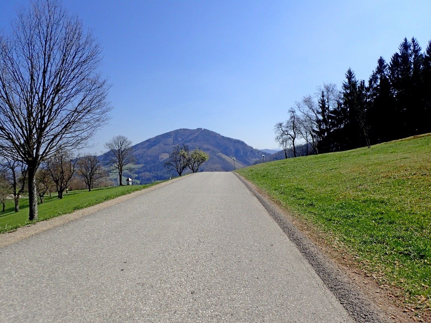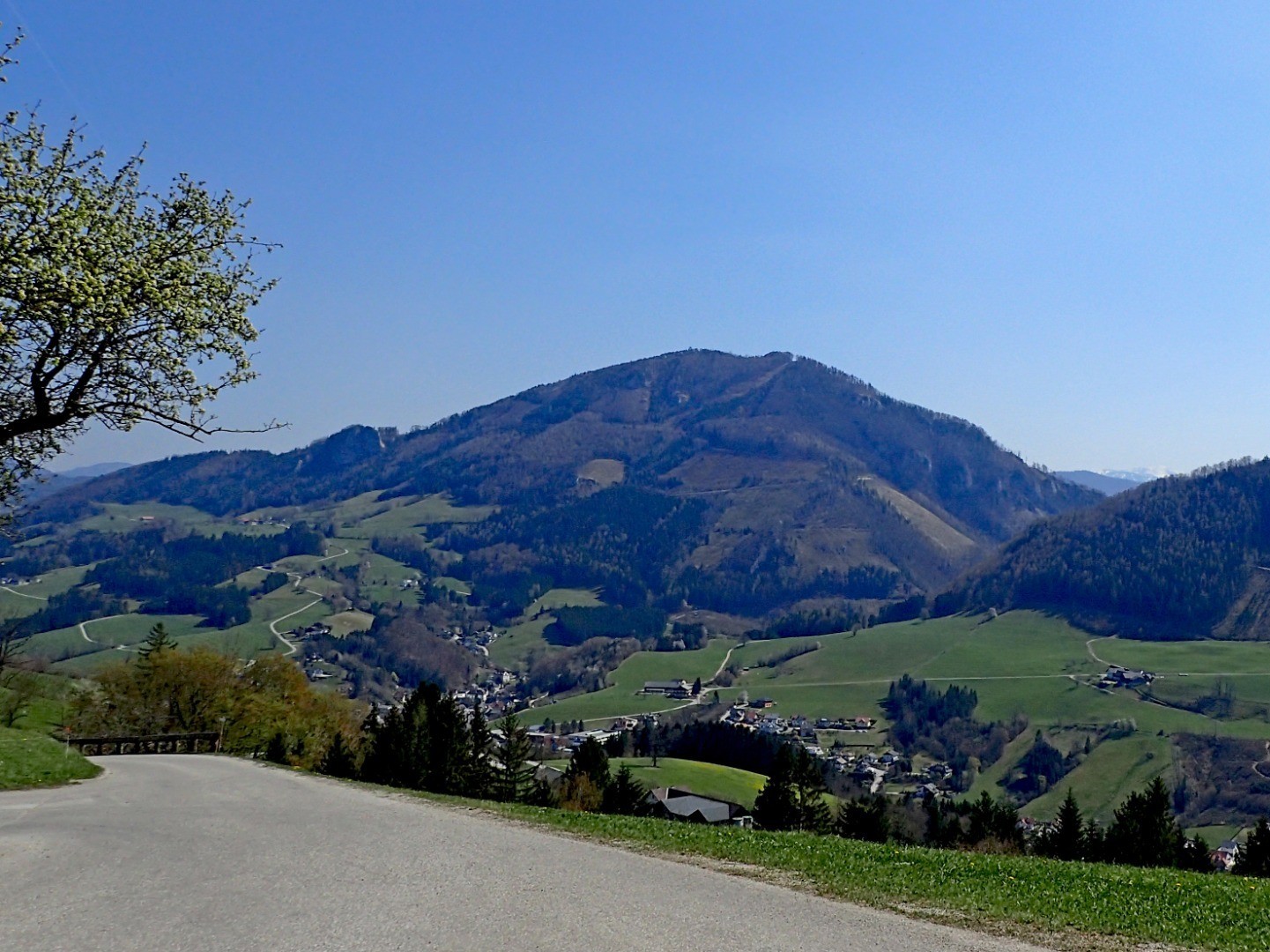 Bei der Höhenweg-Kapelle, auch Pimeskapelle genannt, münden wir wieder auf die Asphaltstraße ein und folgen ihr bis auf den "Knieberg", dessen Schlingen uns ins Ortzentrum Ybbsitz führen. Wer will, wirft einen Blick auf den gegenüberliegenden Hang, wo sich der Anstieg auf den Prochenberg deutlich abzeichnet.