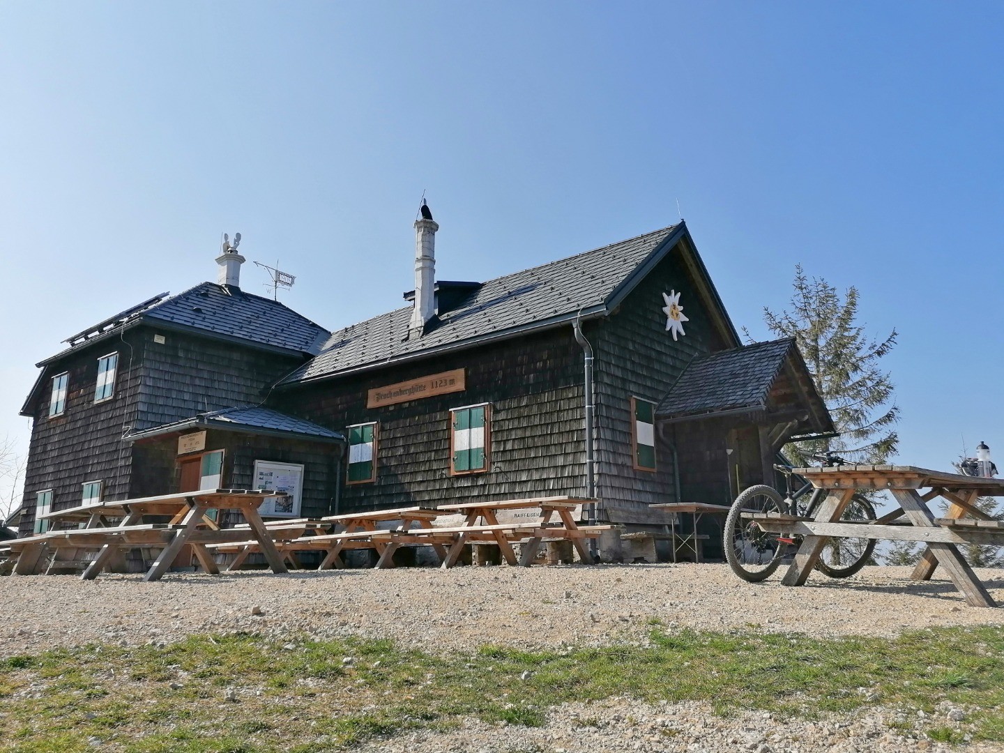 Steile Anstiege führen zuerst auf sonnigen Güterwegen, dann auf schottrig-schattigen Forststraßen zur der auf über 1000 Meter gelegenen Hütte, die müden Wanderern und schlaffen Mountainbikern den Sommer über wieder Leben einflößt.
