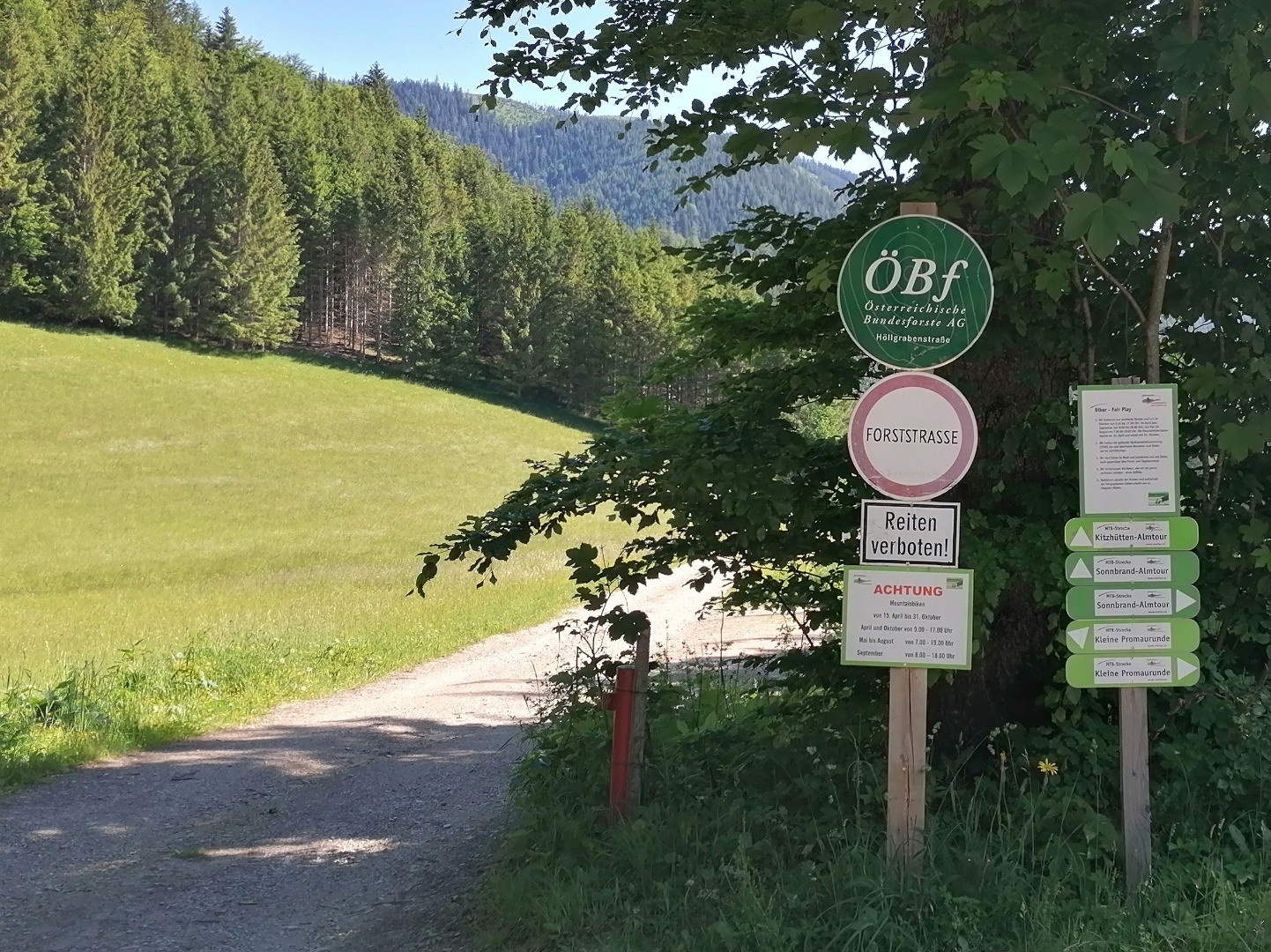 Nun erreichen wir die entscheidende Gabelung, bei der wir uns am Forstweg links halten. Ein kurzes Stück genießen wir entlang der saftigen Almwiese bergab. Wir folgen einfach dem Weg entlang des Baches, bis wir zu einer weiteren Kreuzung gelangen. Geradeaus würde uns der Weg direkt zur Kitzhütte bringen (von der wir später herunterrollen). Wir biegen also scharf rechts ab und folgen der Beschilderung „Sonnbrand-Alm-Tour“.