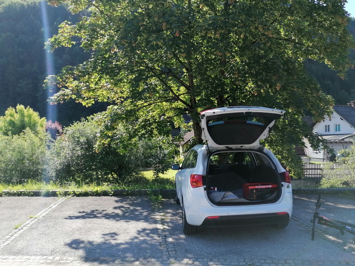 Nun aber zur Tour: Wir starten am Parkplatz gegenüber des Roten Kreuzes in Hollenstein/Ybbs, wo unser PKW mit etwas Glück ein schattiges Plätzchen für seien Wartezeit findet.
