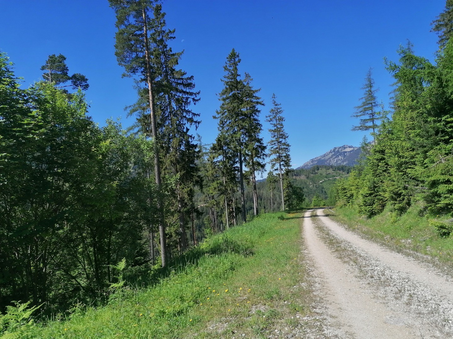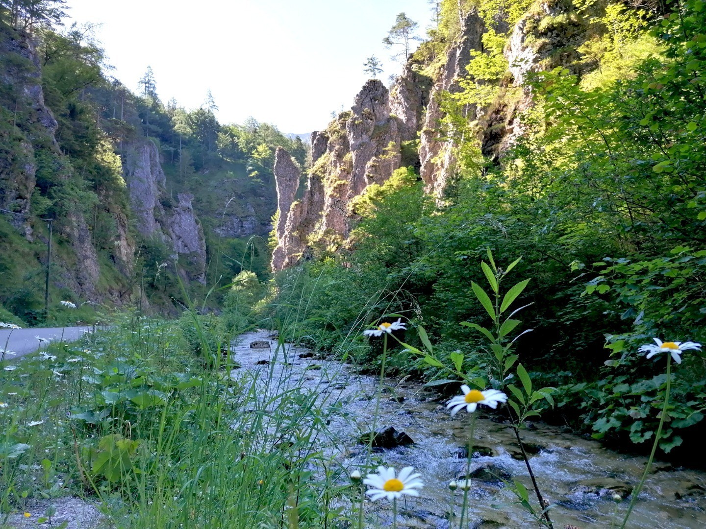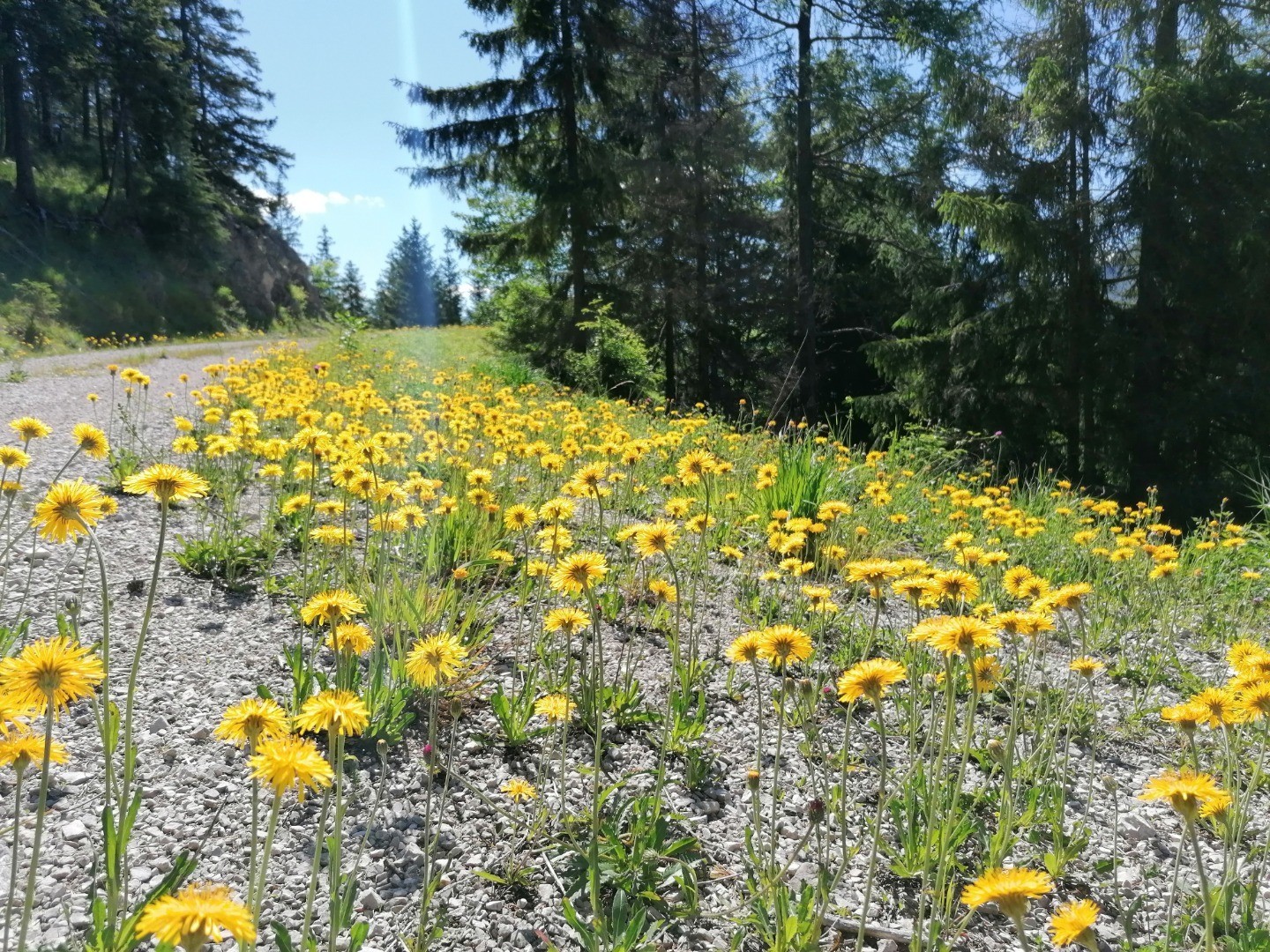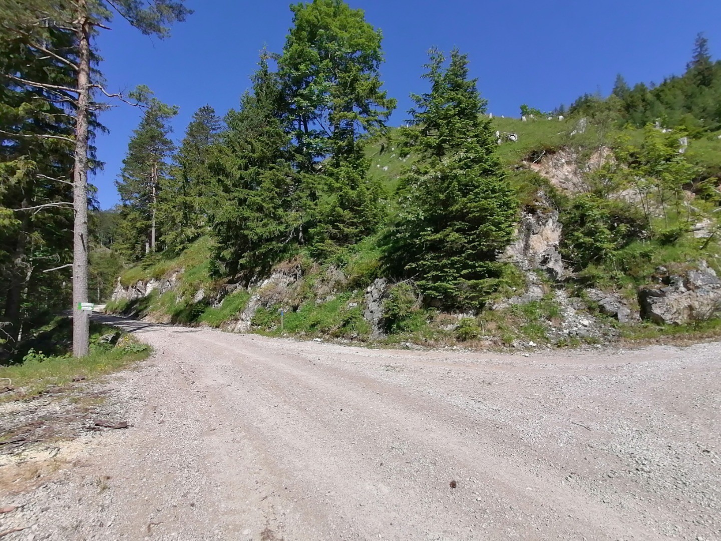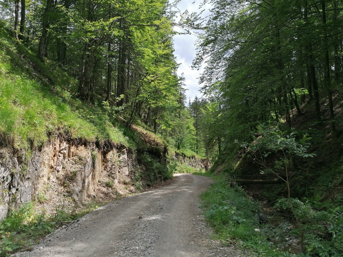 Die folgenden Kilometer führt uns die Schotterstraße mal mehr, mal weniger sanft den Berg entlang immer höher. Dem schwarz-gelben Feuersalamander, dem schwarzen, kleineren Alpensalamander, Blindschleichen, Ringelnattern und sogar Kreuzottern können wir hier begegnen. Also Augen auf im Straßenverkehr!