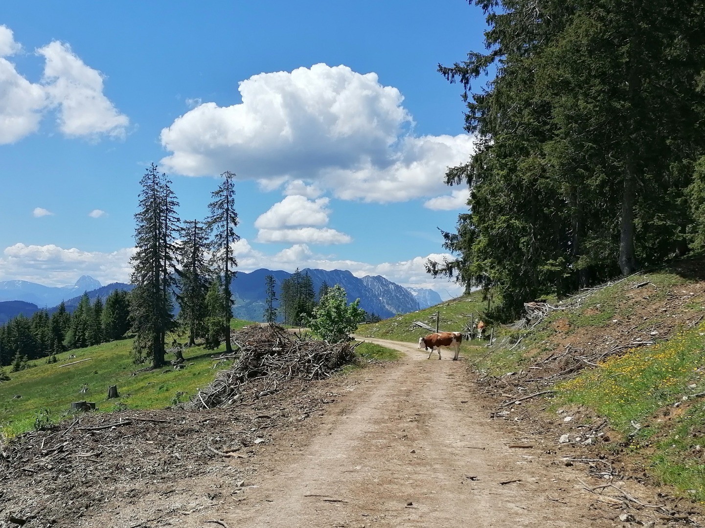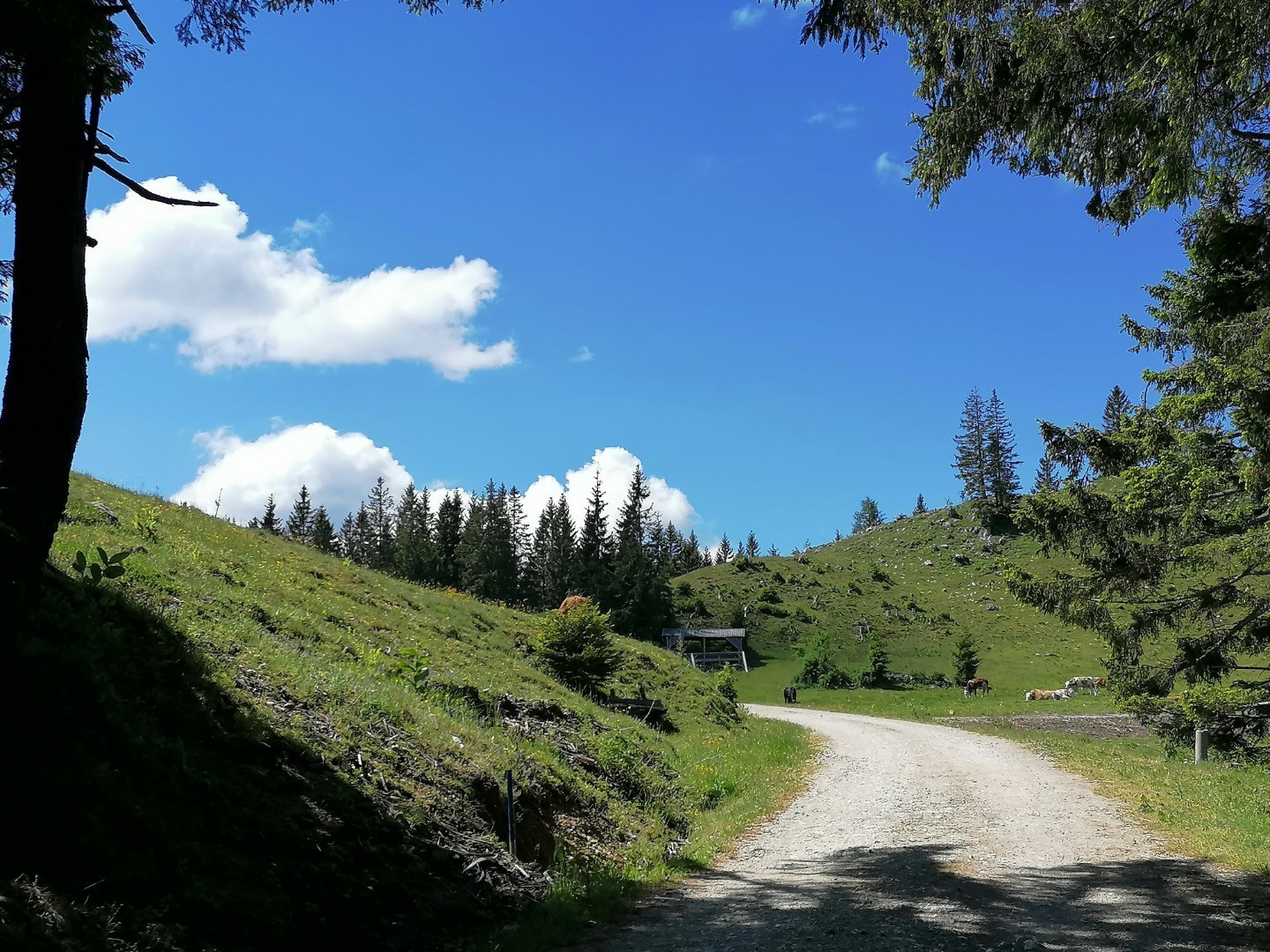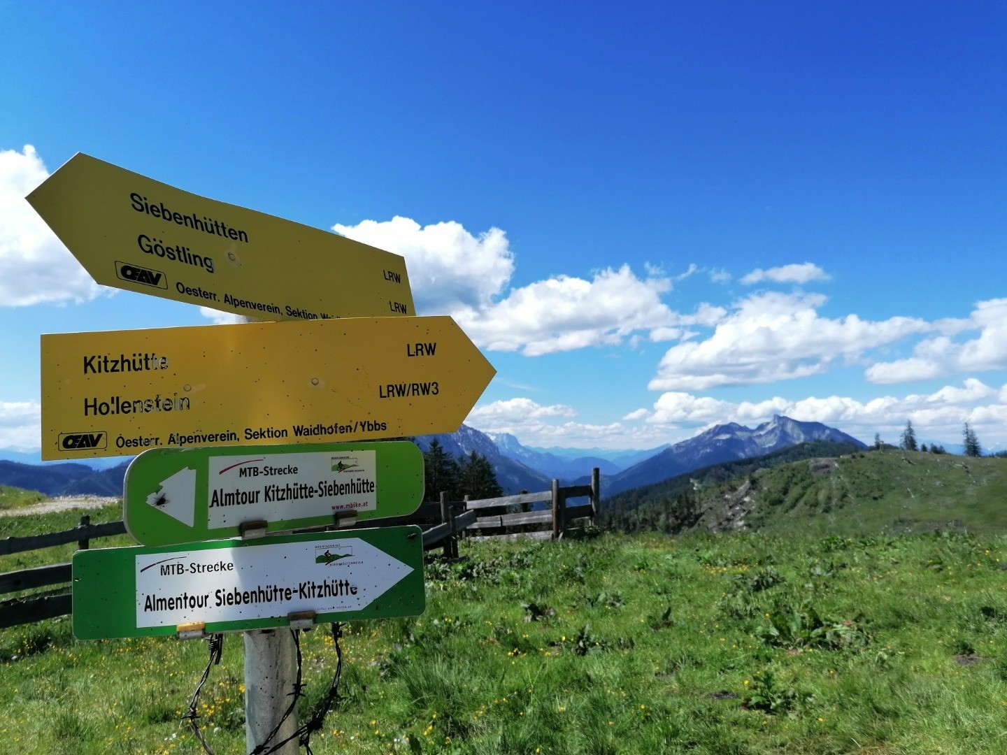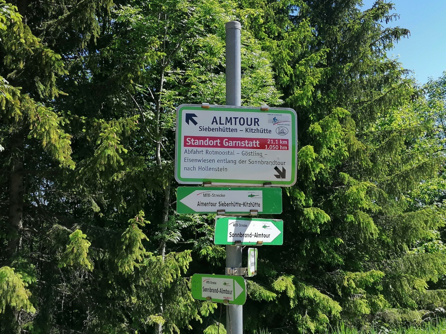 Genau bei Kilometer 20 gelangen wir nach weiten Blicken ins Alpenland an eine weitere Kreuzung. Diesmal orientieren wir uns am Schild „Almentour Siebenhütte-Kitzhütte“.