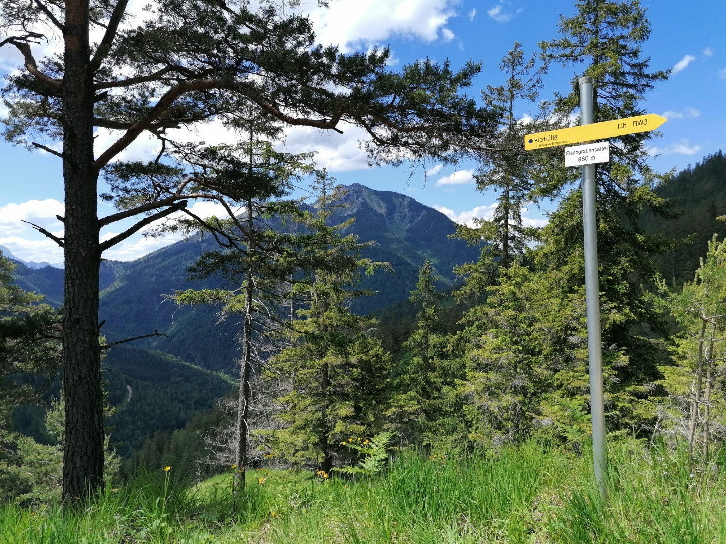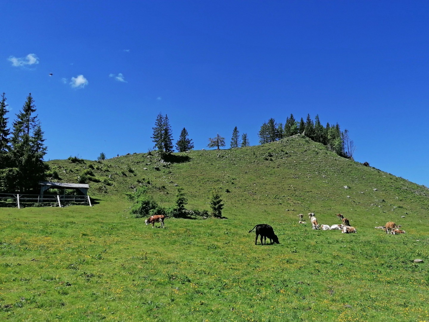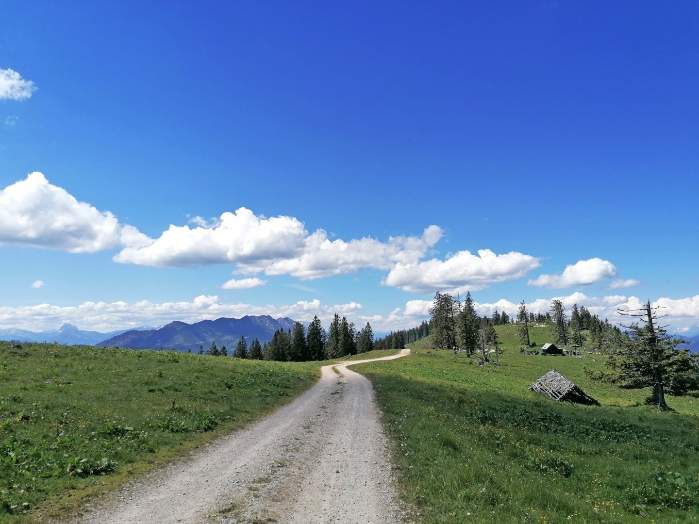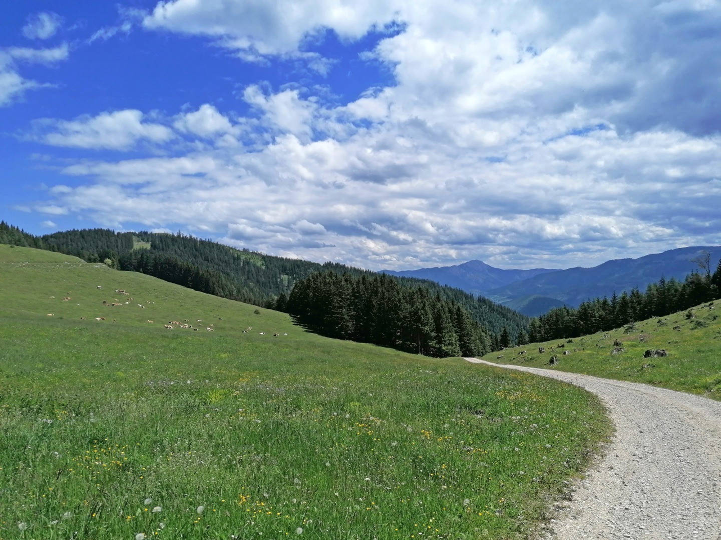 Genau bei Kilometer 20 gelangen wir nach weiten Blicken ins Alpenland an eine weitere Kreuzung. Diesmal orientieren wir uns am Schild „Almentour Siebenhütte-Kitzhütte“.