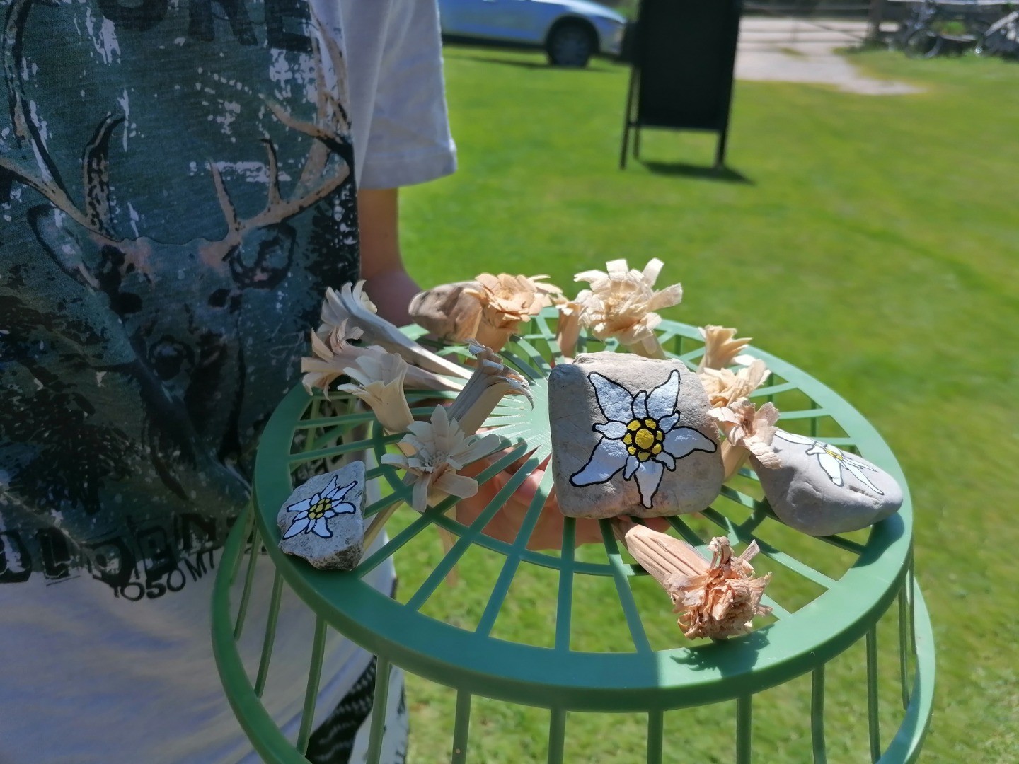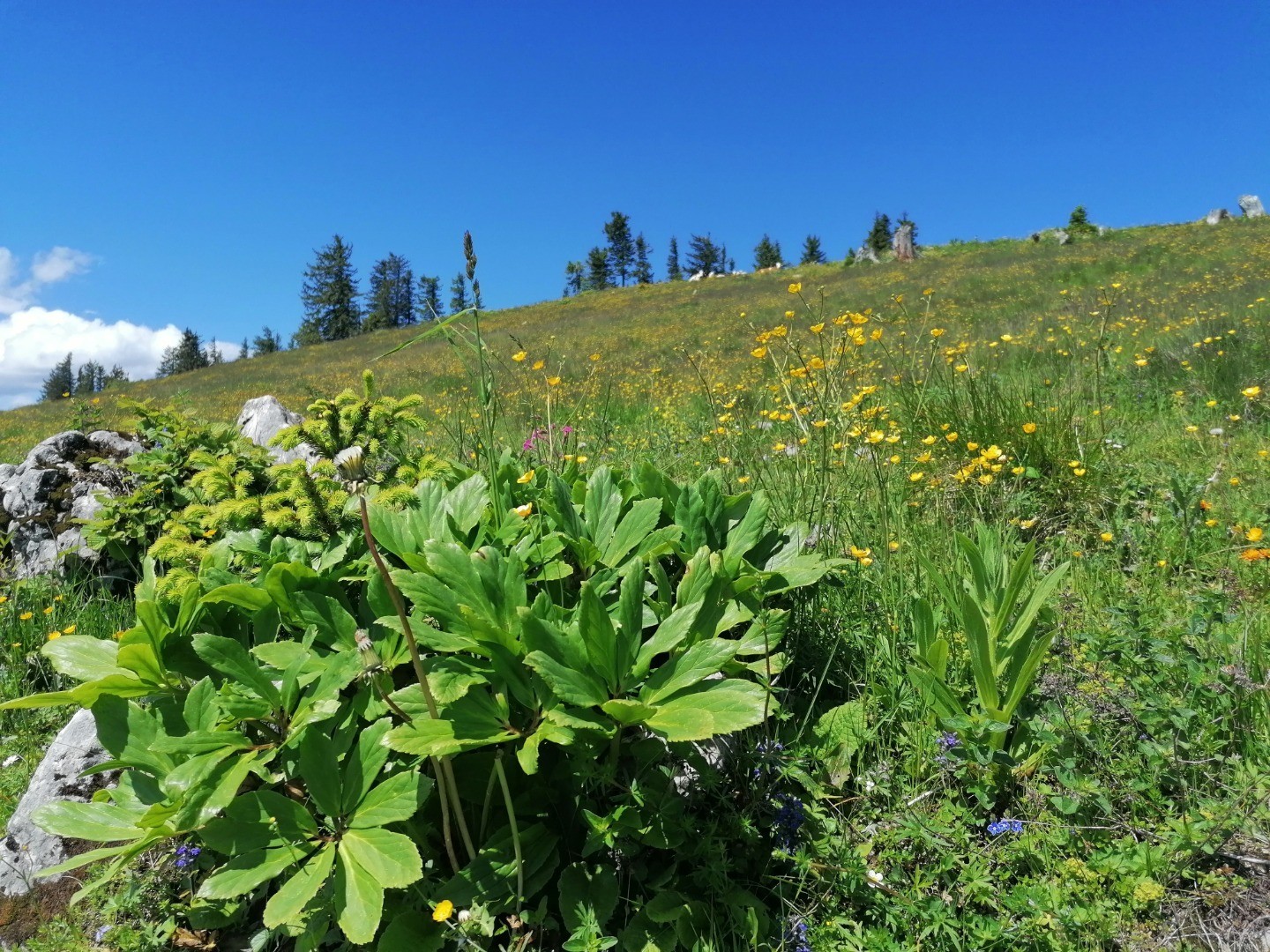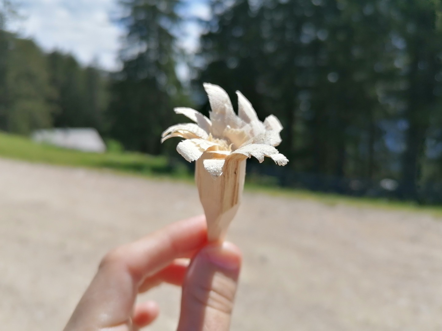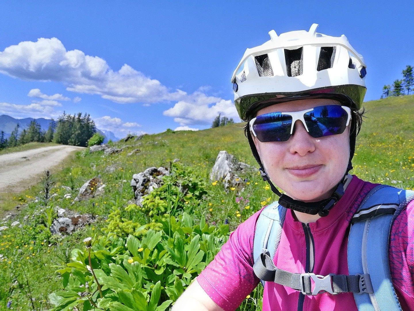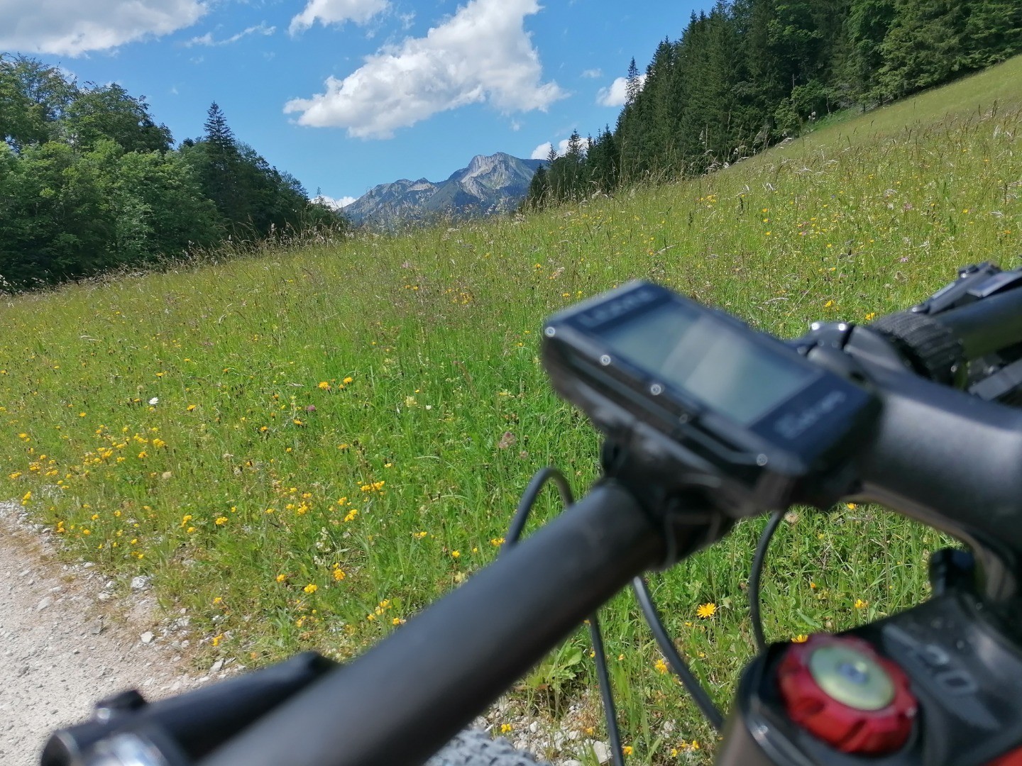 Gut verköstigt und mit einem liebevollen Blumengeschenk vom "Nachwuchs-Hoida" schwingen wir uns zum letzten Mal in den Sattel und rollen von der Hütte weg rechts bergab. Wir queren eine herrlich weite Almwiese und schlängeln uns dann bergab. Vorsicht Gegenverkehr: Auch hier sind viele Biker bergauf in Richtung Hütte unterwegs!