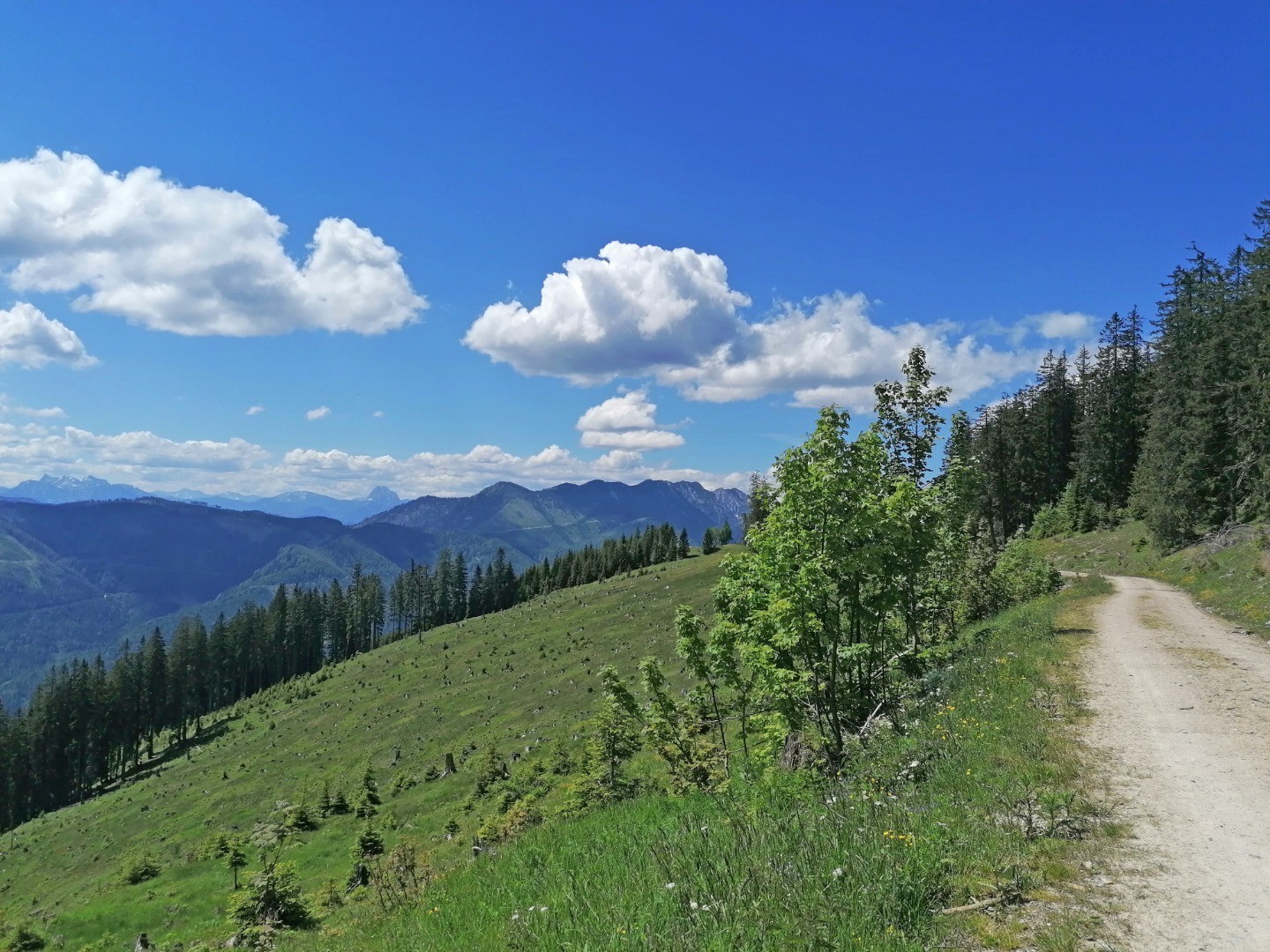 Wir rollen über den Eisgrabensattel mit Blick auf die Voralpe hinweg so lange bergab, bis wir die Talsohle erreichen und uns ein kleiner Anstieg zurück auf die Promau bringt. Diesen Abschnitt kennen wir bereits. Nun lassen wir unser Bike einfach laufen… Flussabwärts den Bach entlang erreichen wir schließlich wieder das Siedlungsgebiet und rollen gemütlich am Parkplatz ein.