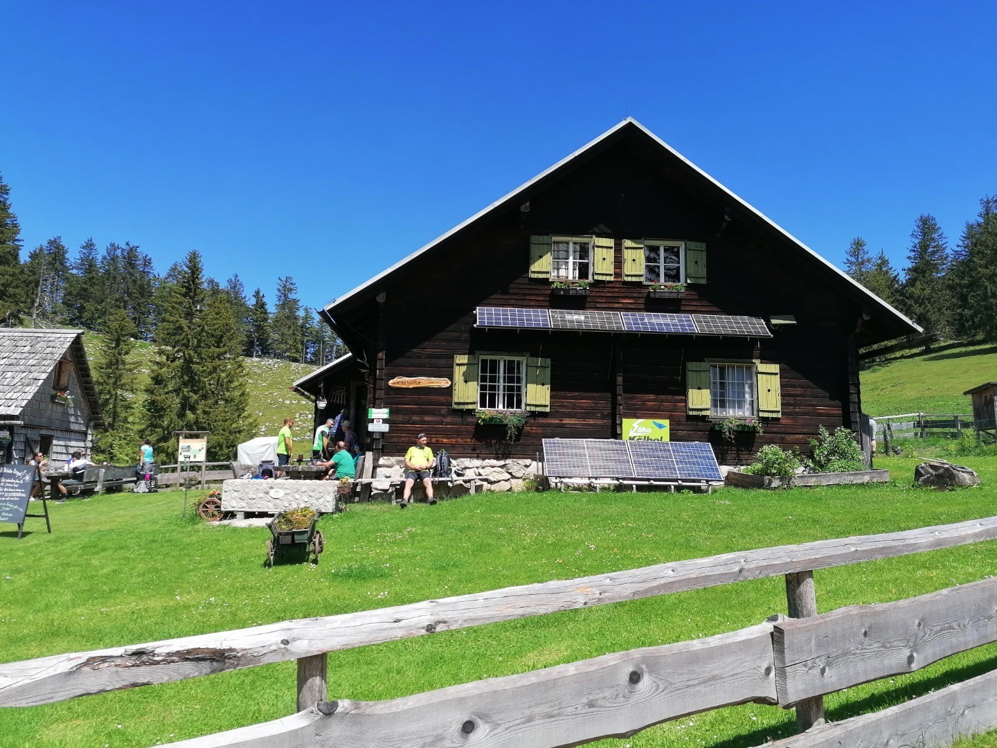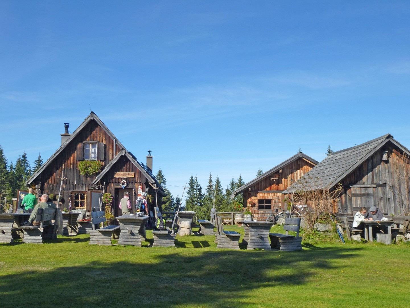 Etwa einen Kilometer vor der Göstlinger Siebenhütten-Alm (einer Hüttenansammlung von sieben Hütten) steigt es nun merklich steil an. Doch wie gesagt: Es geht hier nur um EINEN Kilometer, bevor wir das lohnende erste Ziel erreichen. Wer will, schwingt sich nun vom Sattel und auf eine der sonnigen Bänke vor der urigen Hütte.