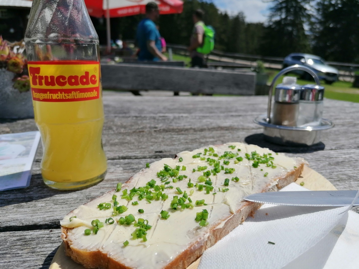 Der Wegweiser zeigt uns den Pfad zur Kitzhütte, die wir nach einem kleinen Single-Trail-Ritt und 300 Metern Forststraße erreichen. Geschafft! Nun ist spätestens der Einkehrschwung angesagt, denn von nun an geht’s – ein Mini-Anstieg zurück zur Promau ausgenommen – nur noch bergab. Ob Butterbrot oder Mehlspeise, Schafkäse oder ein typisches Schmalzbrot – jetzt heißt es erst mal Kraft tanken!