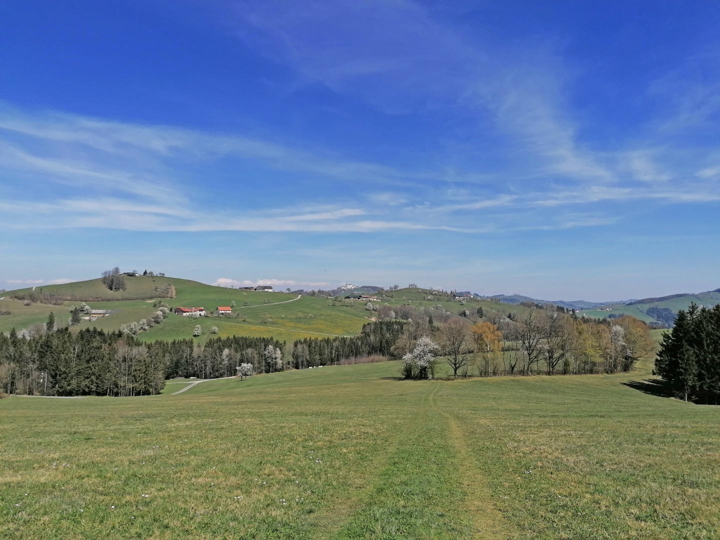 Die erste Hürde ist geschafft, doch der nächste Anstieg lässt nicht lange auf sich warten. Eine Forststraße führt uns höher und verheißt schon bald den nächsten Blick über Waidhofen. Wer den richtigen Zeitpunkt erwischt, genießt außerdem die Mostbaumblüte. Sie zeigt sich praktisch den ganzen folgenden Weg bis nach Konradsheim.
