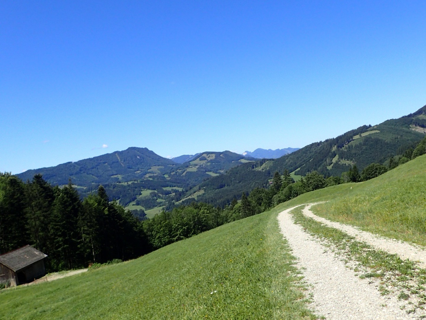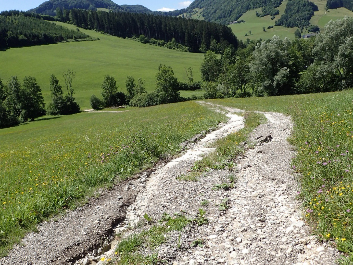 Wir überqueren das Plateau, schließen das Weidetor und gelangen schon bald auf einen asphaltierten Güterweg, der uns geradewegs ins Tal führt.