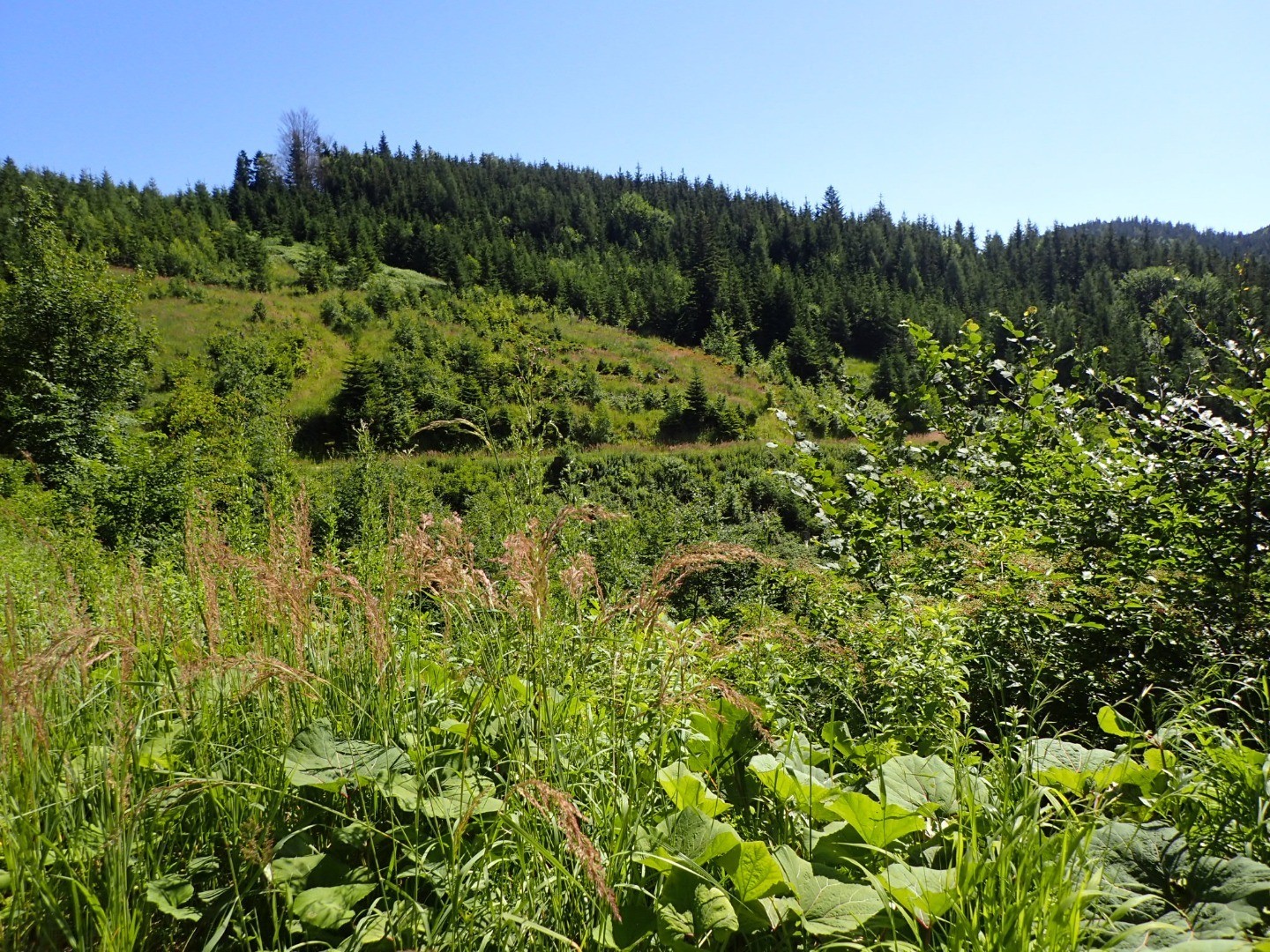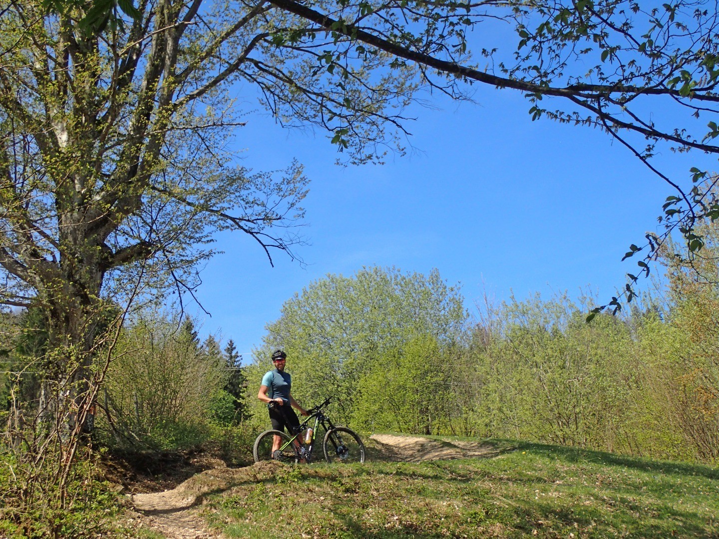Wir schrauben uns zwischen Wald und Wiesen hoch und folgen dem schmaler werdenden Weg zwischen Häusern hindurch etwa bei Kilometer 30 auf die Alm. Erste Parallelen zu den Alpen tun sich hier auf, besonders wenn das freundliche Fleckvieh uns Mountainbiker begutachtet.