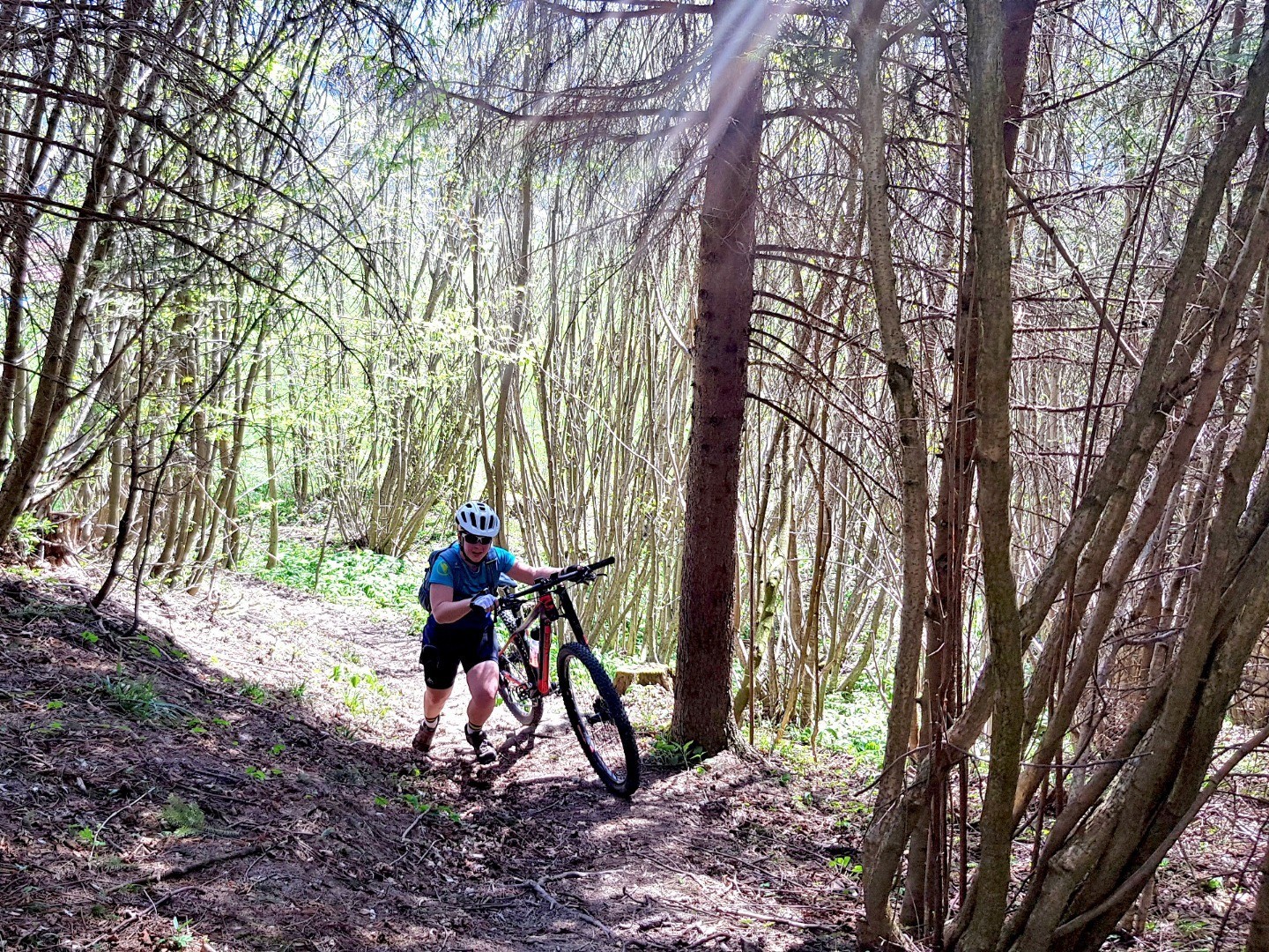 Nun aber steigt es ordentlich an, bevor wir wieder in eine kurze Schiebestrecke bergauf – sprich Wanderweg – gelangen.