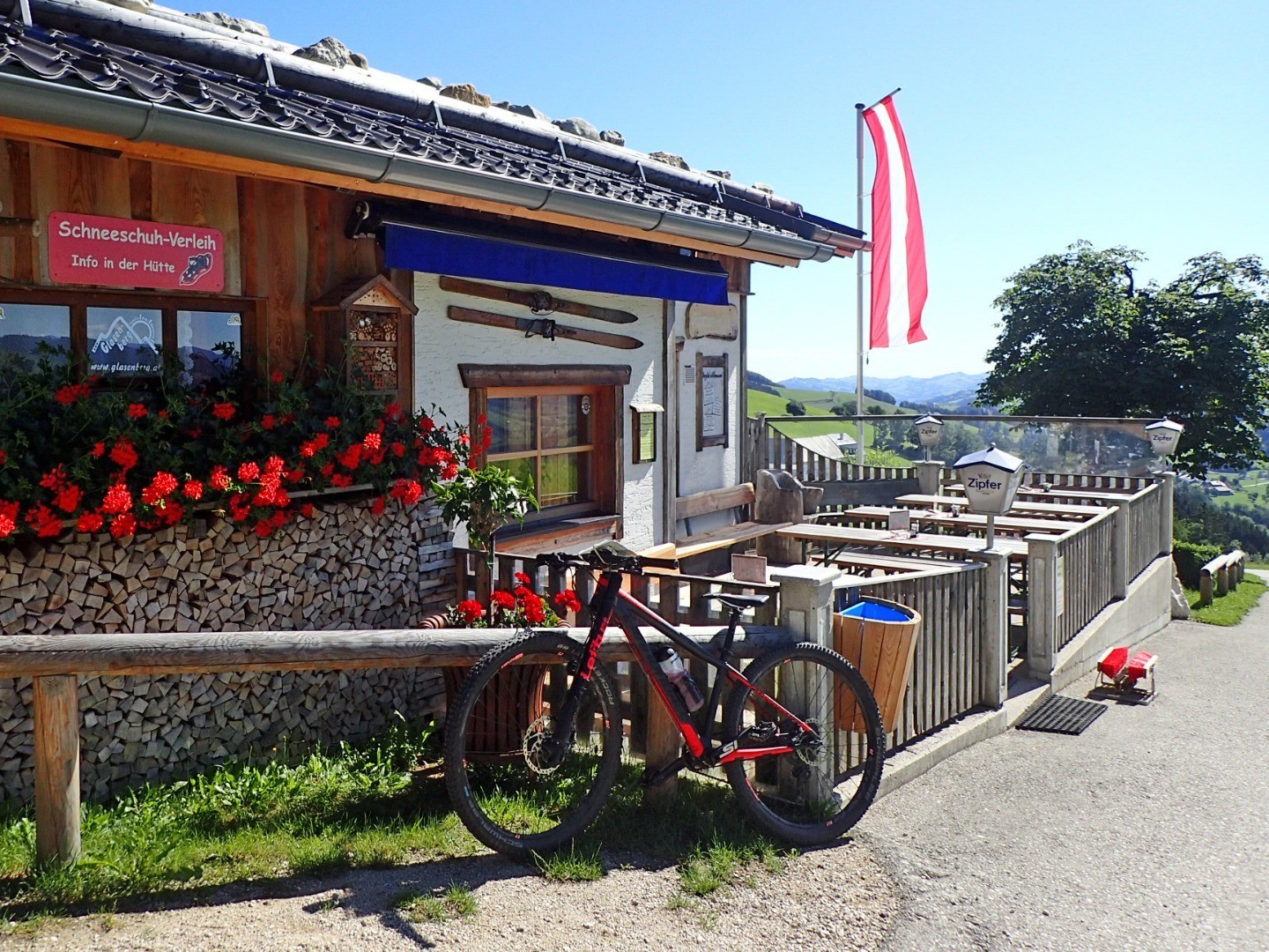Auf der sonnigen Terrasse der Glasner Hütte tummeln sich Wanderer und Mountainbiker. Die einen kommen vom Ennstal rüber, die anderen vom Gemeindegebiet St. Peter oder, so wie wir, vom Ybbstal hier herauf.