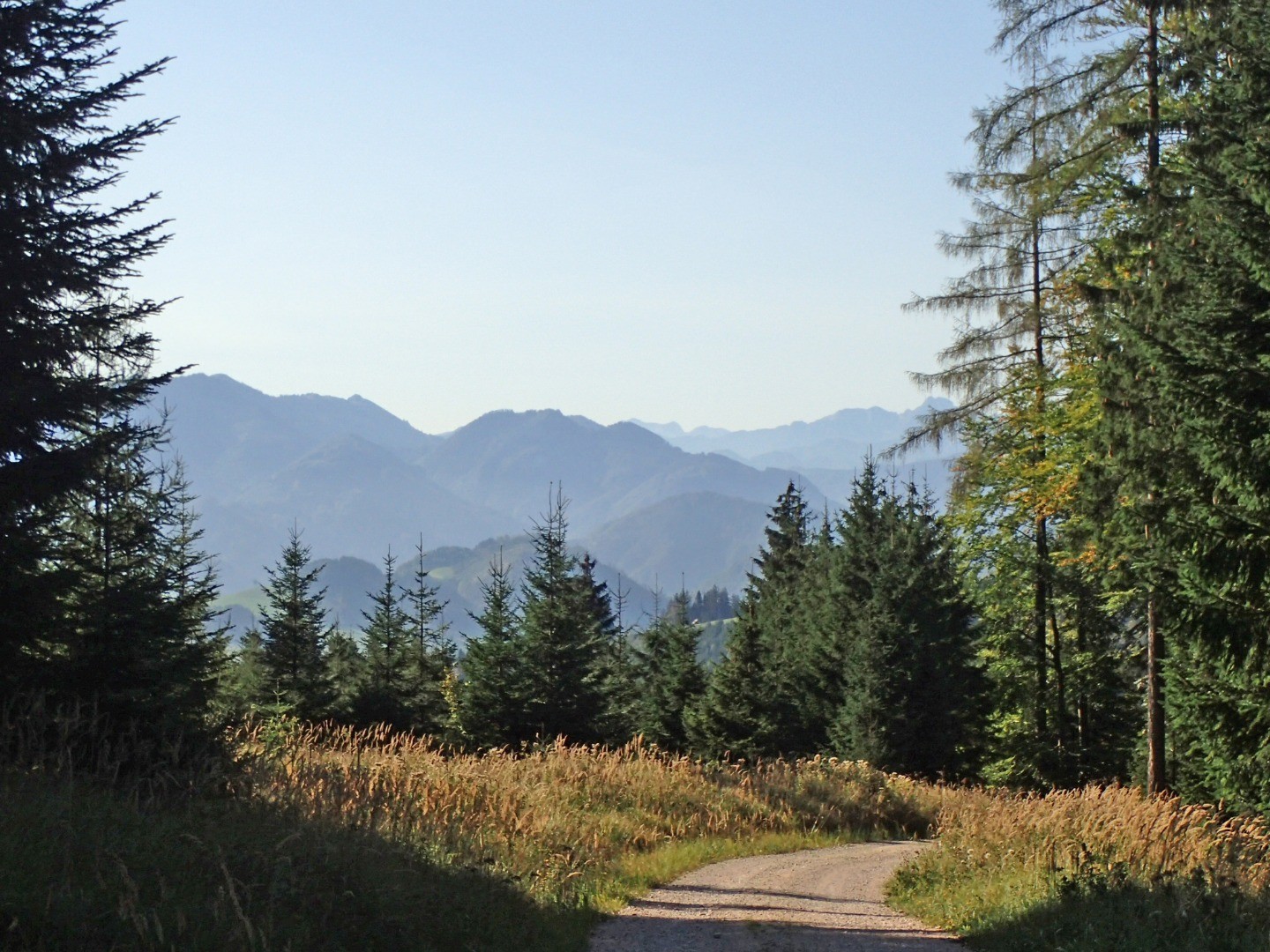 Doch keine Angst, es folgen nun einige Asphaltkilometer bergauf beziehungsweise hangparallel am Weg Richtung Kreuzgruberhöhe. Unterhalb des Freithofbergs folgen wir dem Güterweg Moosgraben und Forstwegen, wobei unser Blick immer wieder in Richtung Ennstaler Alpen und Nationalpark Kalkalpen schweift.