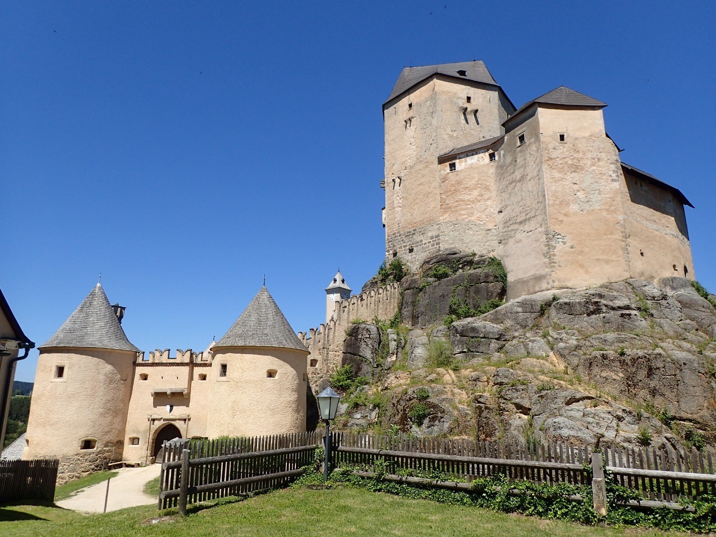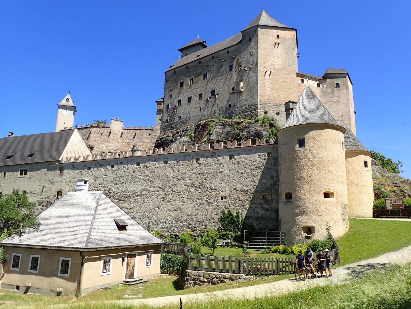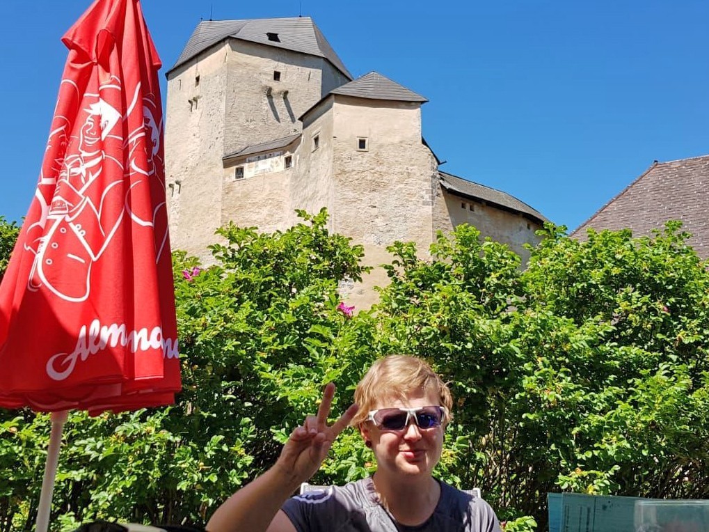 Die letzte Führung ist vor 10 Minuten gestartet und so machen wir es uns bei der Burgtaverne mit Blick auf eine der besterhaltensten Burgen Österreichs gemütlich.