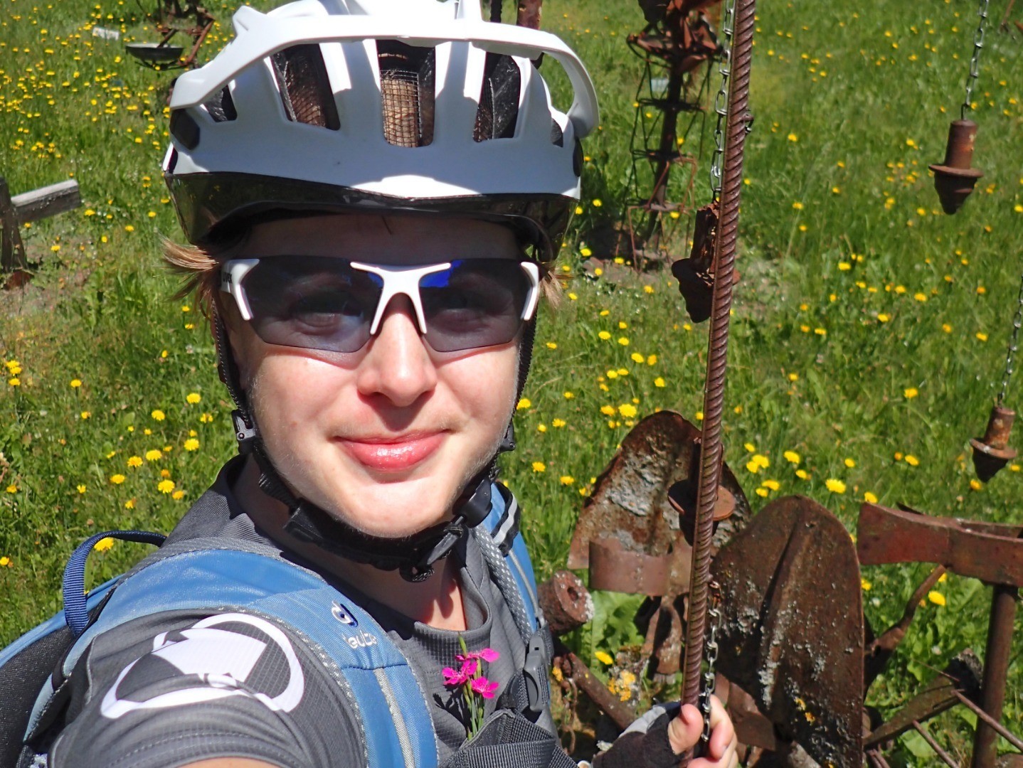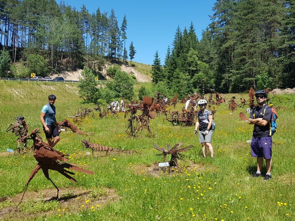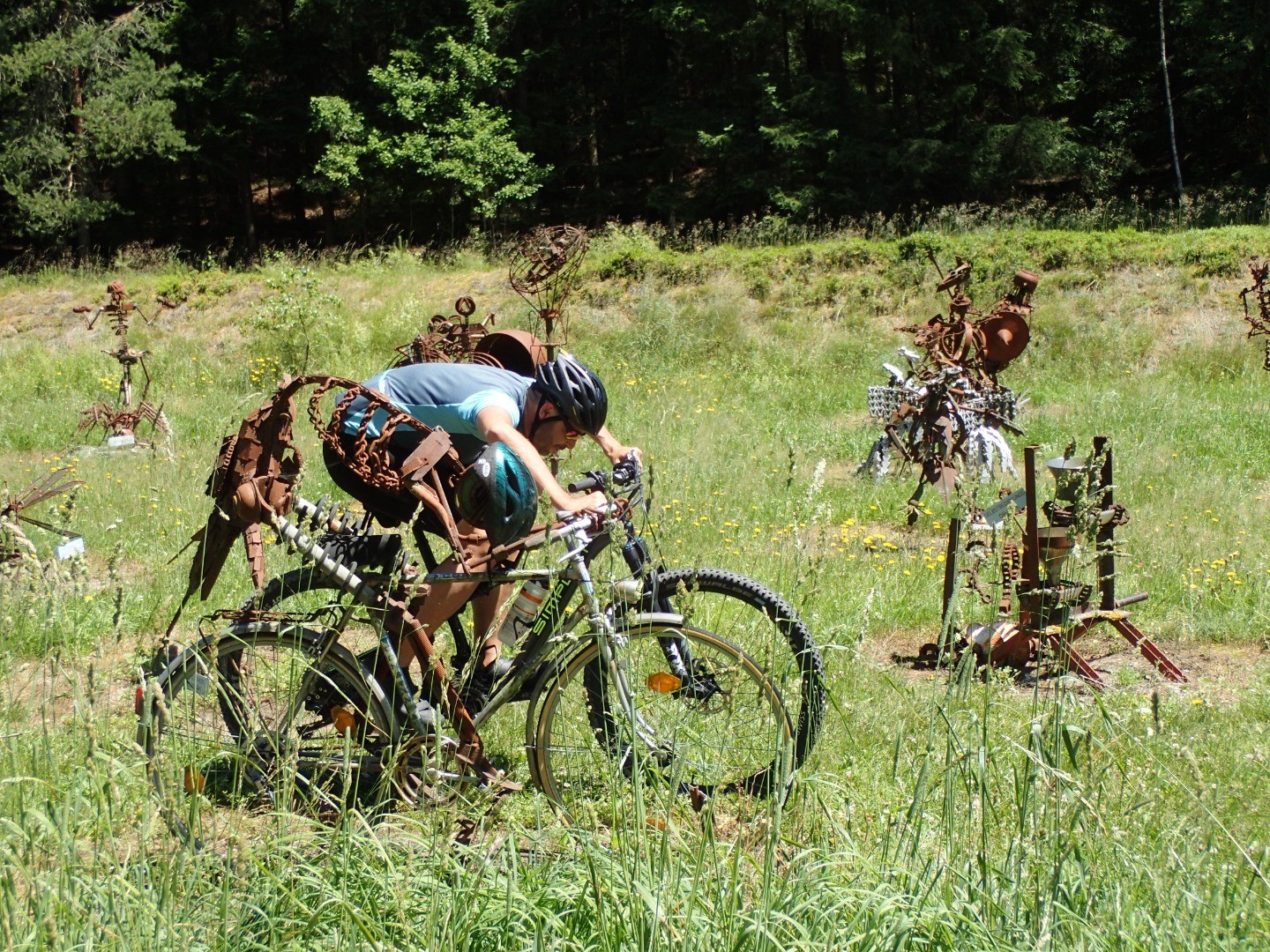 Vor uns liegt nun ein herrlich sanfter Wald- und Trailabschnitt. Der “Steinpilz-Strecke” folgend sammeln wir in Richtung Norden nun Höhenmeter. Beim Knappenhof angelangt halten wir uns links und erreichen nach ein paar hundert Metern Bundesstraße einen beeindruckenden Skulpturenpark. Der hiesige Künstler Helmuth Hammel präsentiert unter dem Motto "Kunst zwingt Rost" an die 200 Figuren, deren Benennung (mittels Namenstafeln) und Ausfertigung (mit Liebe zum Detail) durchaus zum Nachdenken einladen.