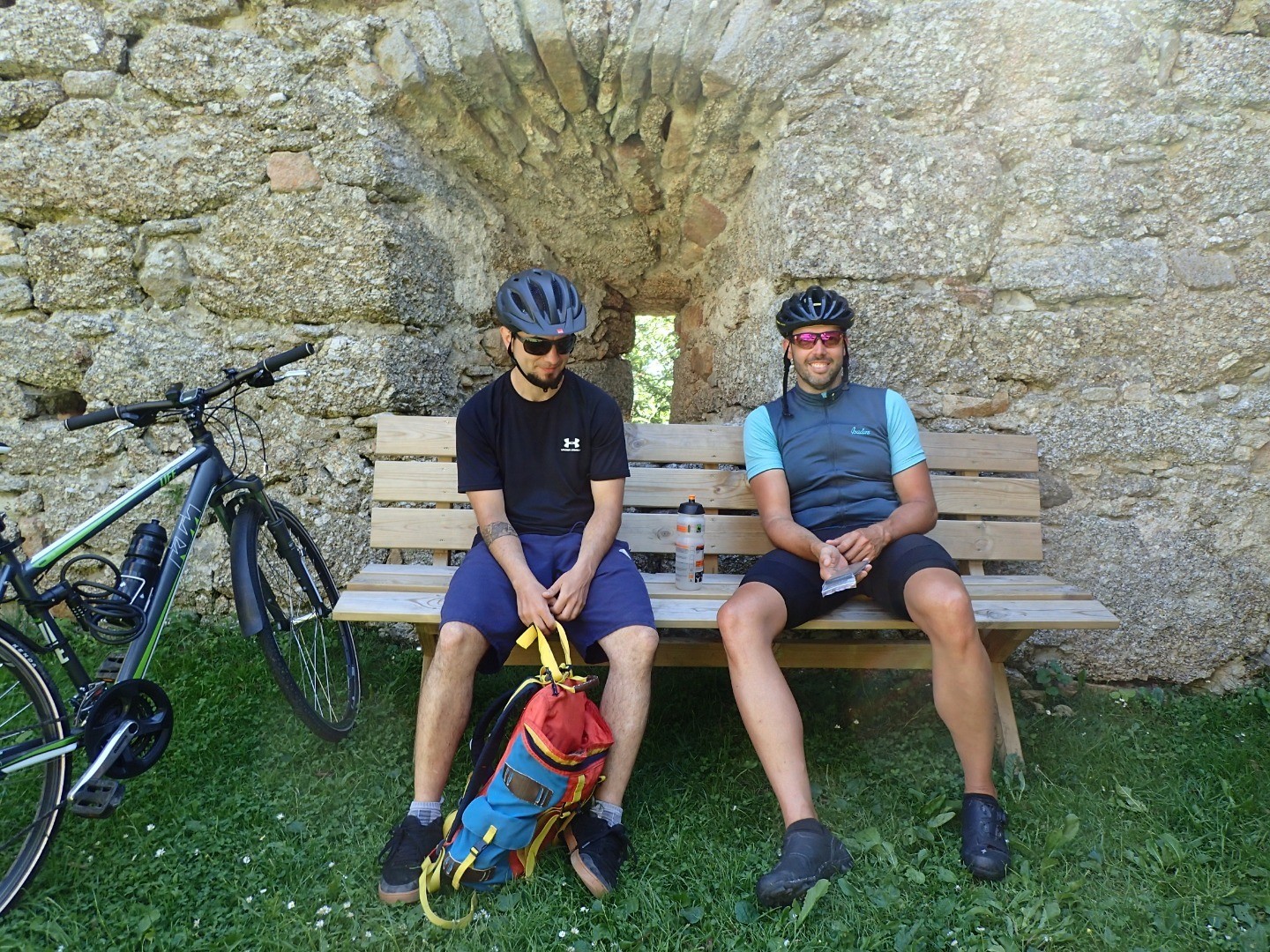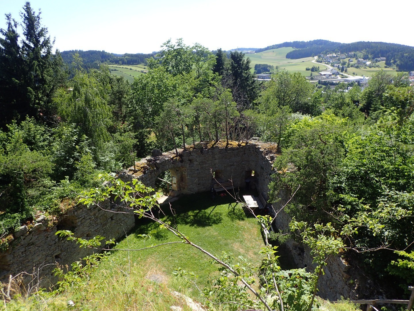 Die Aussichts-Ruine Arbesbach liegt nun unweit vor uns und wir kurbeln bei mittlerweile über 30 Grad die kaum befahrene Straße Richtung Westen. Ein kleiner, feiner Trail führt südlich unterm Schlossberg hinweg und spuckt uns unter der Ruine wieder aus. Der wildromantische Hof nimmt unsere Bikes auf und die Bänke und schattenspendenden Bäume rufen erst mal: Pause!