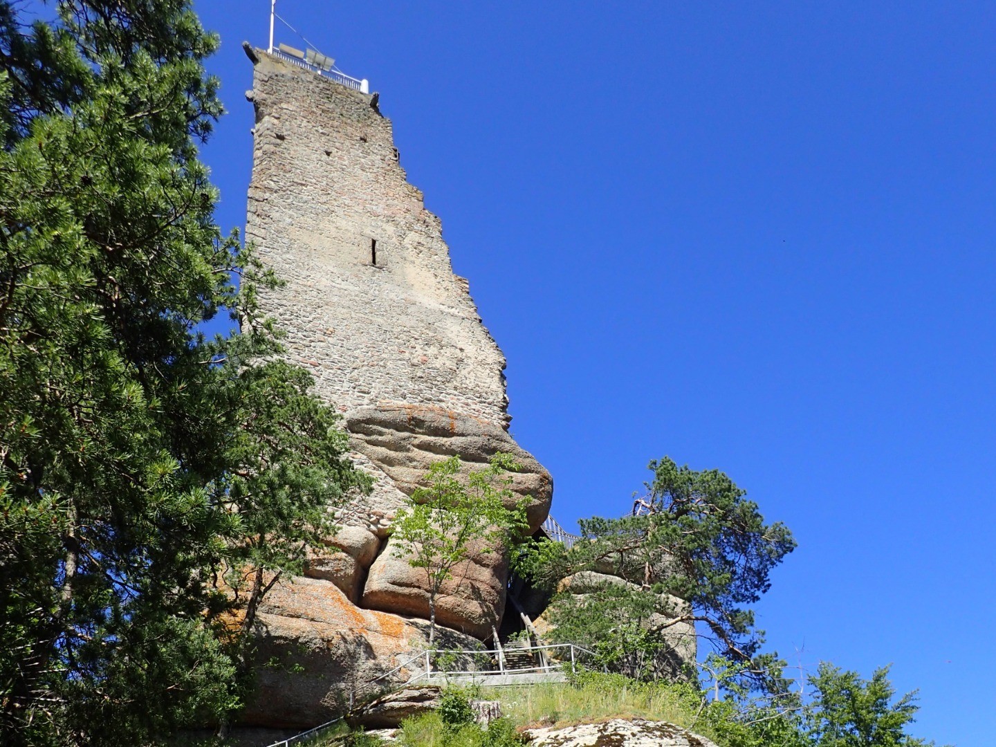 Der Schlüssel zur Ruine ist in der örtlichen Bäckerei erhältlich. Wir verzichten jedoch darauf (in Wahrheit will jetzt niemand runterfahren und den Schlüssel holen) und schauen einfach, wie hoch hinaus wir ohne Schlüssel kommen.