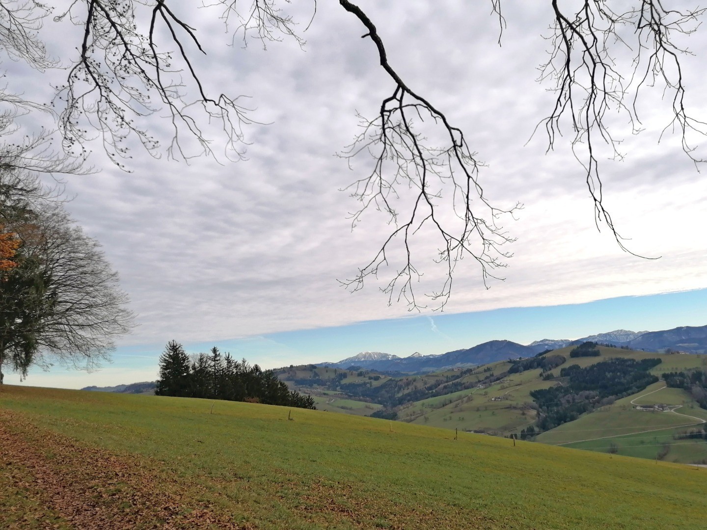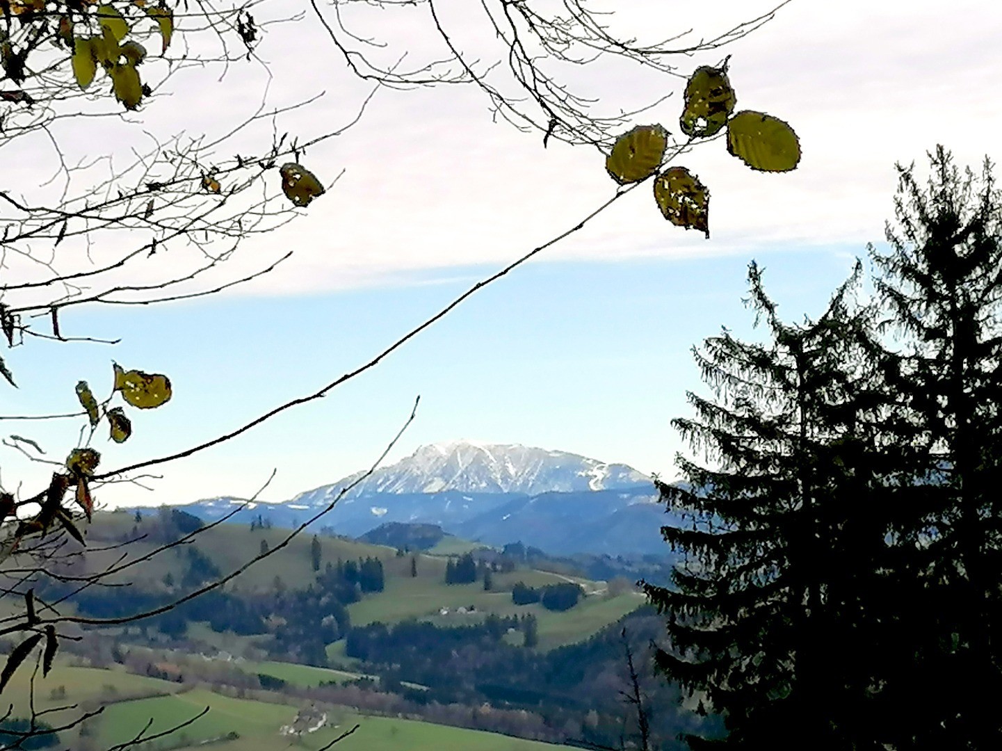 Wir gelangen zurück auf die asphaltierte Höhenstraße, lassen eine kleine Senke hinter uns und biegen nach etwa 300 Metern schon wieder links ein, um noch ein Stückchen Wald und Ötscherblick zu genießen.