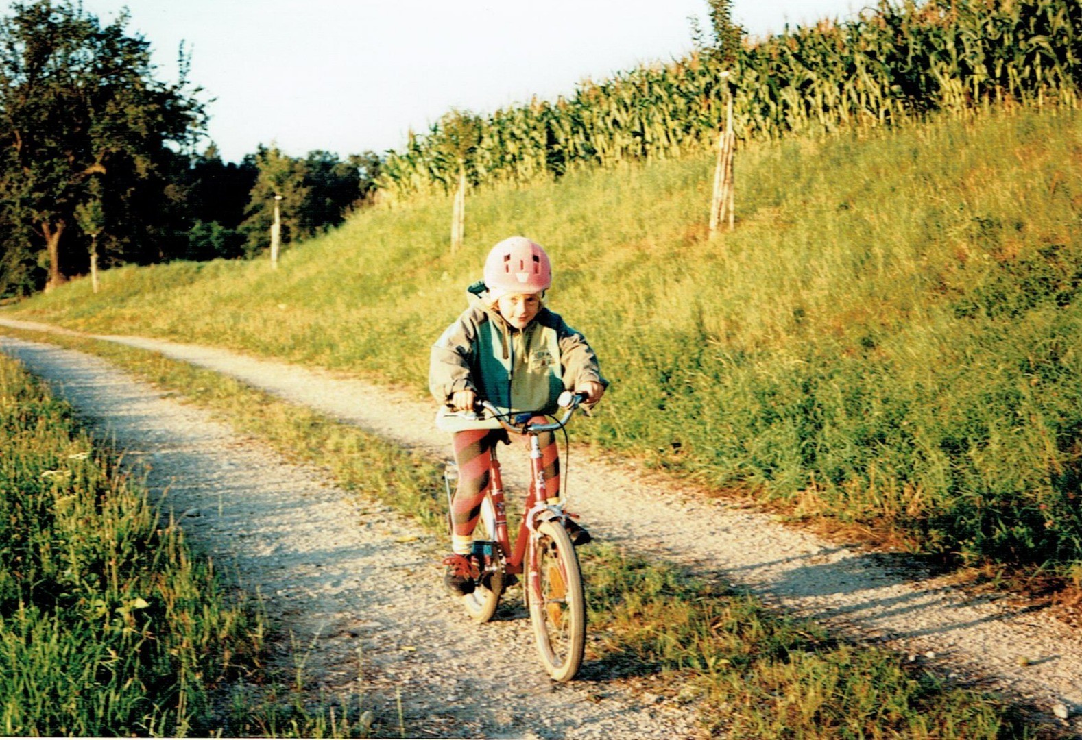 Mit sechs Jahren, kurz vor meinem siebten Geburtstag, bekam ich mein erstes Mountainbike. Marke Trek, Farbe Pink. Ich liebte es, mit auf den Wald- und Wiesenwegen zu fahren, auch wenn ich bergauf noch so manch helfenden Schubs brauchte.